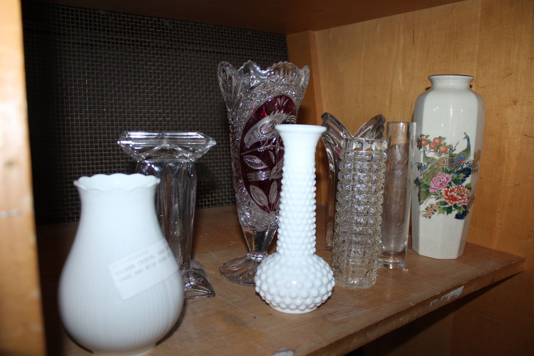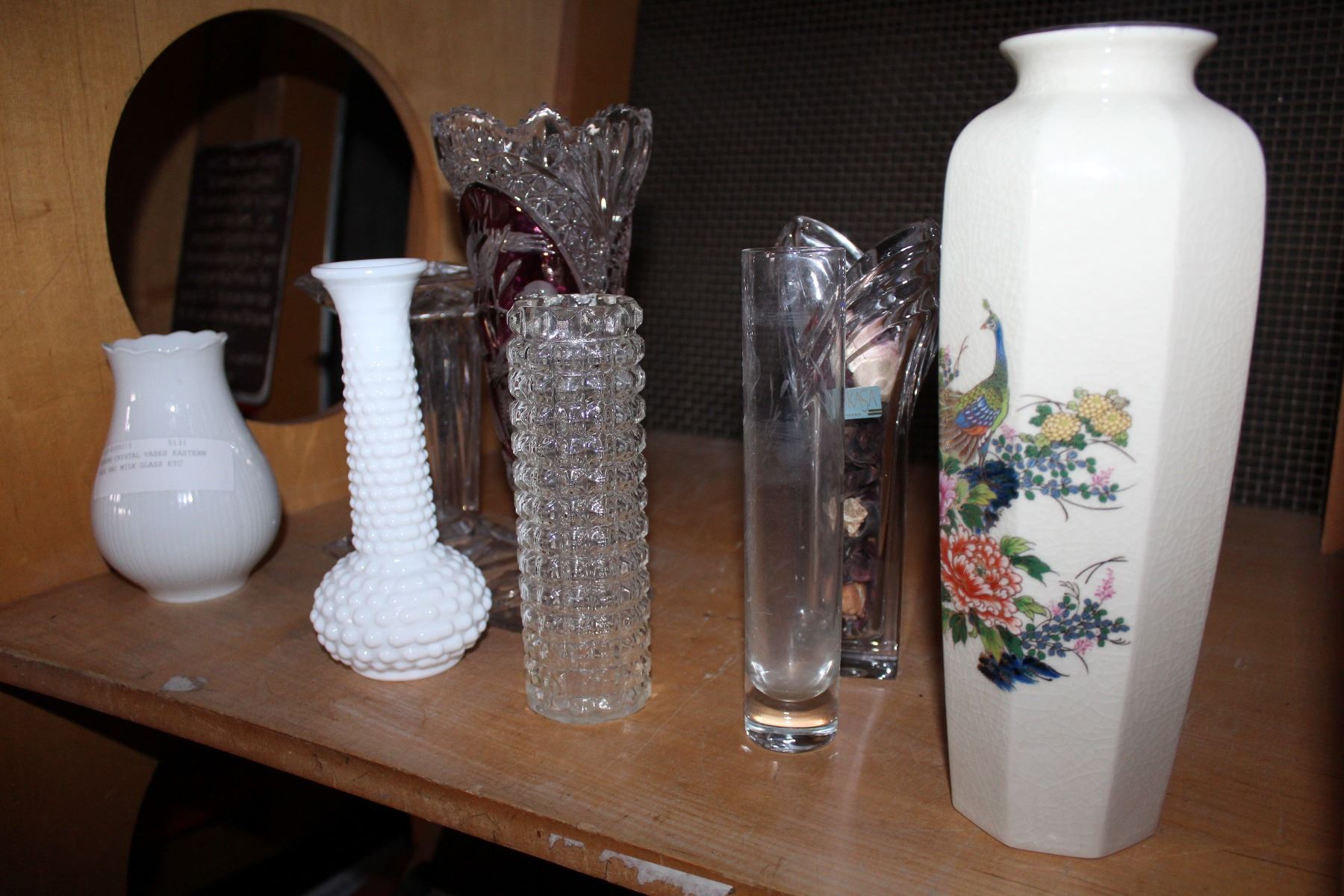MODERN CRYSTAL VASES EASTERN VASE AND MILK GLASS ETC