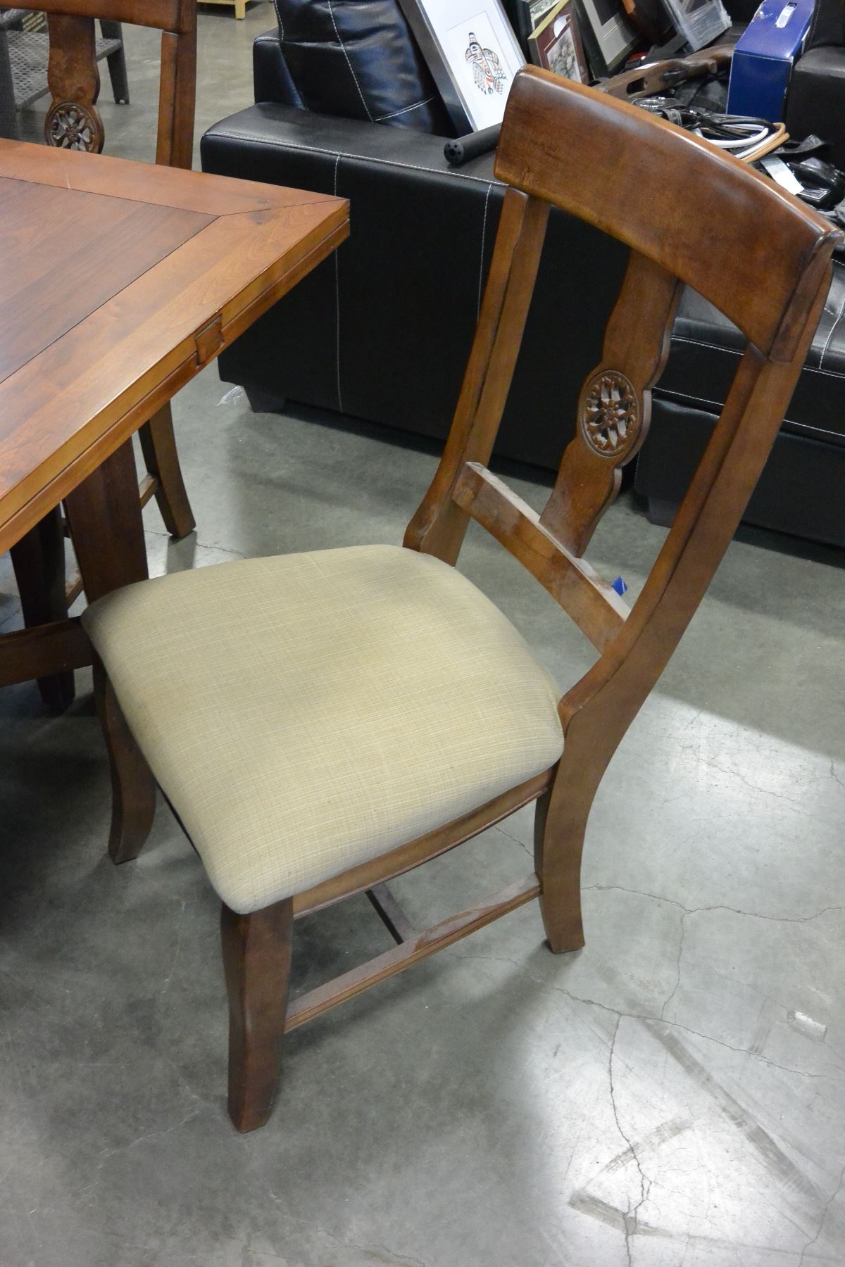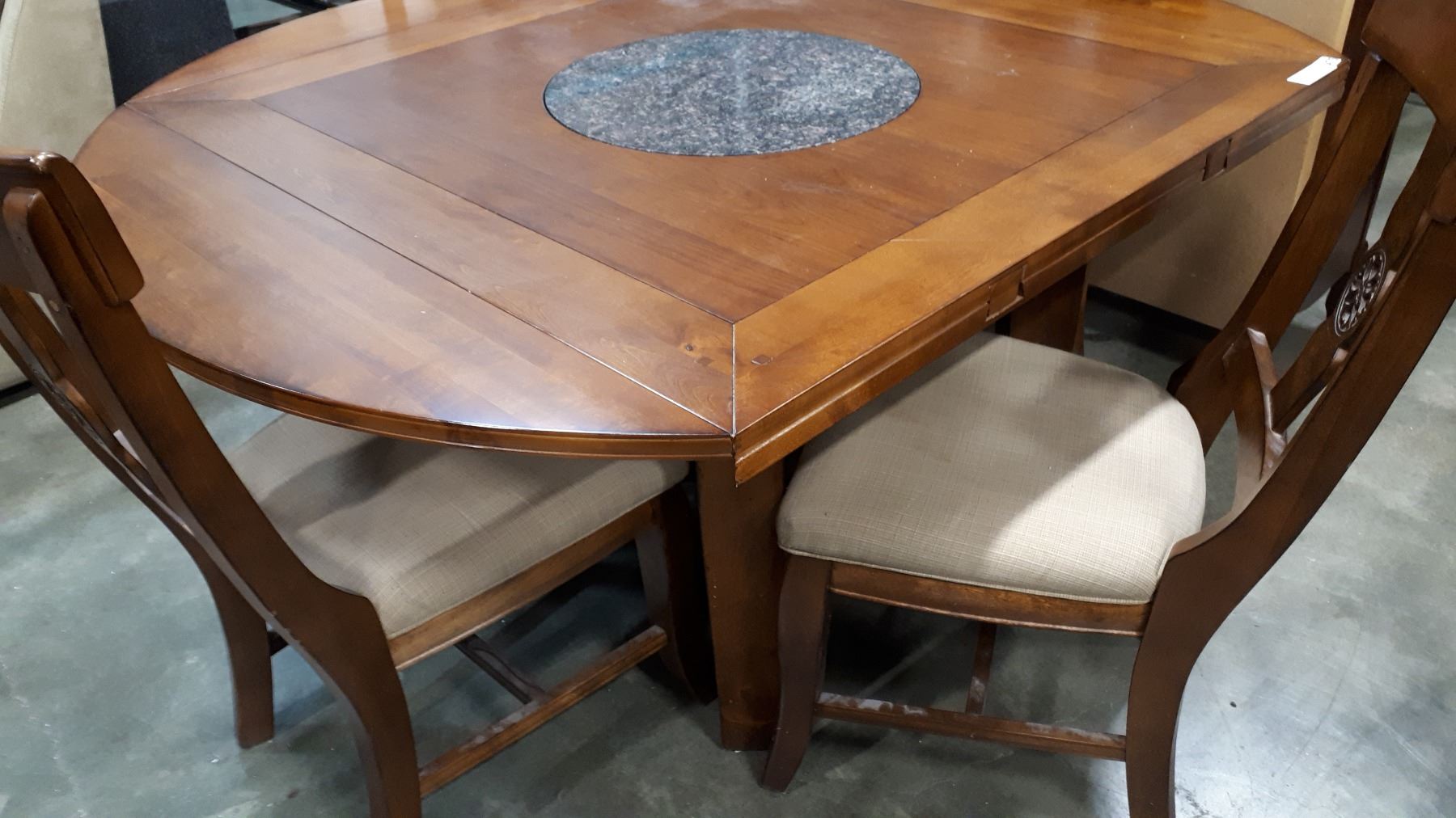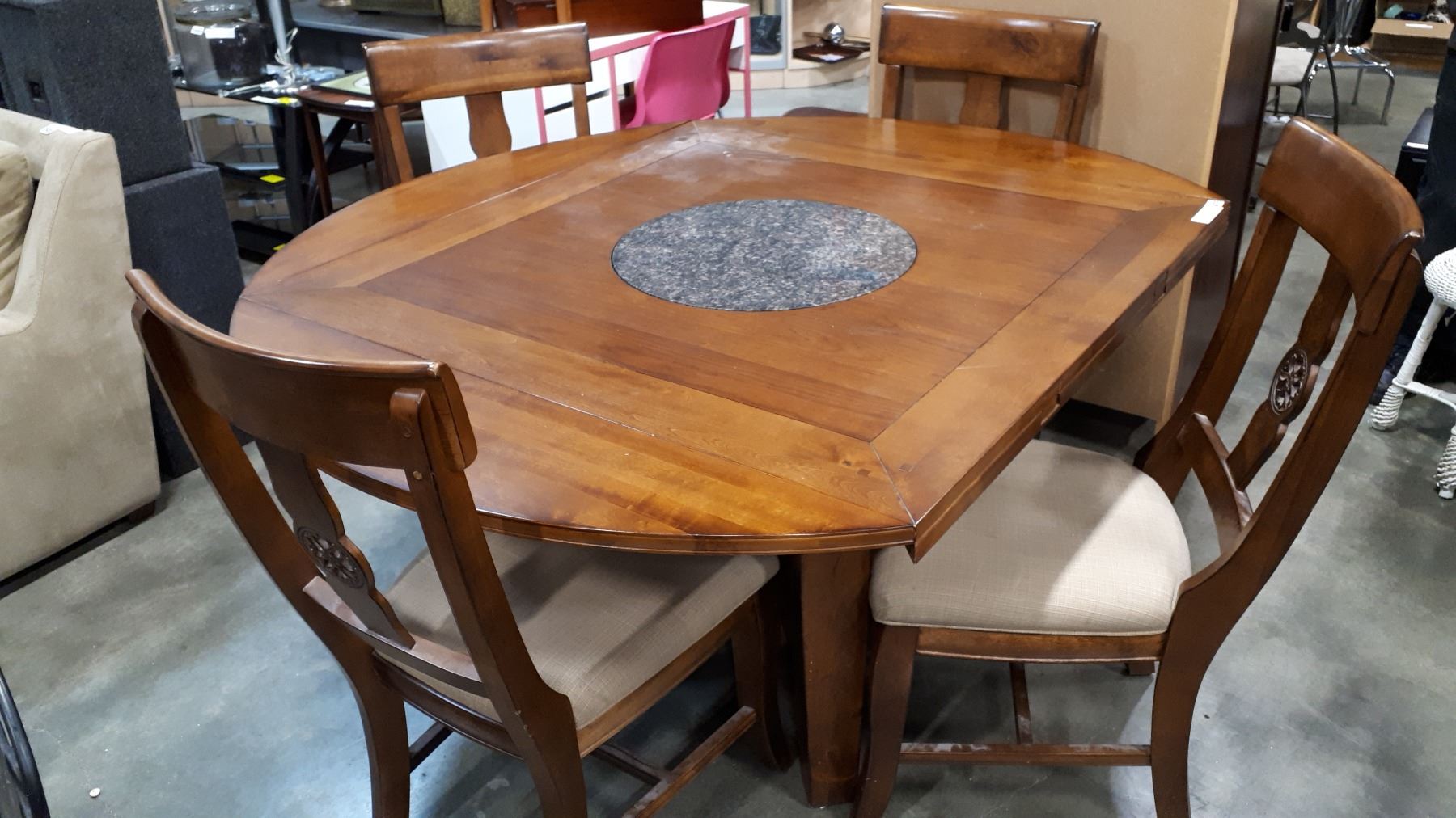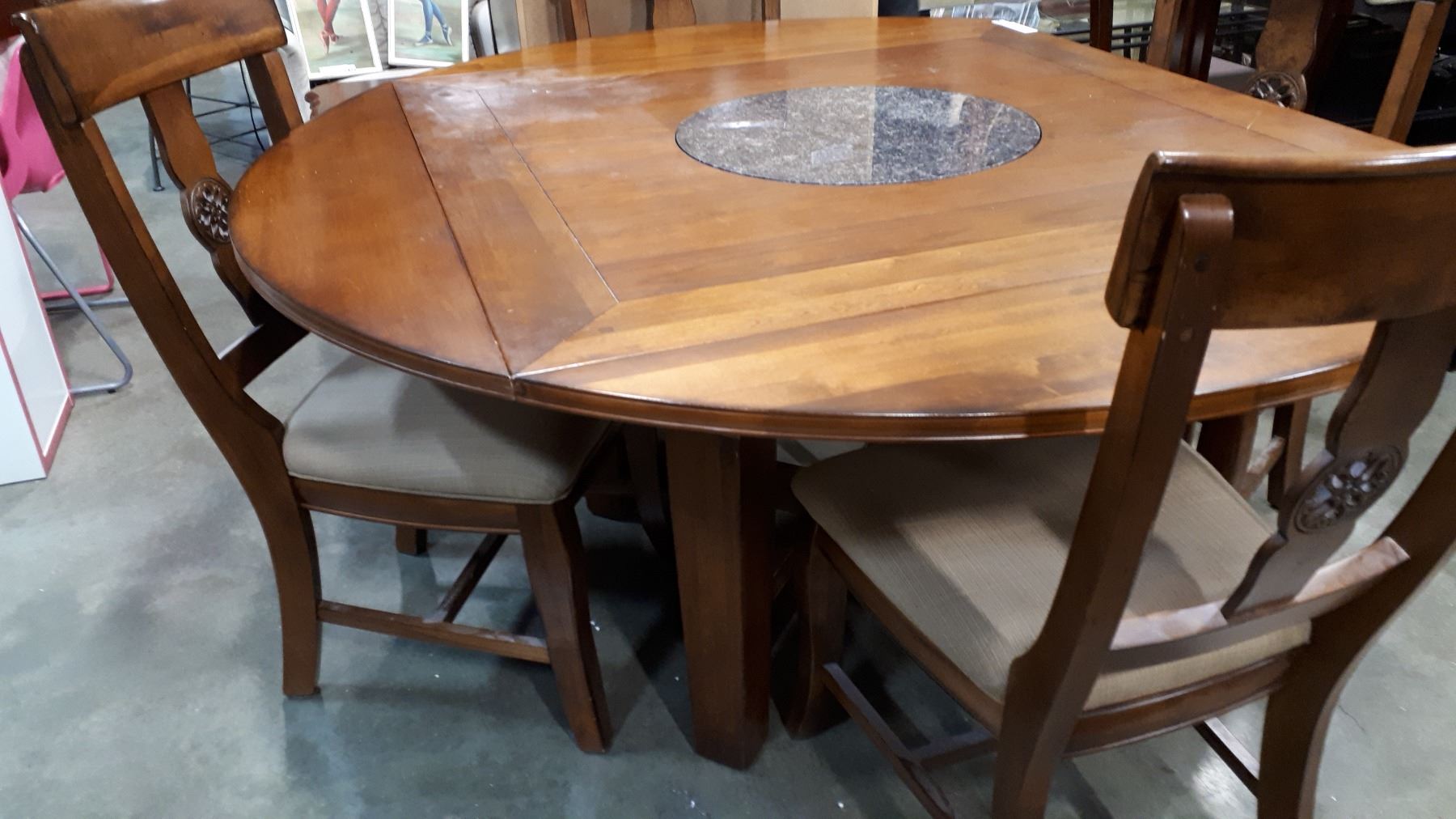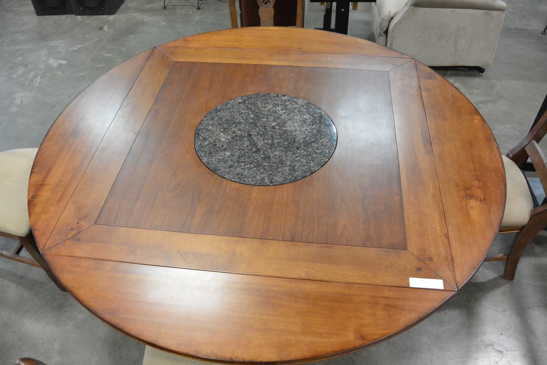 MODERN DINING TABLE W/ BUILT IN STONE LAZY SUZAN, FLIPOUT LEAFS, AND 4 CHAIRS