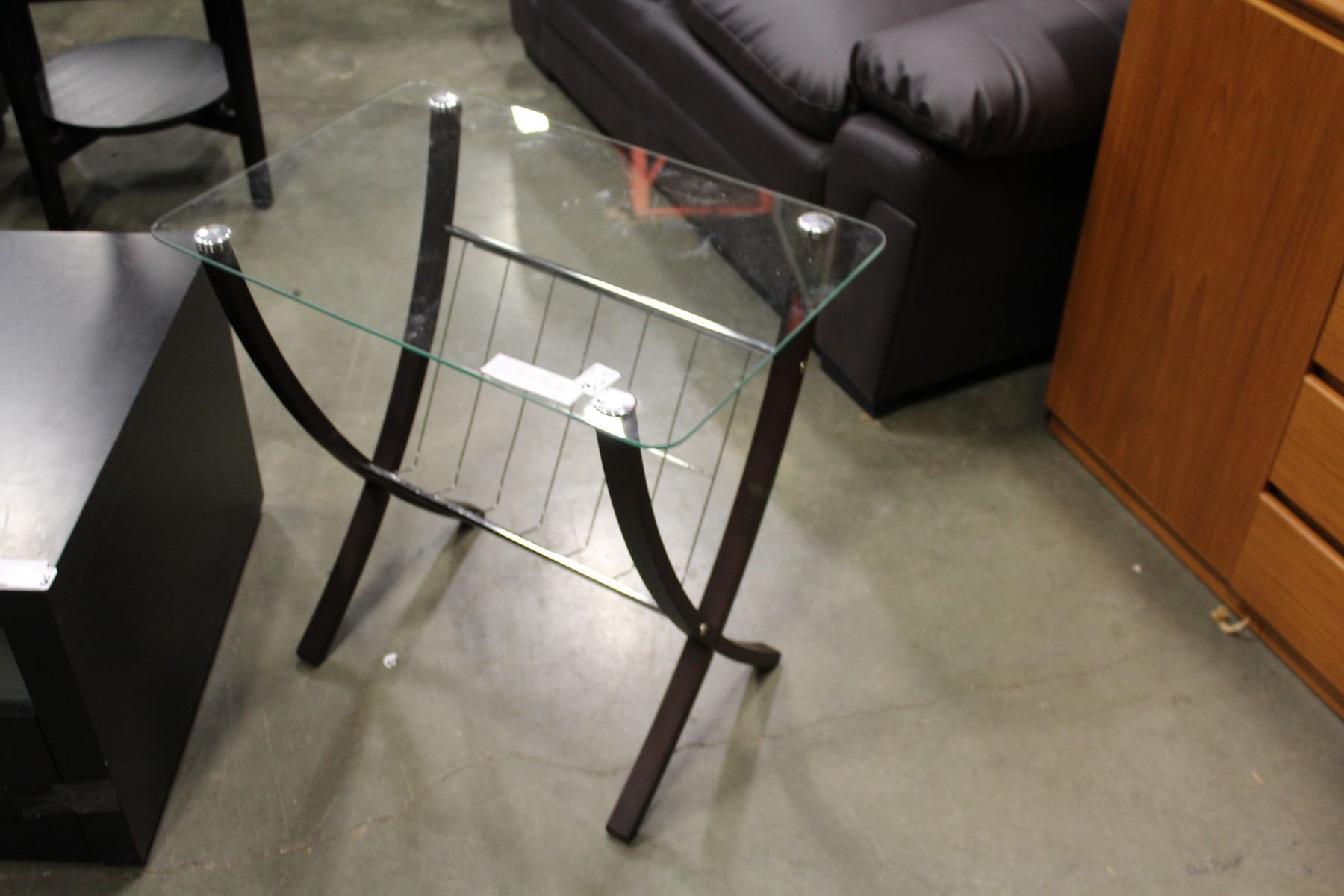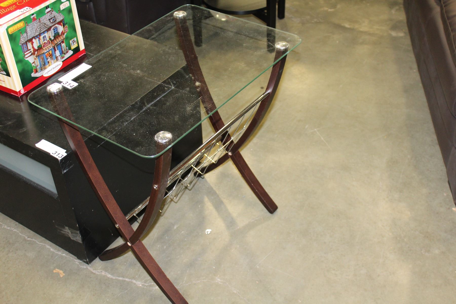 MODERN GLASSTOP ENDTABLE WITH MAGAZINE RACK AND FRAMED MOM SHADOWBOX