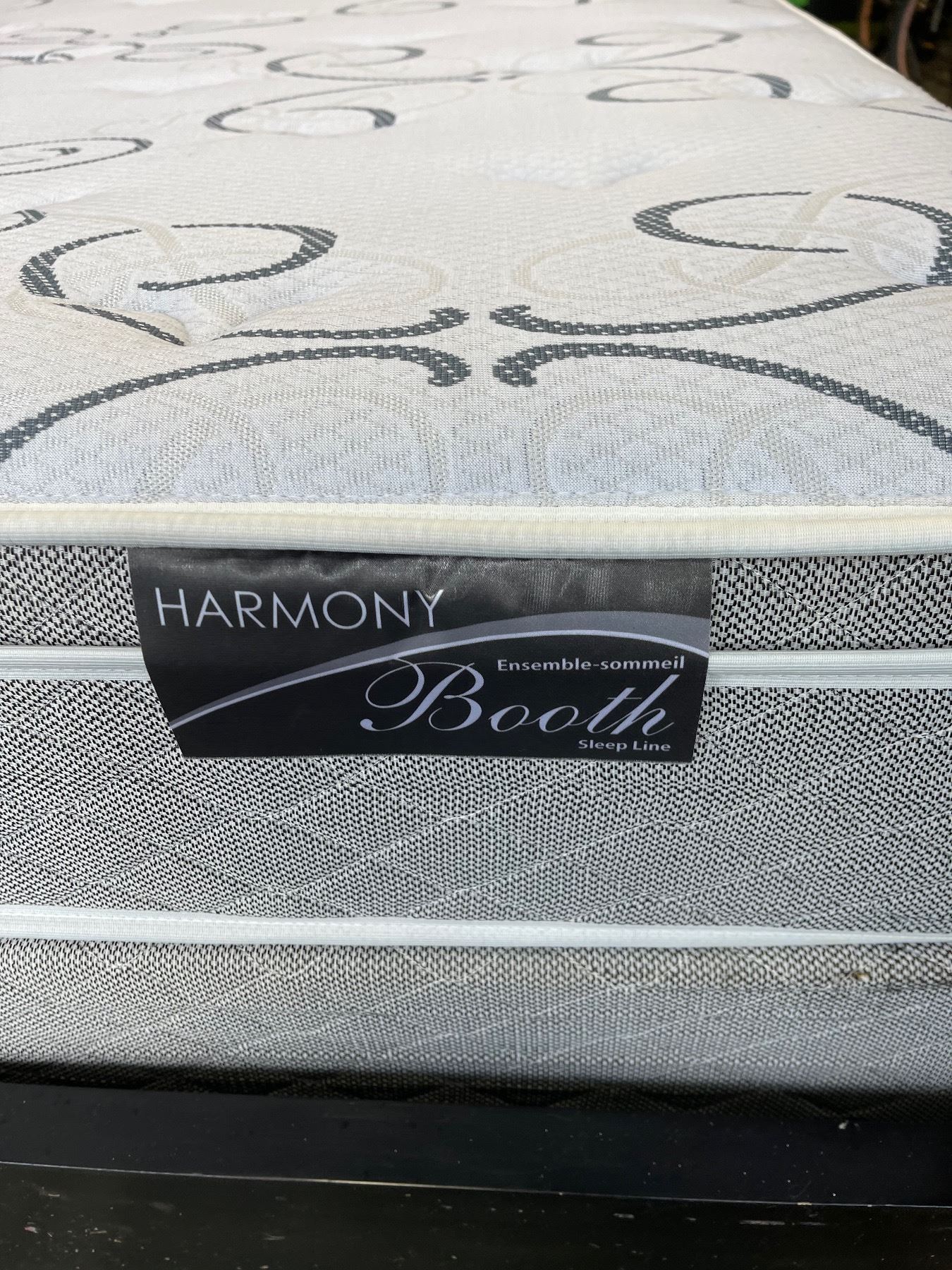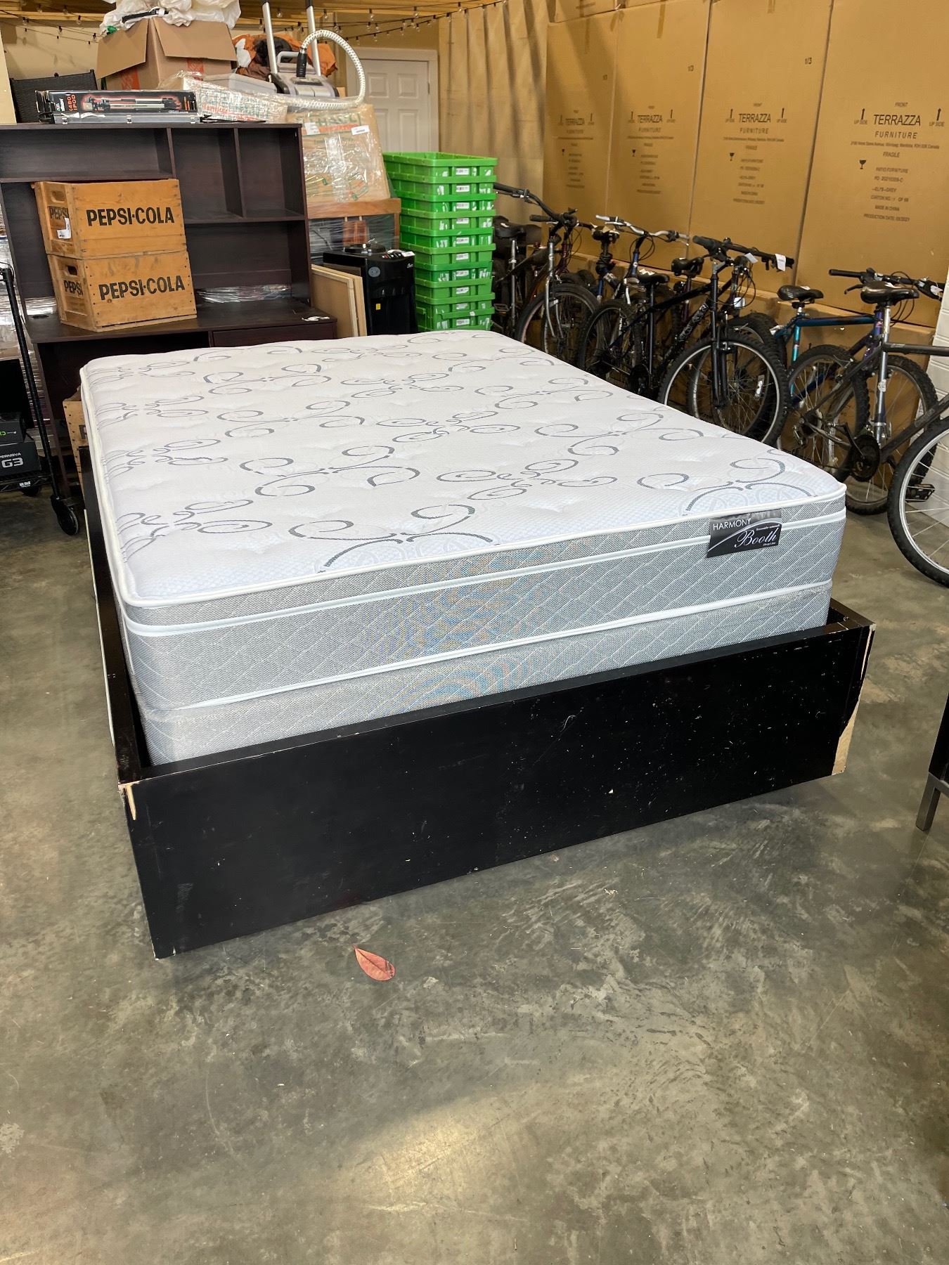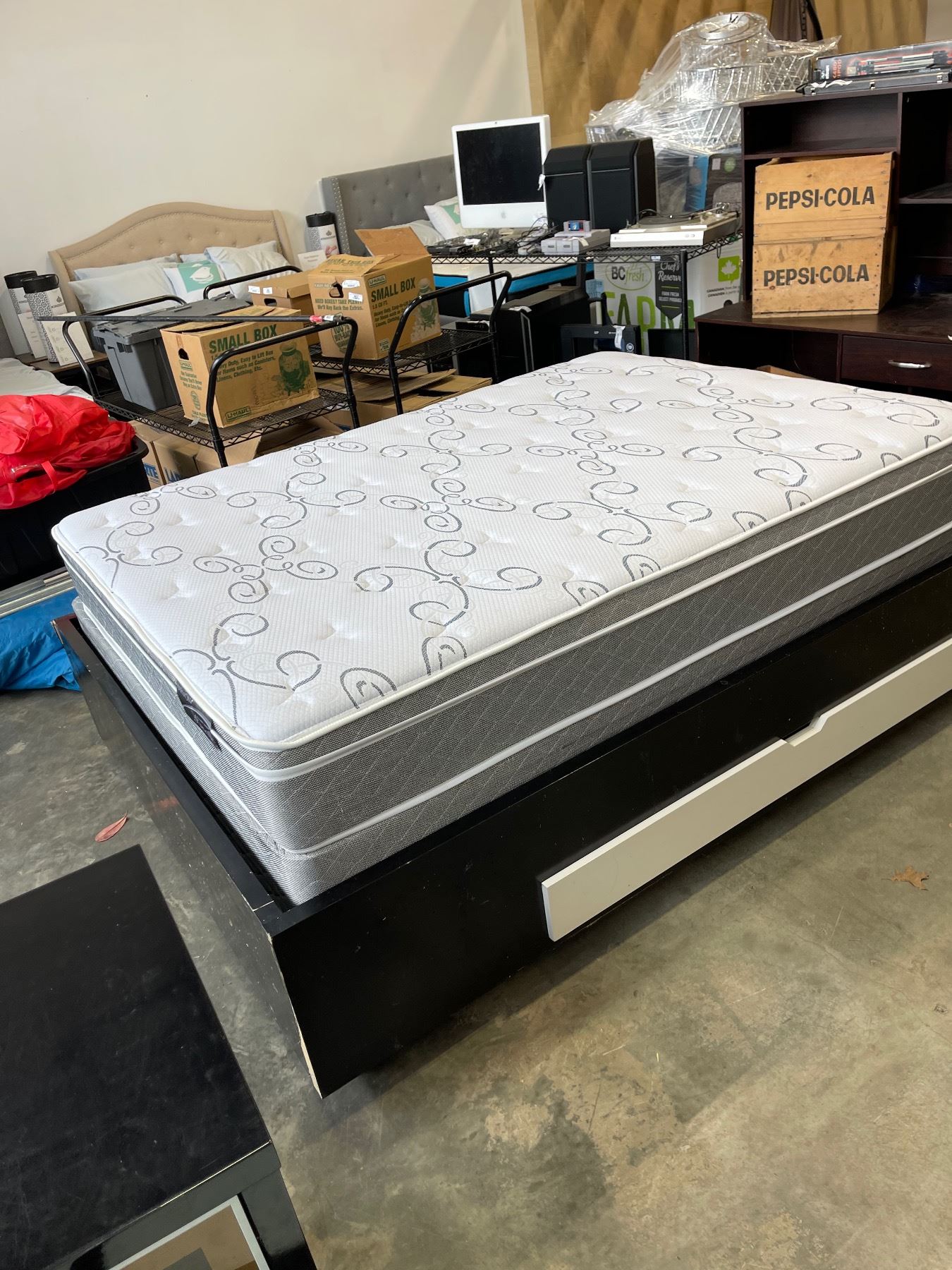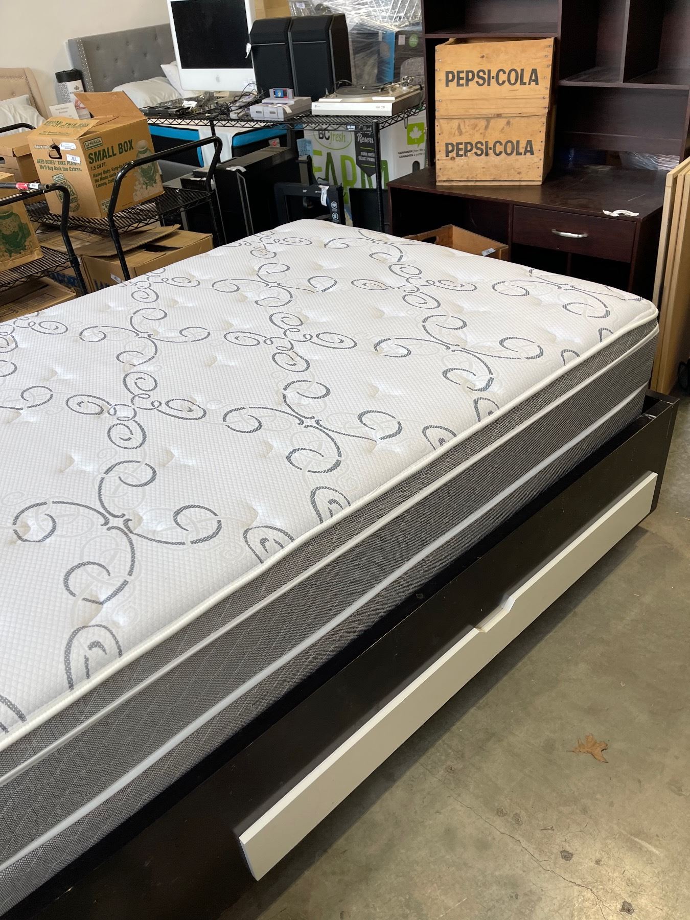 MODERN QUEEN SIZE SOLID WOOD PLATFORM BEDFRAME WITH TWO DRAWERS AND QUEENSIZE MATTRESS AND BOXSPRING,