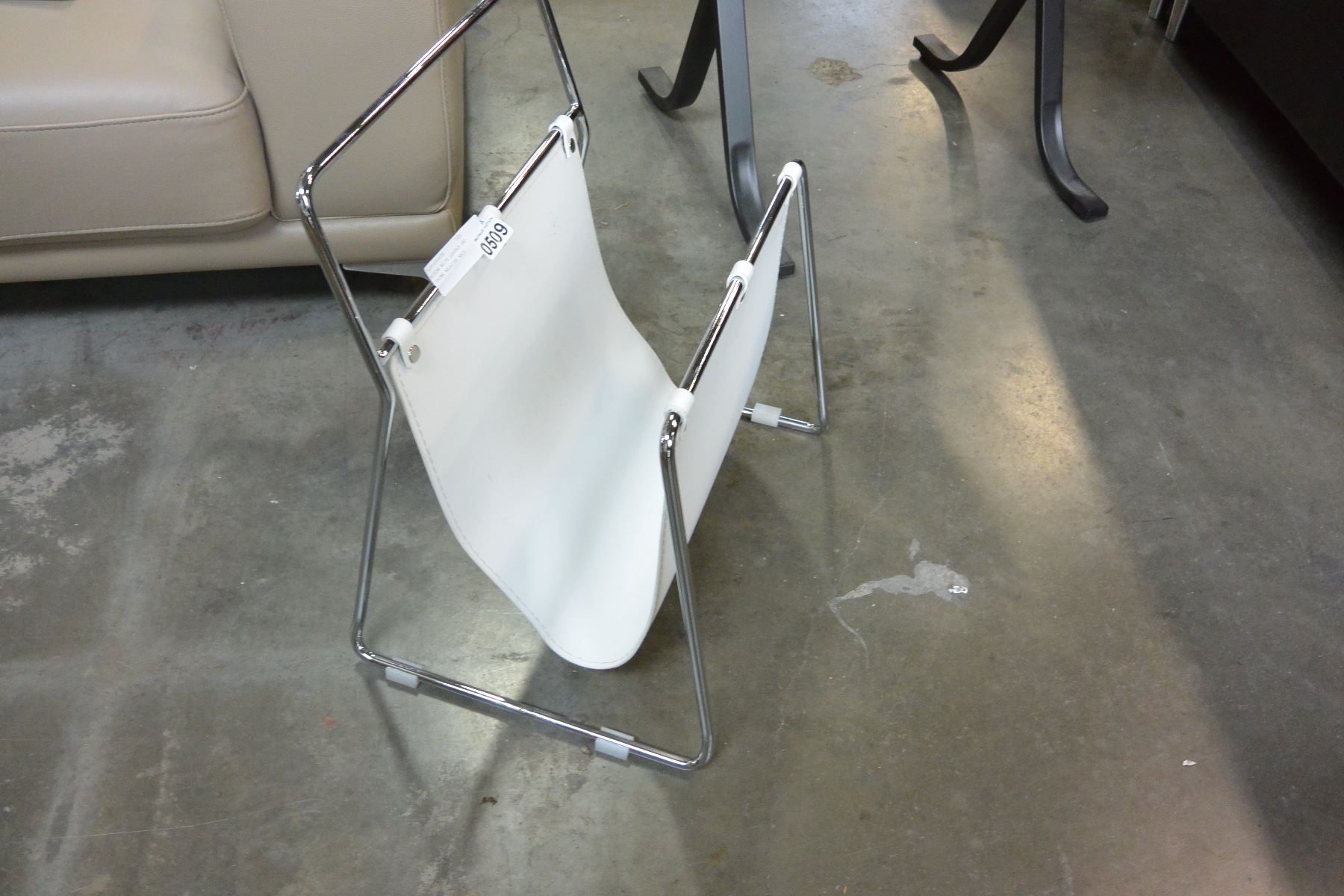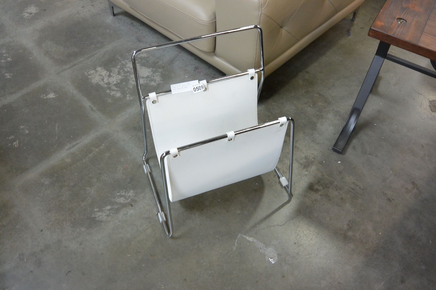 MODERN WHITE LEATHER AND CHROME MAGAZINE RACK