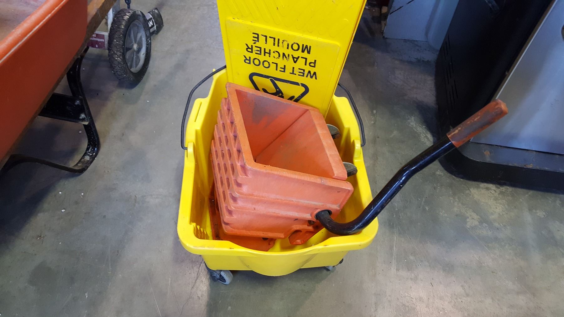 MOP BUCKET WITH WRINGER AND WET FLOOR SIGN