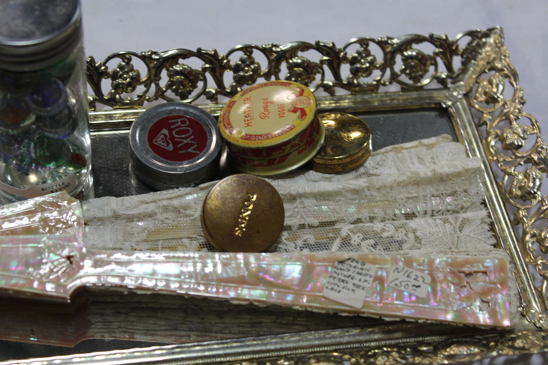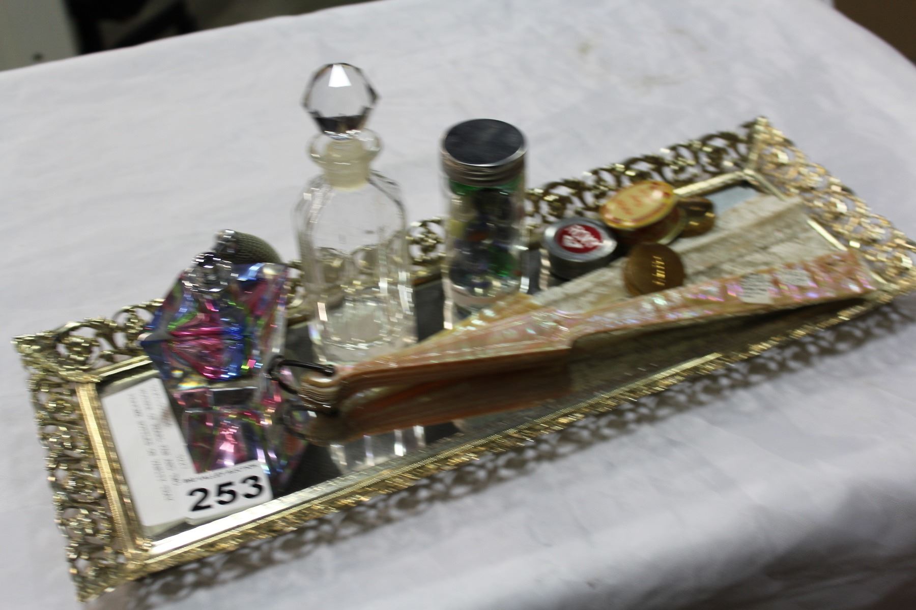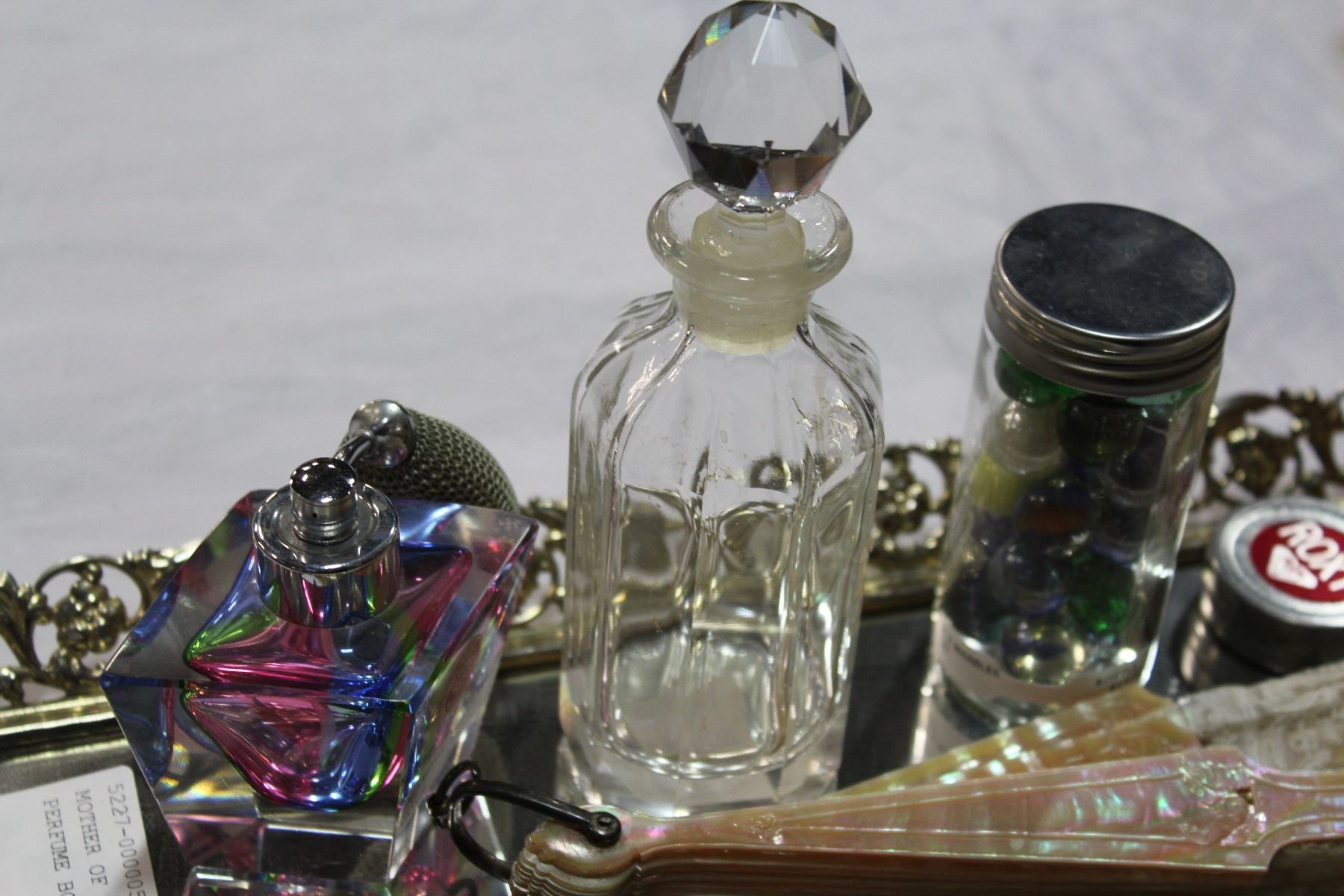 MOTHER OF PEARL FAN AND TWO PERFUME BOTTLES ON VANITY TRAY