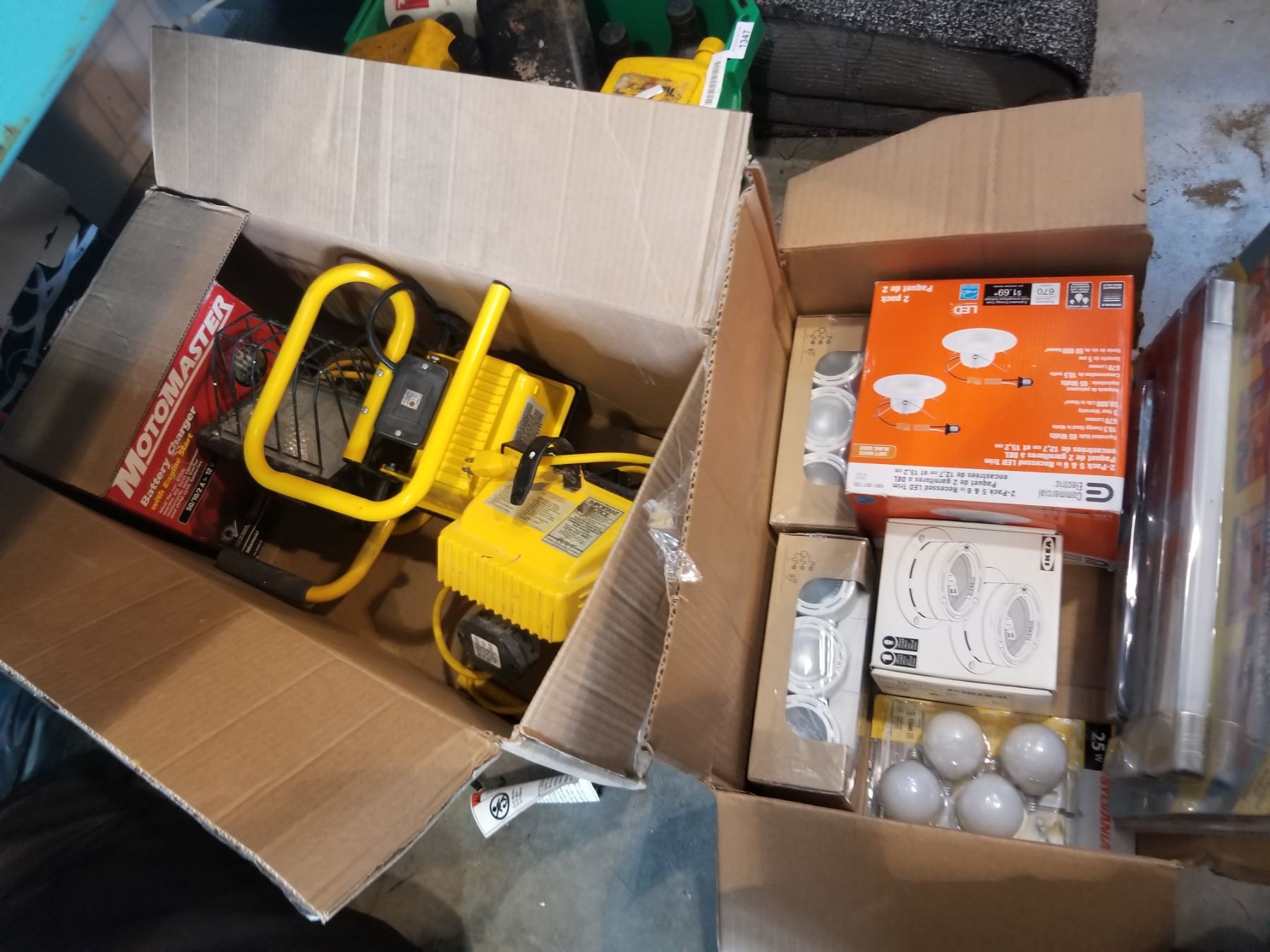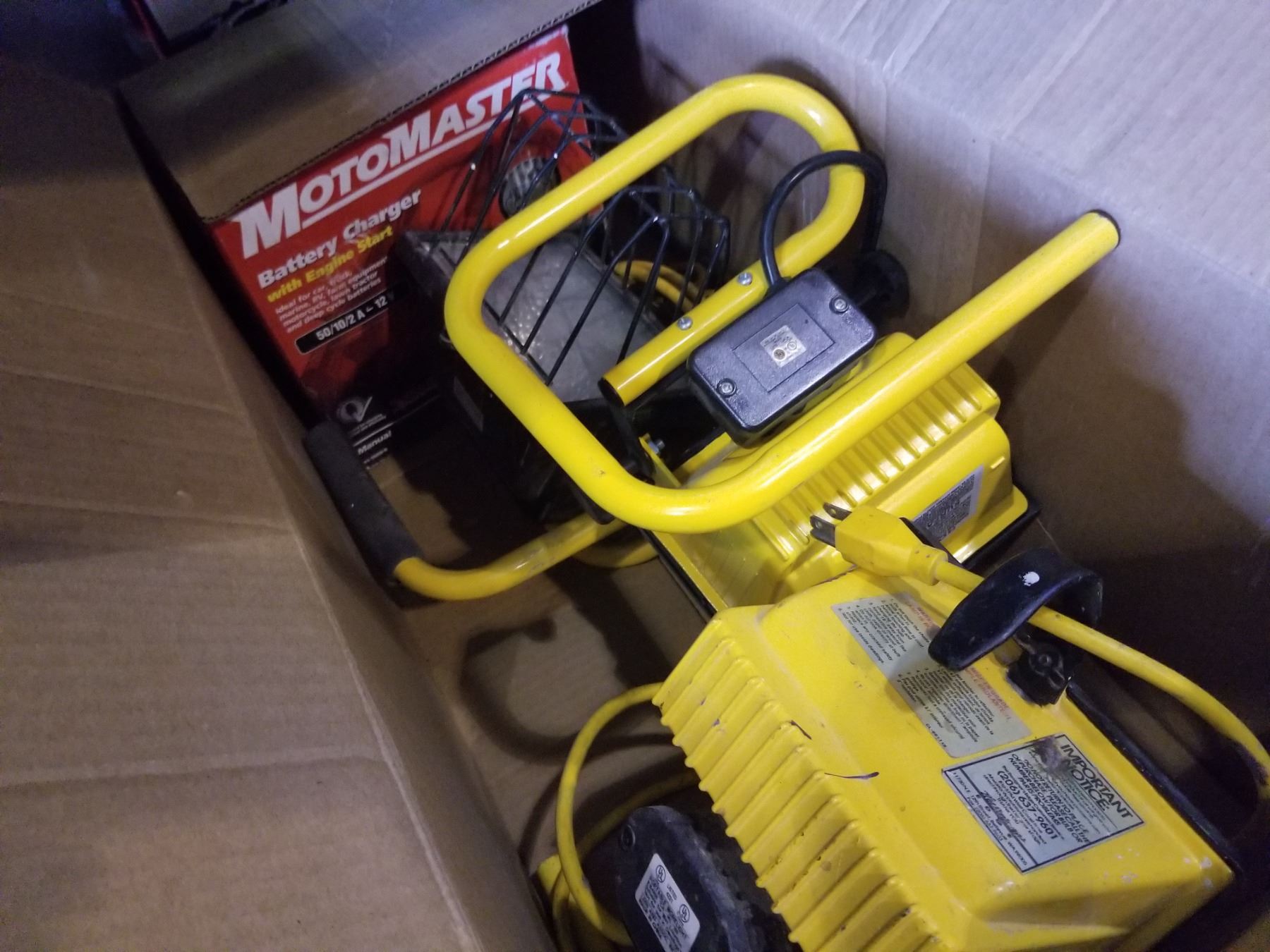 MOTOMASTER BATTERY CHARGER, 2 SHOP LIGHTS, TRAY OF LIGHT BULBS
