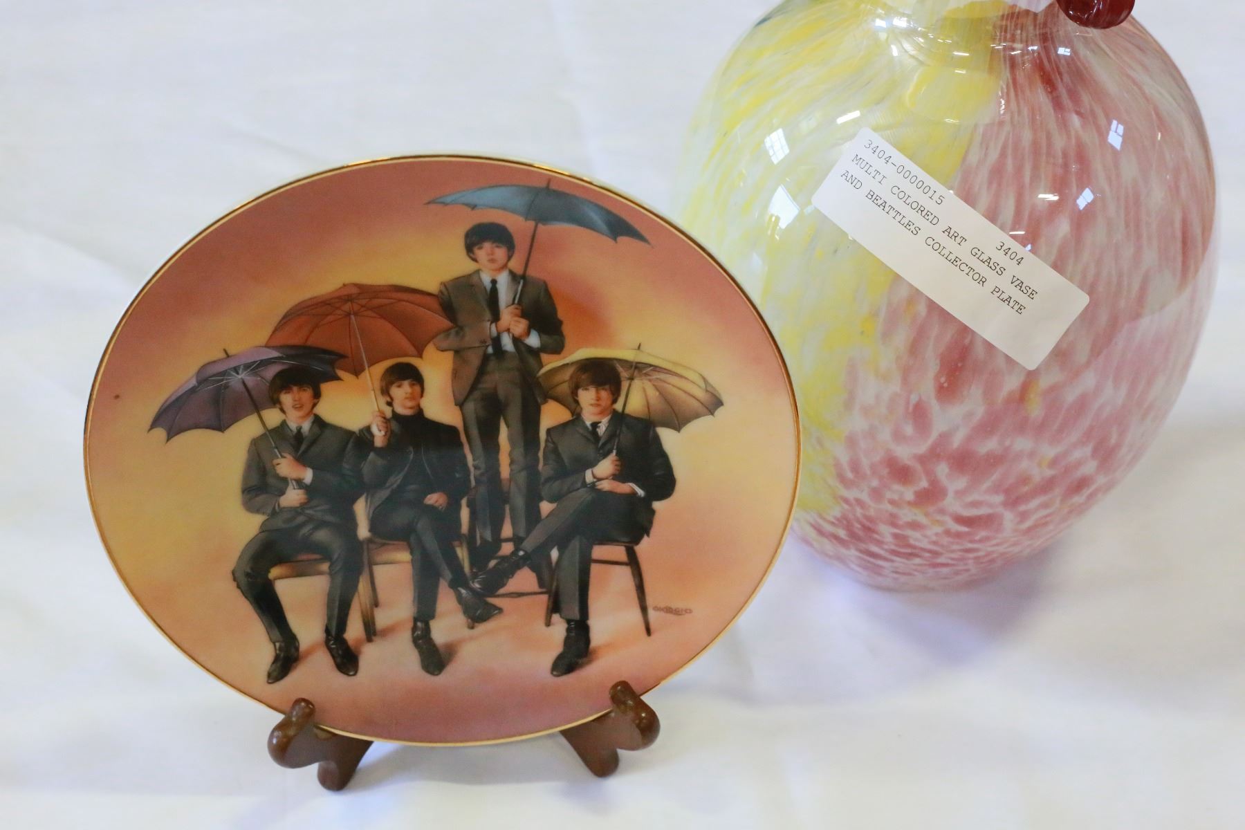MULTI COLORED ART GLASS VASE AND BEATTLES COLLECTOR PLATE