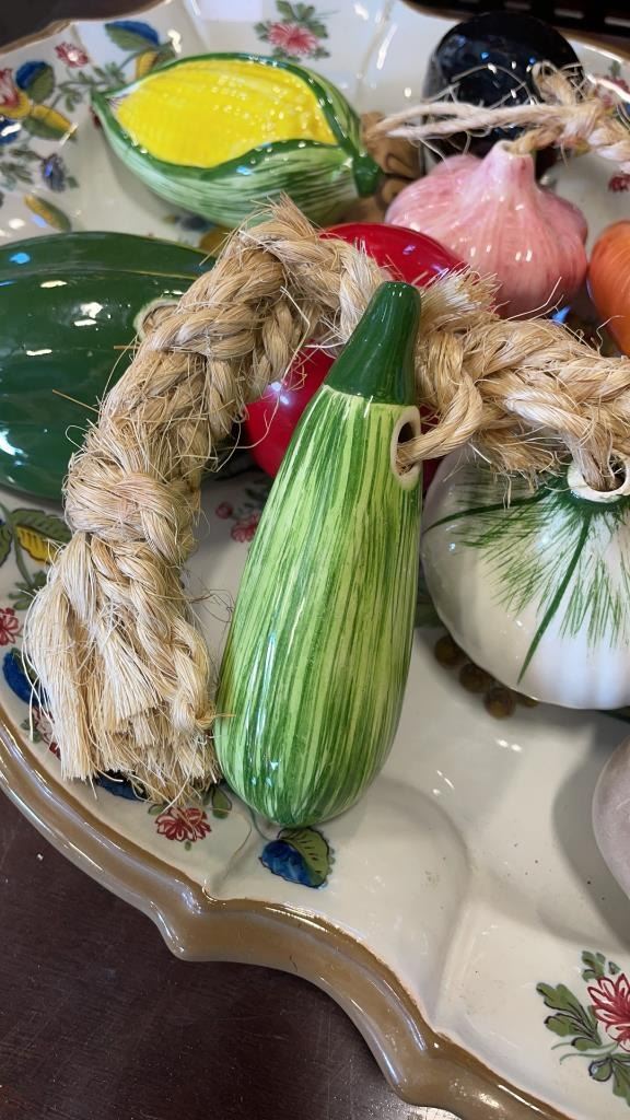 MUSHROOM CANNISTER, NUT DISH, NUT CRACKER, PLATTER AND CERAMIC VEGETABLES