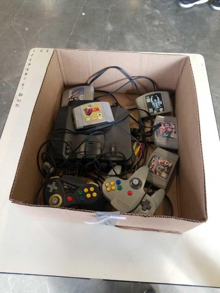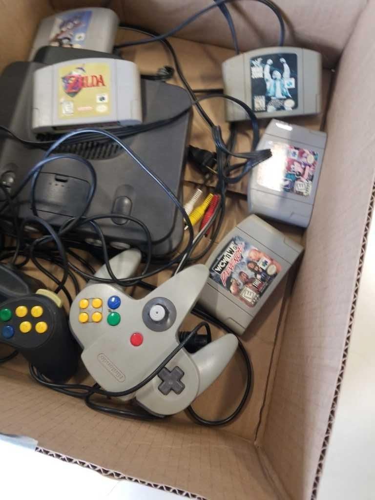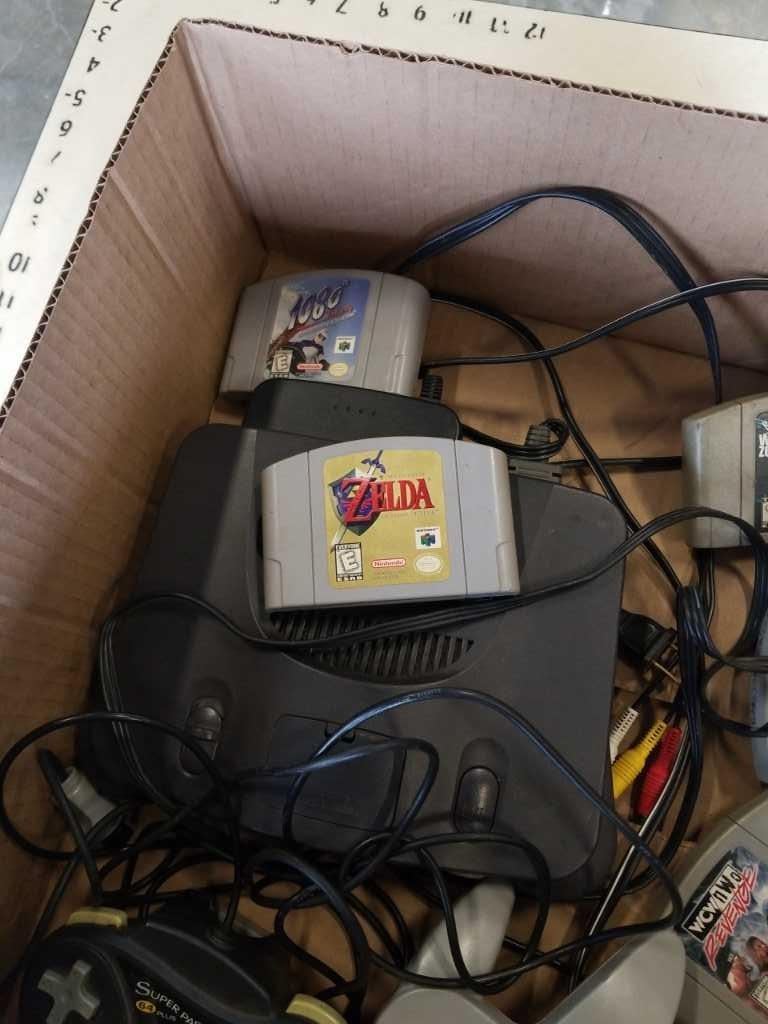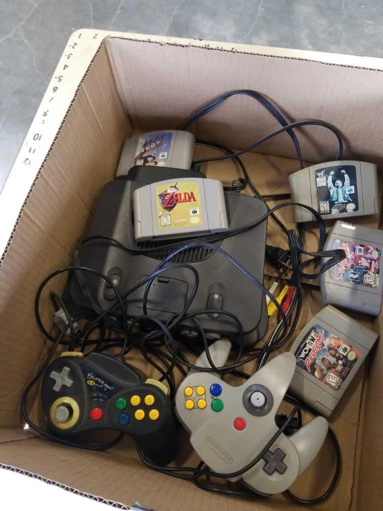 N64 CONSOLE WITH CONTROLLERS AND GAMES - LEGEND OF ZELDA OCARINA OF TIME, BANJO KAZOOIE, WWF WARZONE