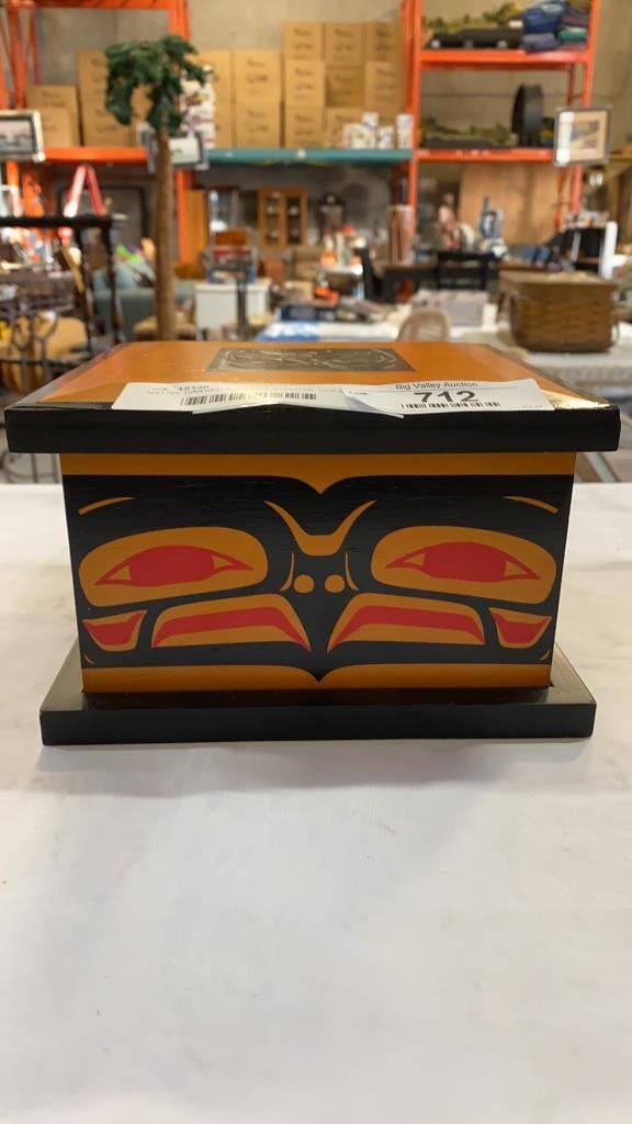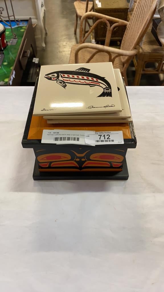 NATIVE CARVED BOX AND 3 NATIVE TILES