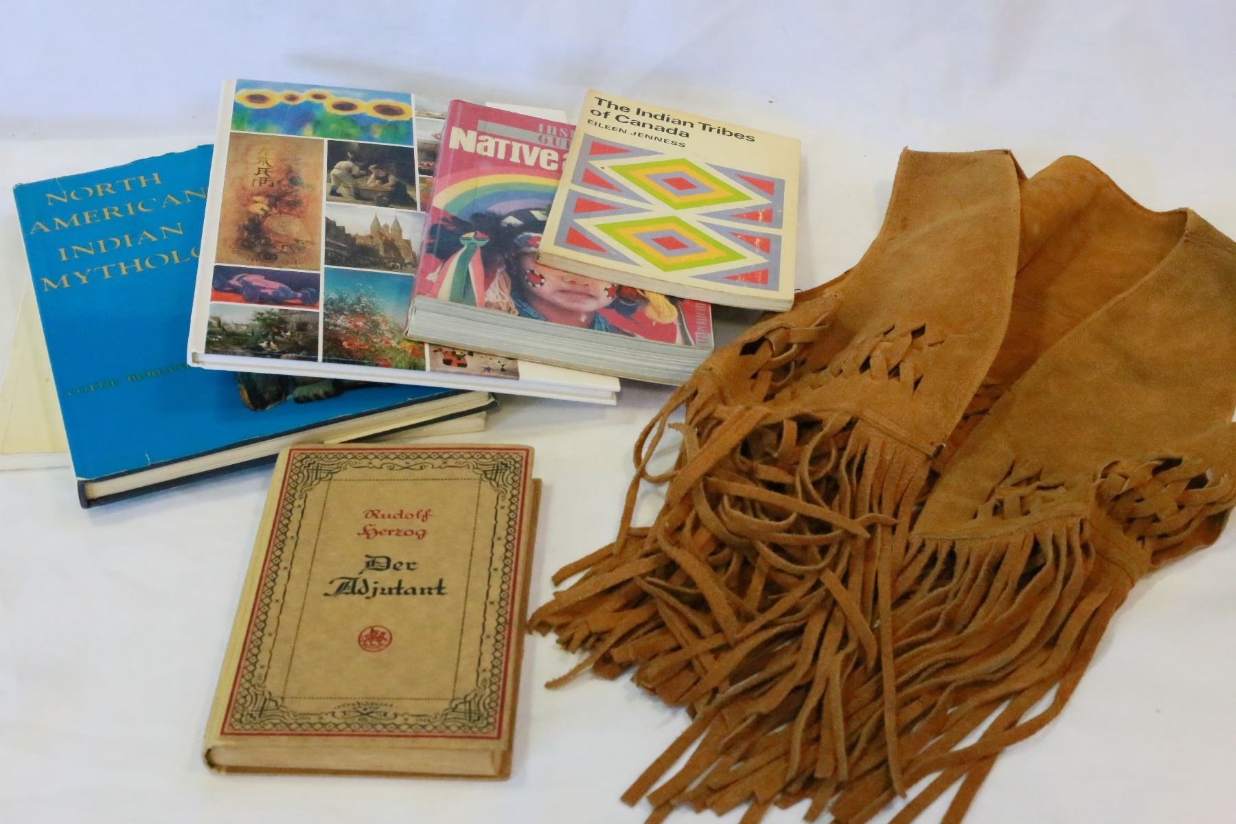 NATIVE MYTHOGOLOY BOOKS AND CHILDS FRINGED VEST