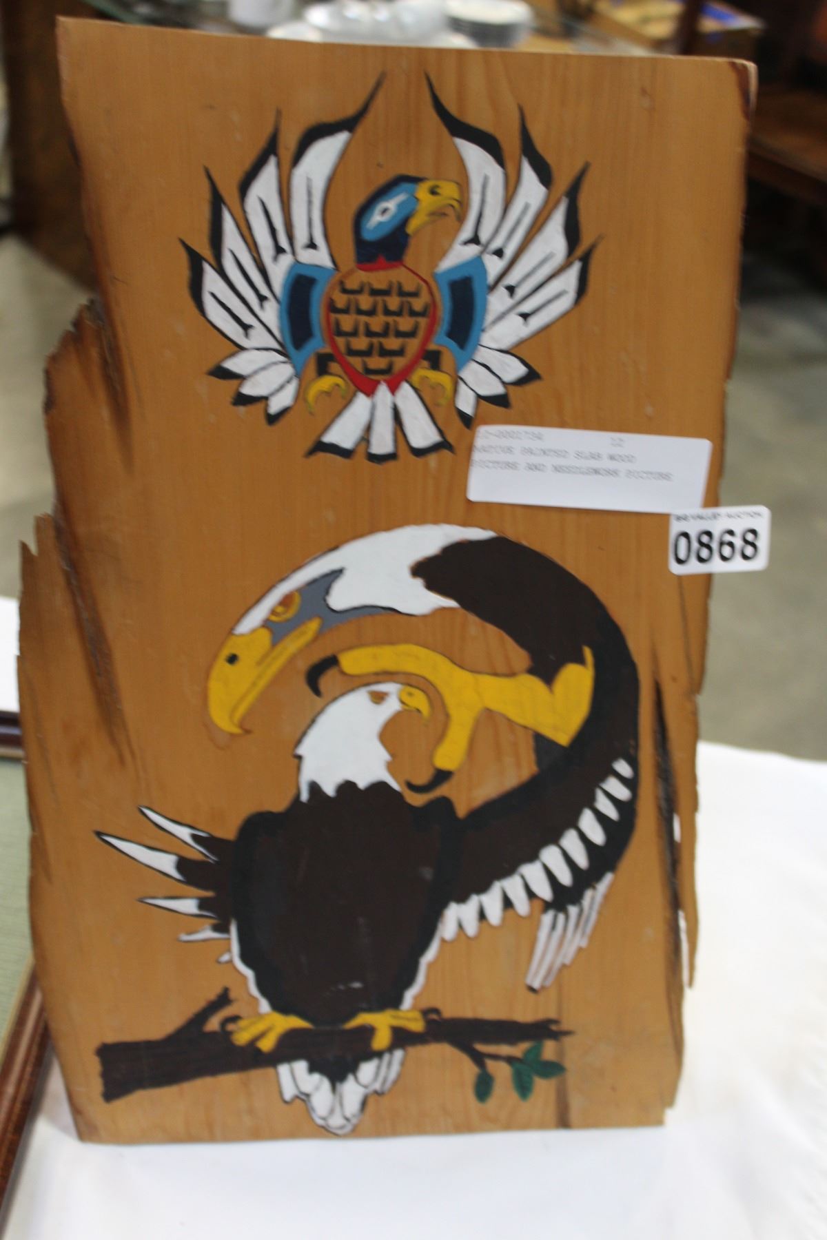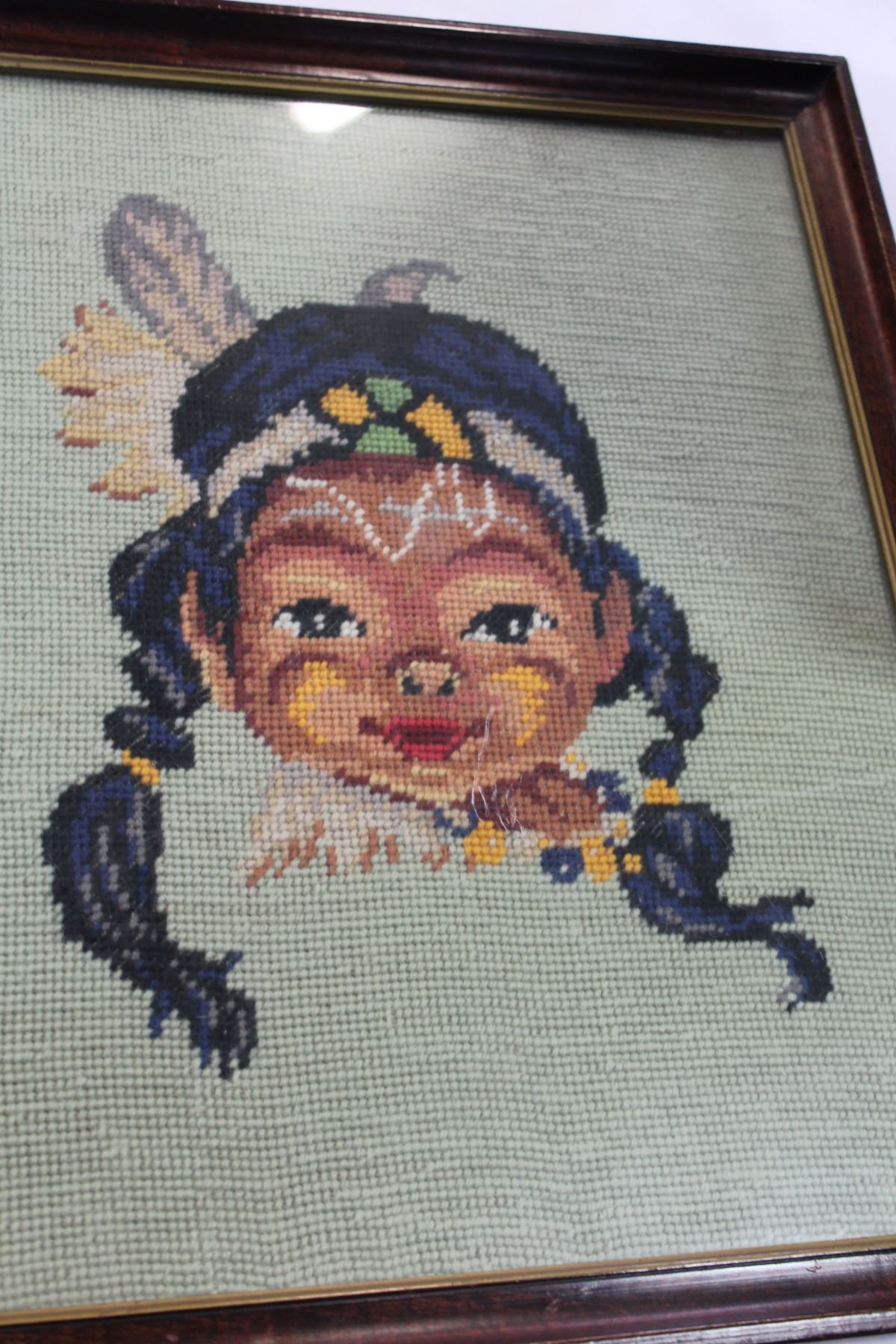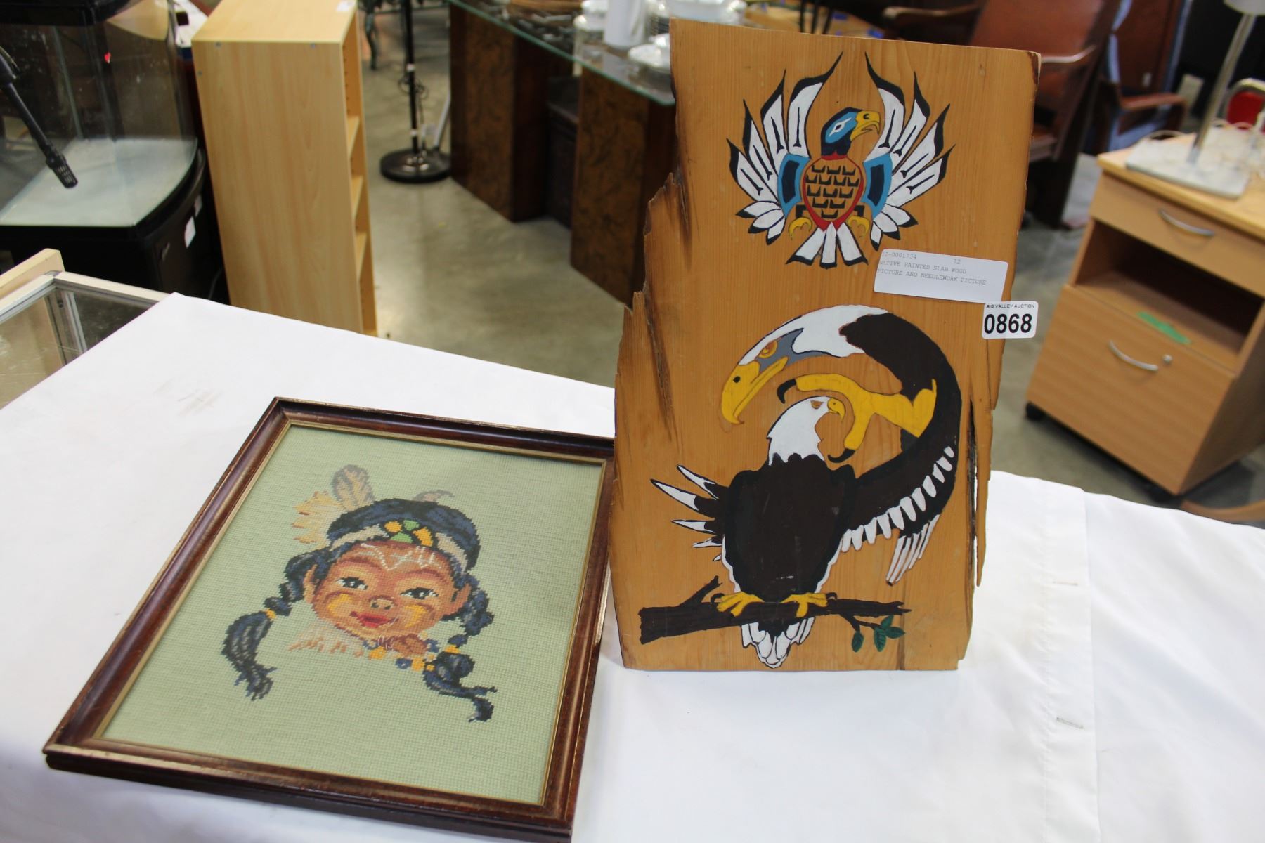 NATIVE PAINTED SLAB WOOD PICTURE AND NEEDLEWORK PICTURE