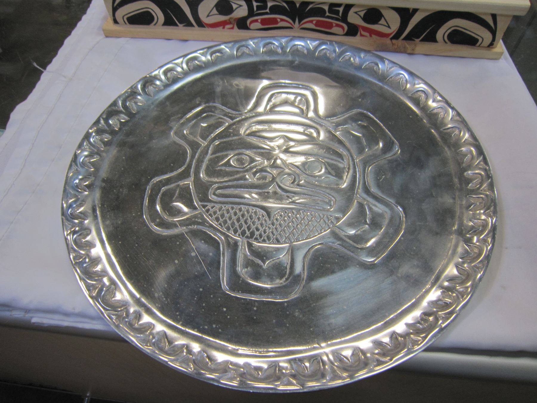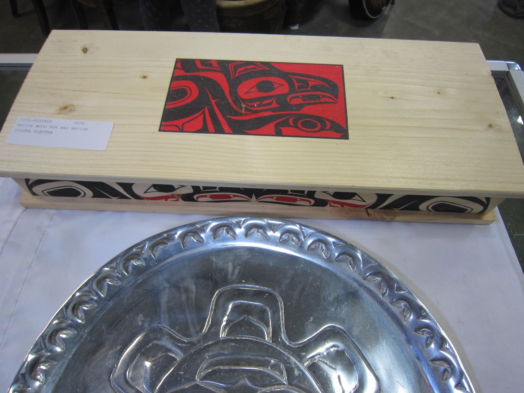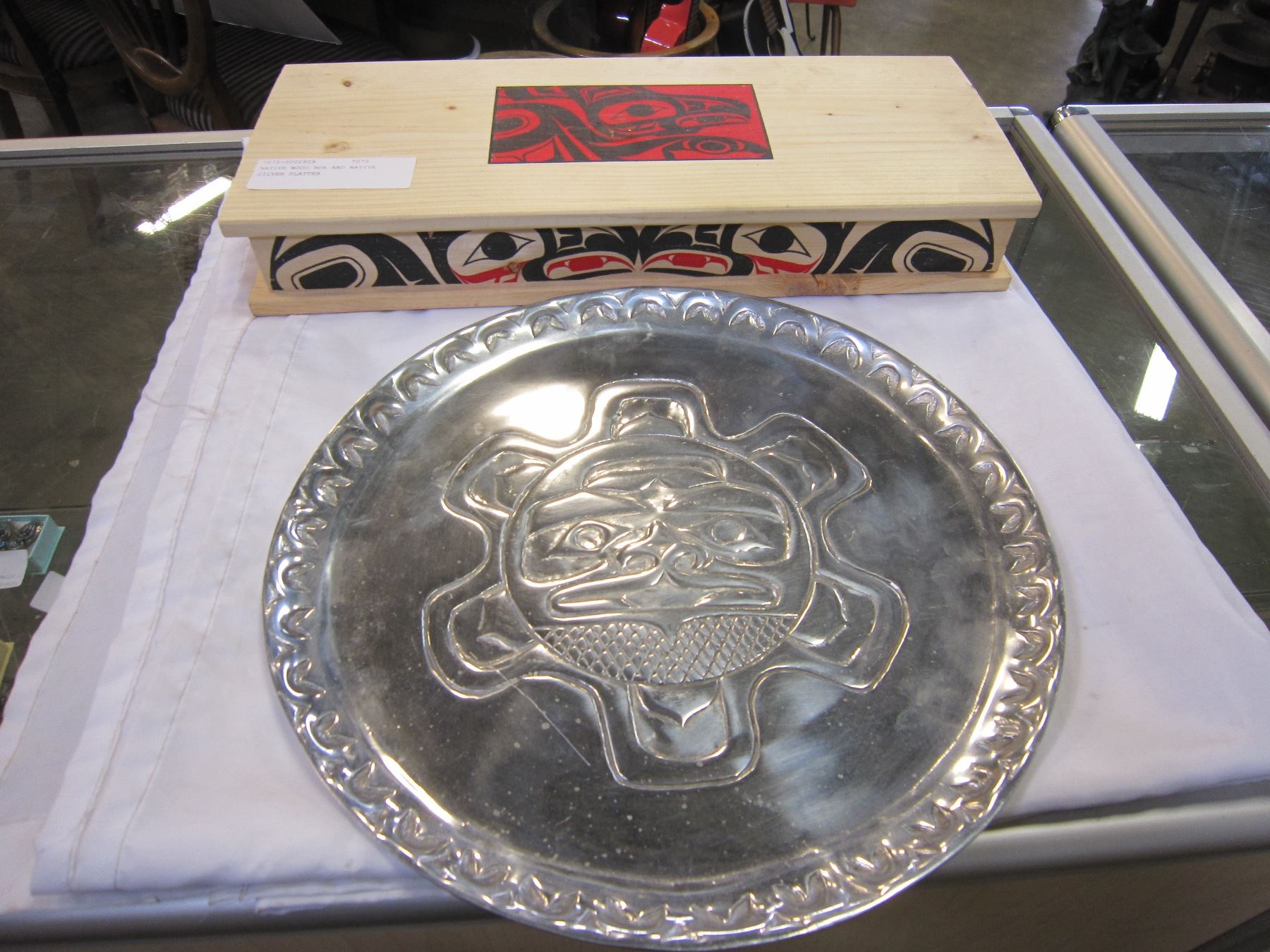 NATIVE WOOD BOX AND NATIVE SILVER PLATTER