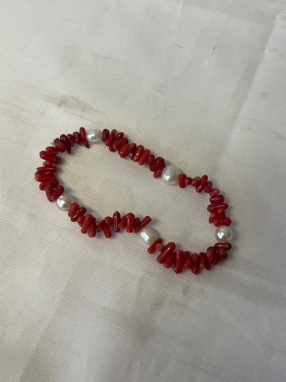 NATURAL BLOOD RED CORAL W/ CULTURED FRESHWATER PEARLS STRETCH BRACELET