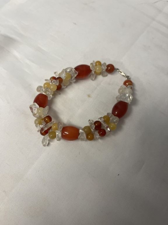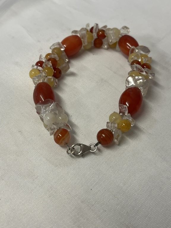 NATURAL ROCK CRYSTAL AND CARNELIAN BEADS BRACELET W/ STERLING SILVER LOBSTER CLASP, MARKED 925