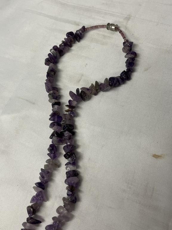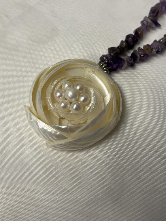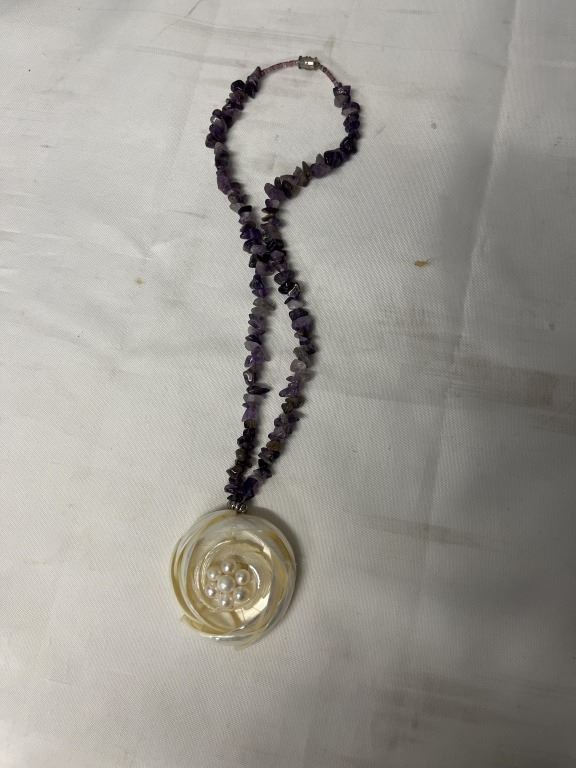 NATURAL TUMBLED AMETHYST STONES W/ MOTHER OF PEARL PENDANT NECKLACE