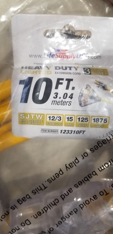 NEW 10FT 3 OUTLET HEAVY DUTY INDOOR OUTDOOR 3 WIRE EXTENSION CORD, YELLOW 12AWG