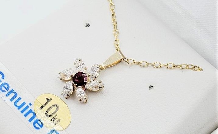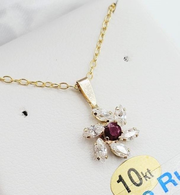 NEW 10KT. YELLOW GOLD 3.1MM NATURAL ENHANCED RUBY (0.16CTS) & CZ PENDANT WITH STERLING SILVER CHAIN, W/A $840.00, RUBY IS THE BIRTHSTONE FOR JULY.