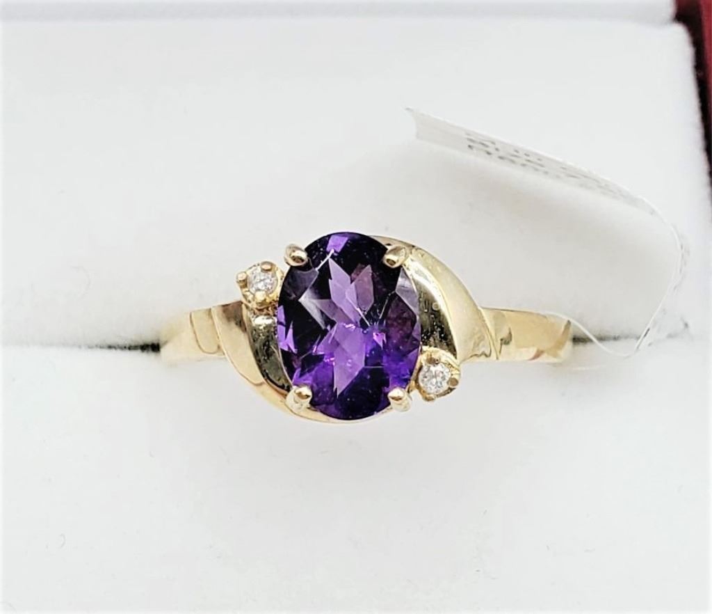 NEW 10KT. YELLOW GOLD 8MM X 6MM GENUINE AMETHYST (1CT) & DIAMOND (0.02CTS) RING, W/A $1110.00, SIZE