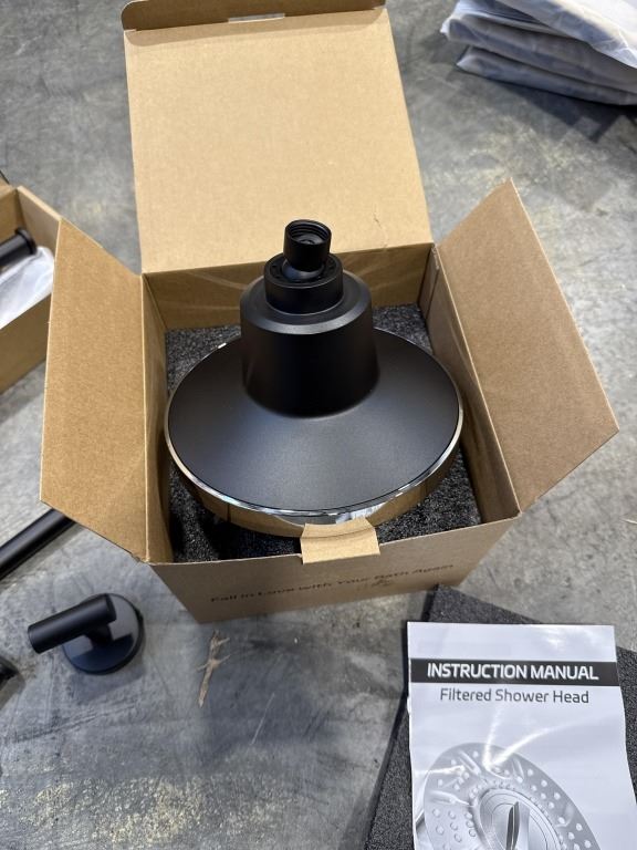 NEW 10PC BATHROOM TOWEL BAR AND TISSUE / HOOK SET BLACK, AND NEW UNIQUE RAIN SHOWER HEAD WITH FILTER CARTRIDGE