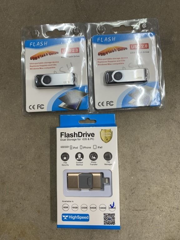 NEW 256 GB FLASH DRIVES FOR APPLE PRODUCTS AND (2) NEW 128 GB USB 2.0 FLASH DRIVES