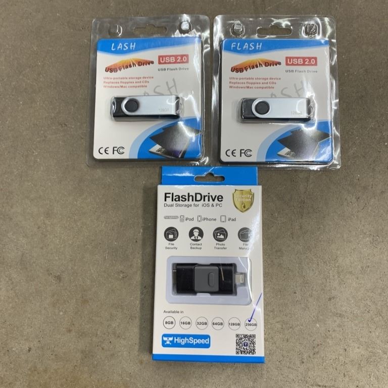 NEW 256 GB FLASH DRIVES FOR APPLE PRODUCTS AND (2) NEW 128 GB USB 2.0 FLASH DRIVES