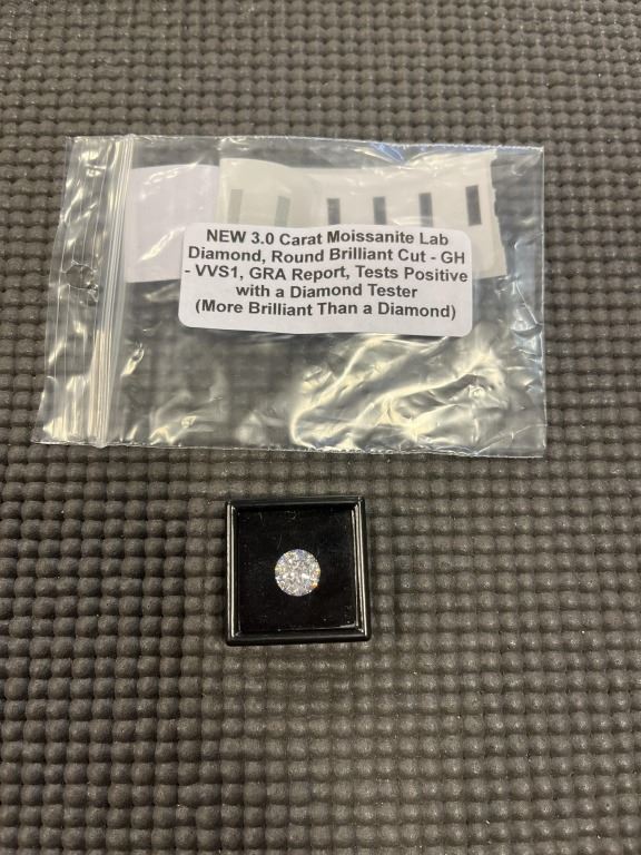 NEW 3.0 CARAT MOISSANITE LAB DIAMOND, ROUND BRILLIANT CUT, GH-VVS1, GRA REPORT, TESTS POSITIVE W/ DIAMOND TESTER (MORE BRILLIANT THAN A DIAMOND)