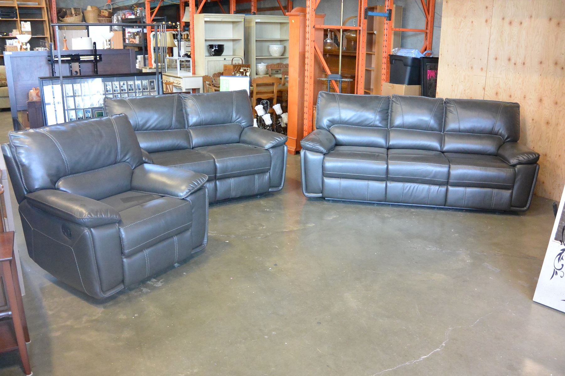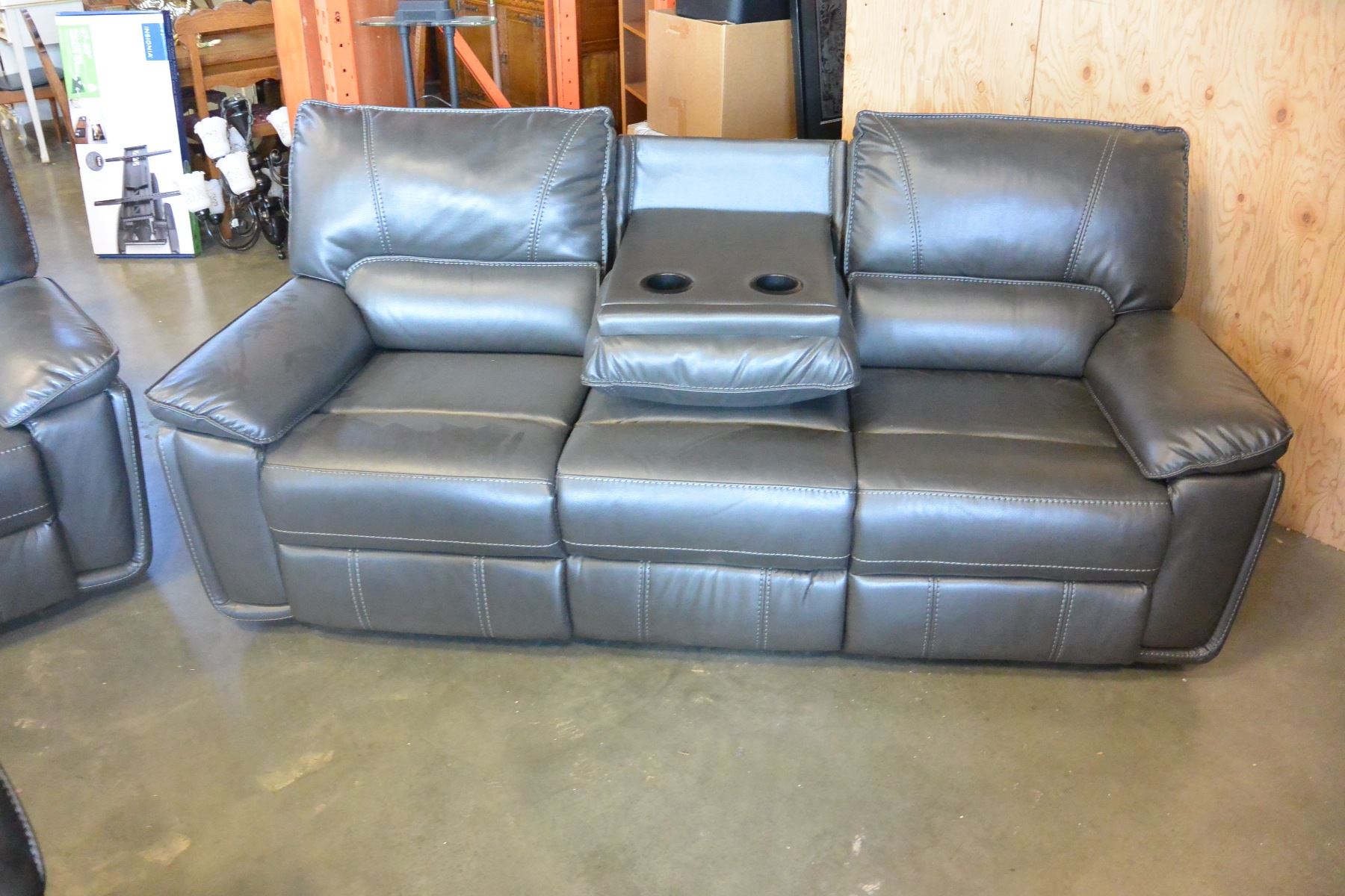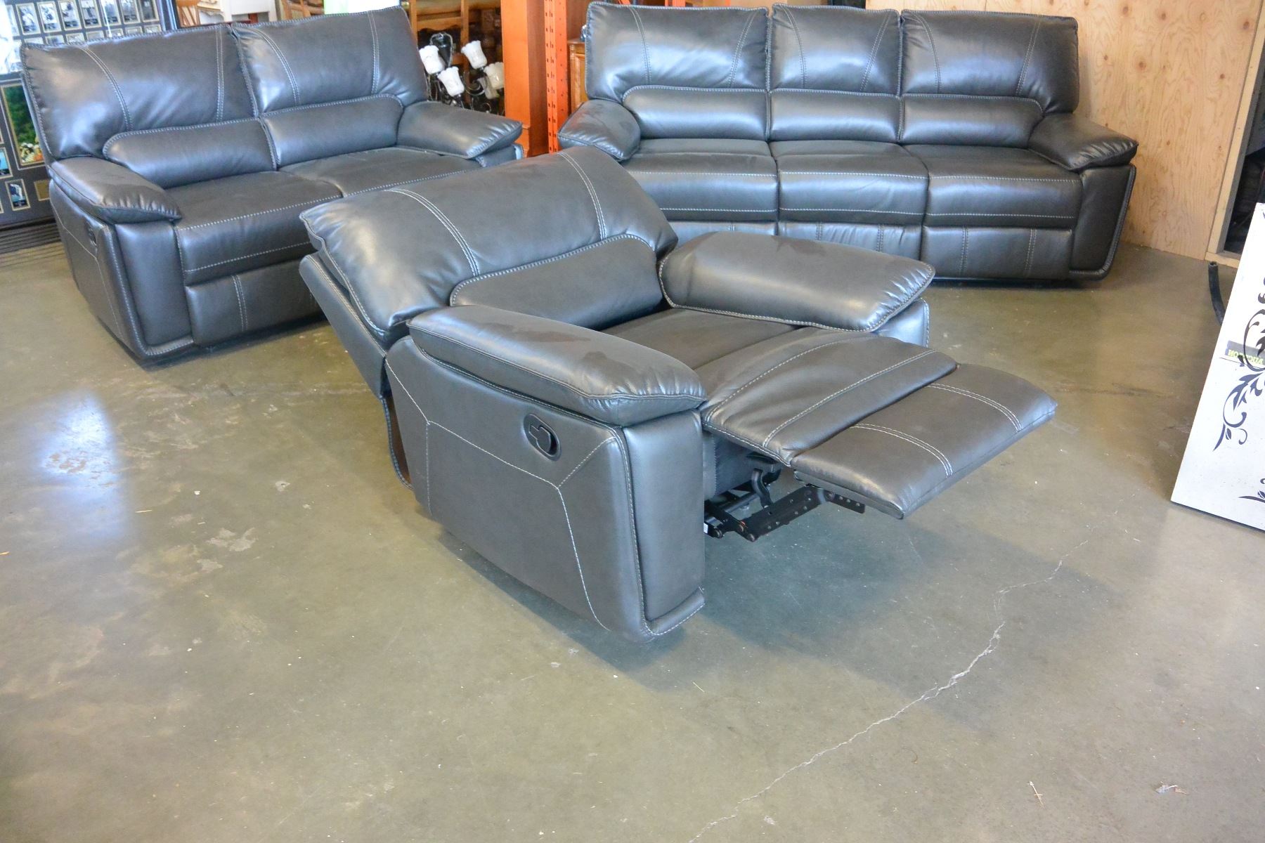NEW 3 PIECE GREY LEATHER MODERN MOTION RECLINING SOFA SET, WITH WHITE STICHING AND DROP DOWN SOFA CONSOLE RETAIL $4299
