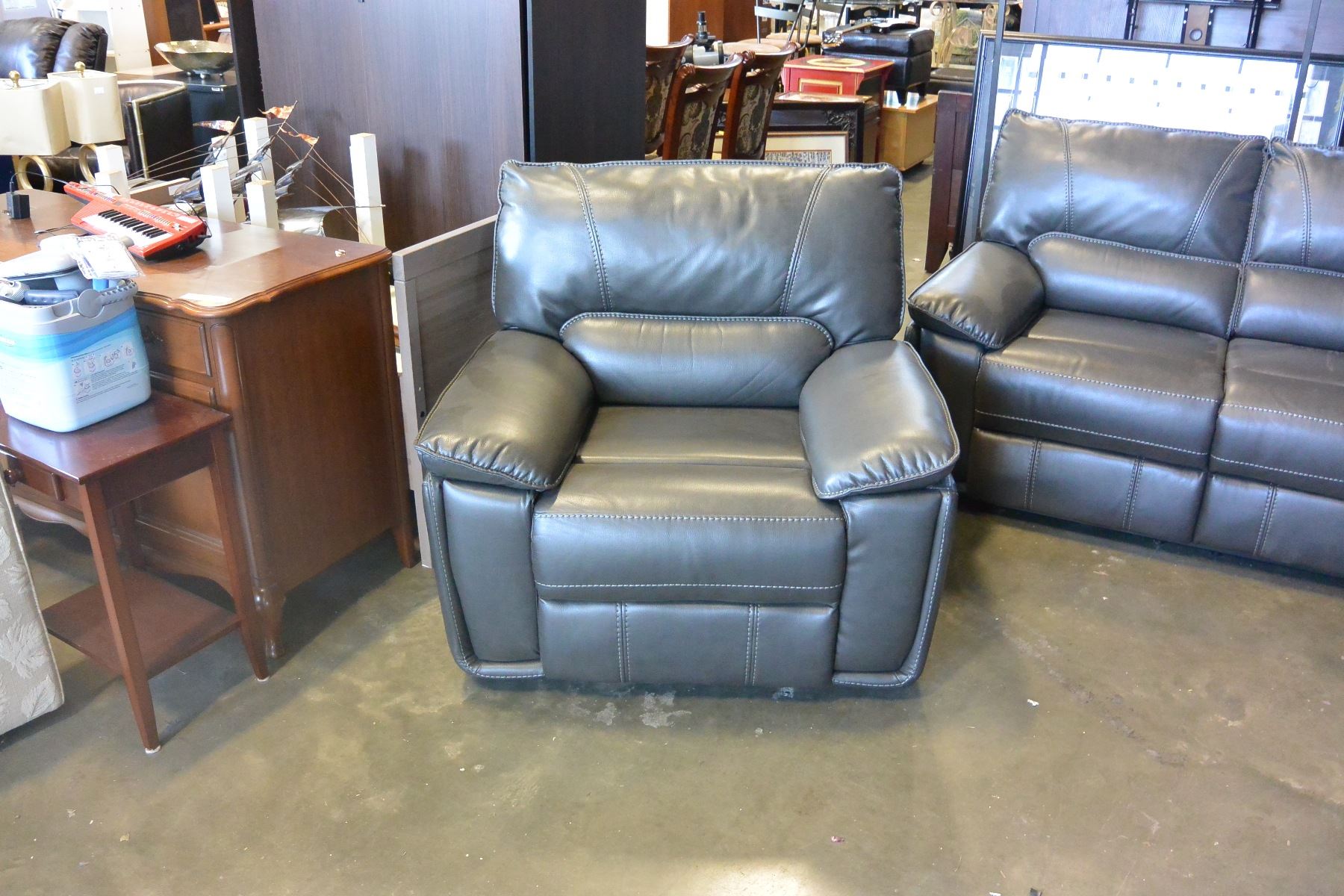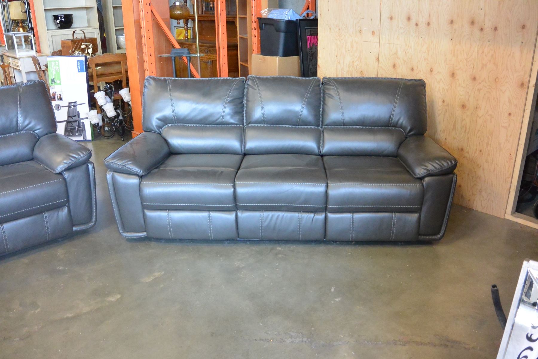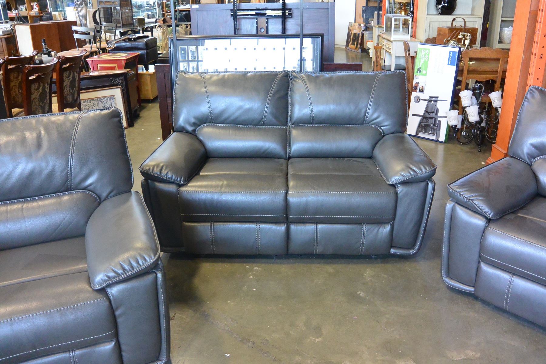 NEW 3 PIECE GREY LEATHER MODERN MOTION RECLINING SOFA SET, WITH WHITE STICHING AND DROP DOWN SOFA CONSOLE RETAIL $4299