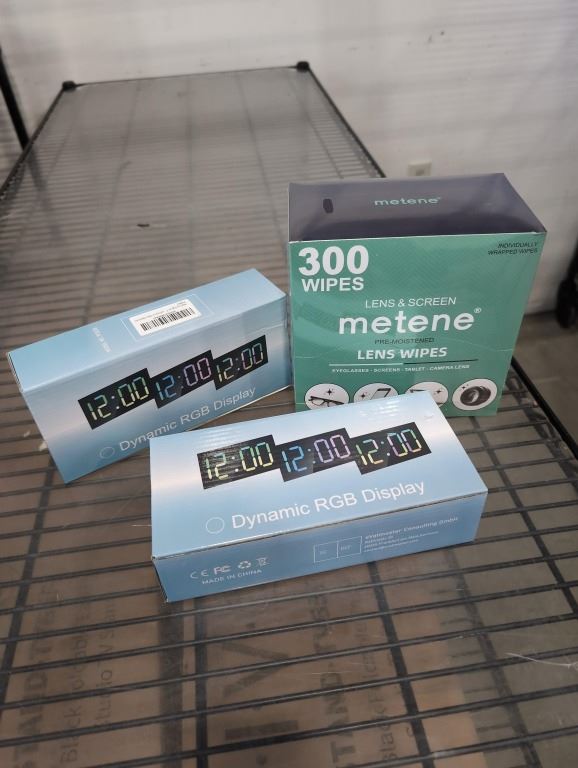 NEW 300 PACK OF LENS WIPES AND 2 SINGLE COLOR DISPLAY DESKTOP CLOCKS
