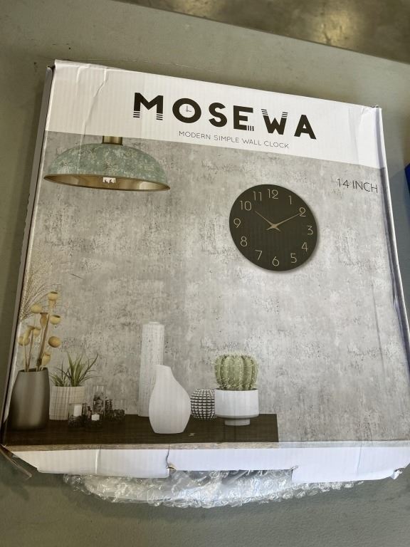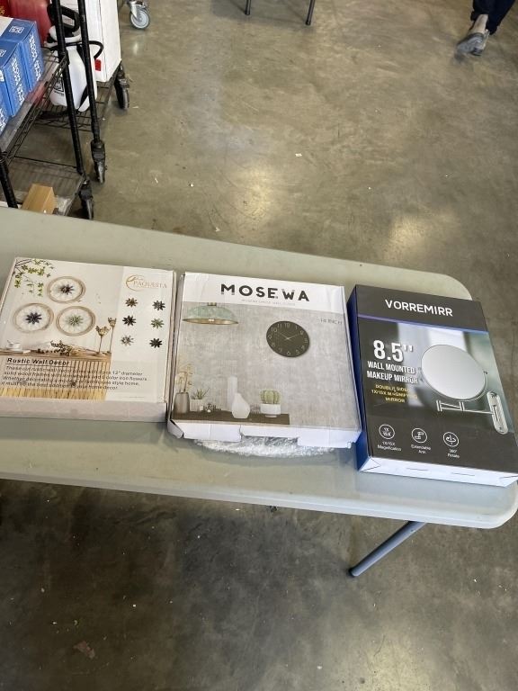 NEW 3PC RUSTIC WALL DECOR, NEW 8.5 WALL MOUNTED MIRROR AND NEW 14 INCH MODERN CLOCK