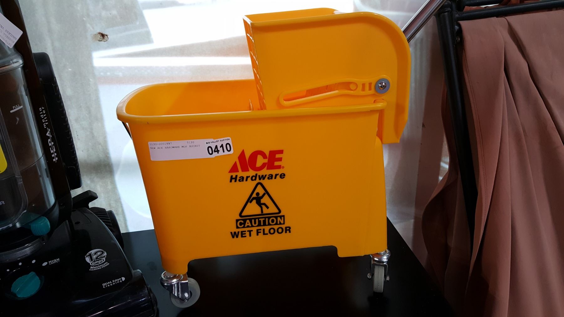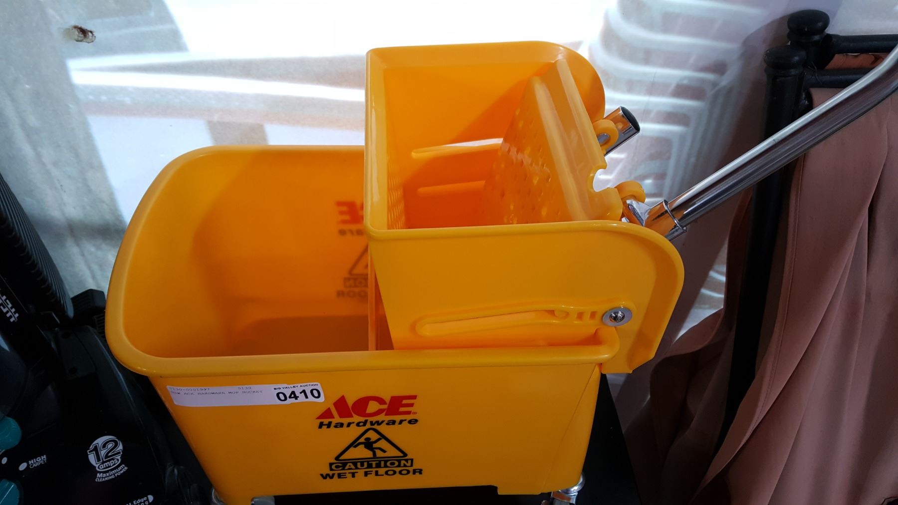 NEW ACE HARDWARE MOP BUCKET AND JUG OF GREEN WORKS AND JUG OF MR CLEAN CLEANING FLUIDS