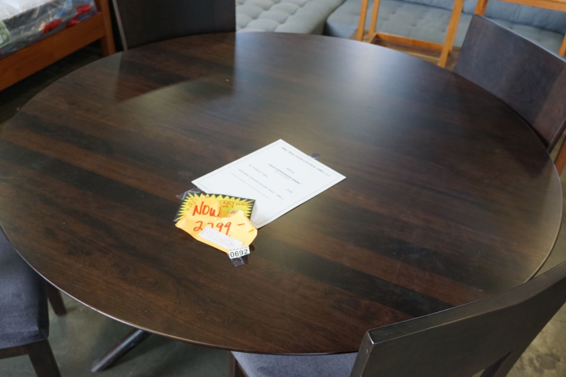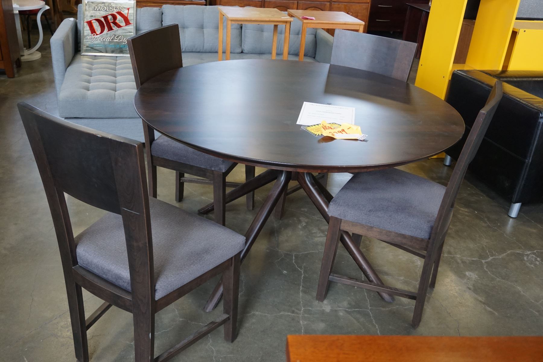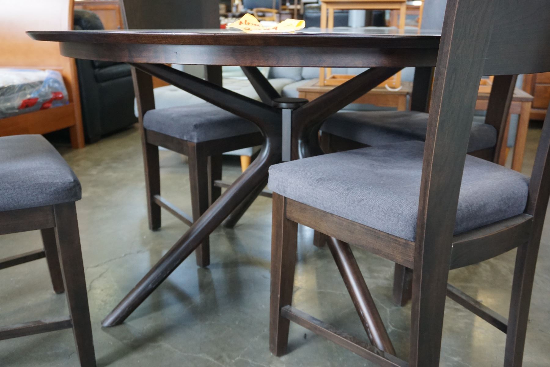 NEW AMELIA SOLID CHERRYWOOD DINING SET, 54" PEDESTLE TABLE AND 4 KERRISDALE UPHOLSTERED SIDE CHAIRS RETAIL $5696 SALE PRICE @ $2299