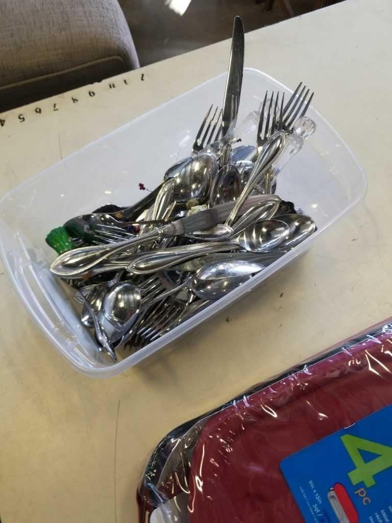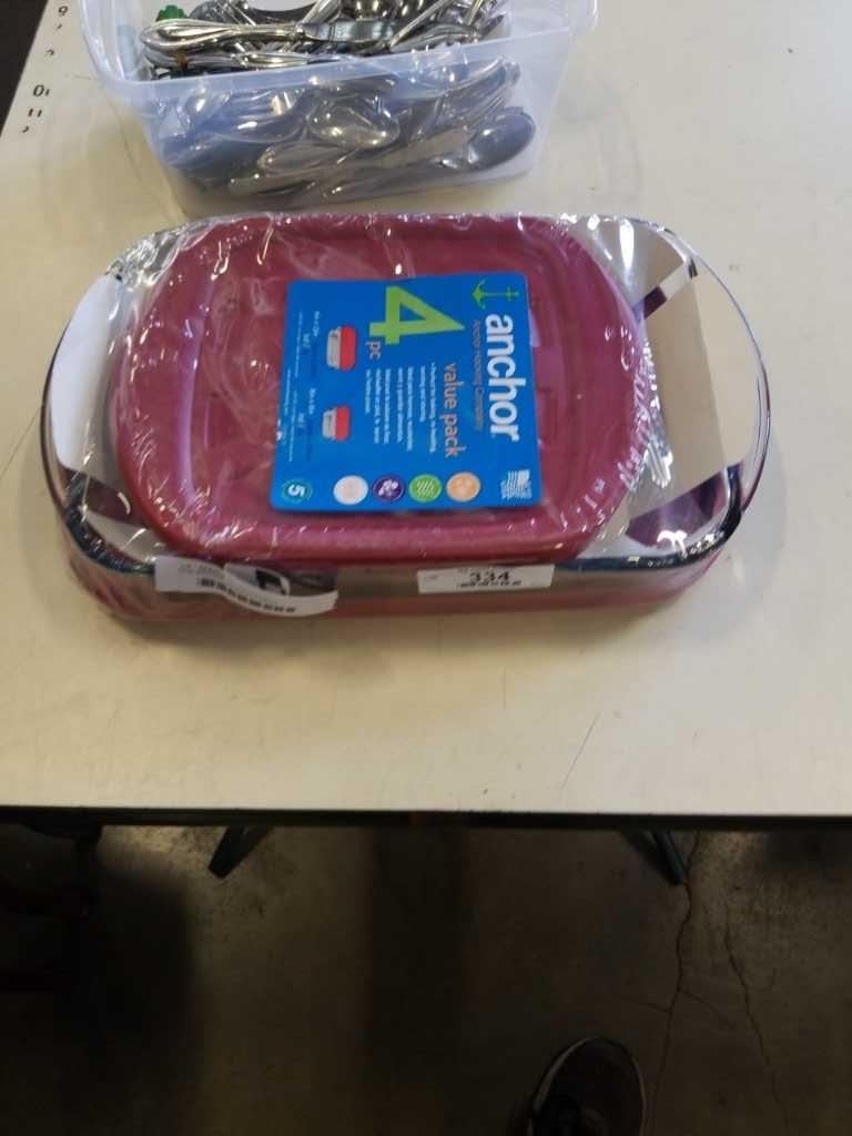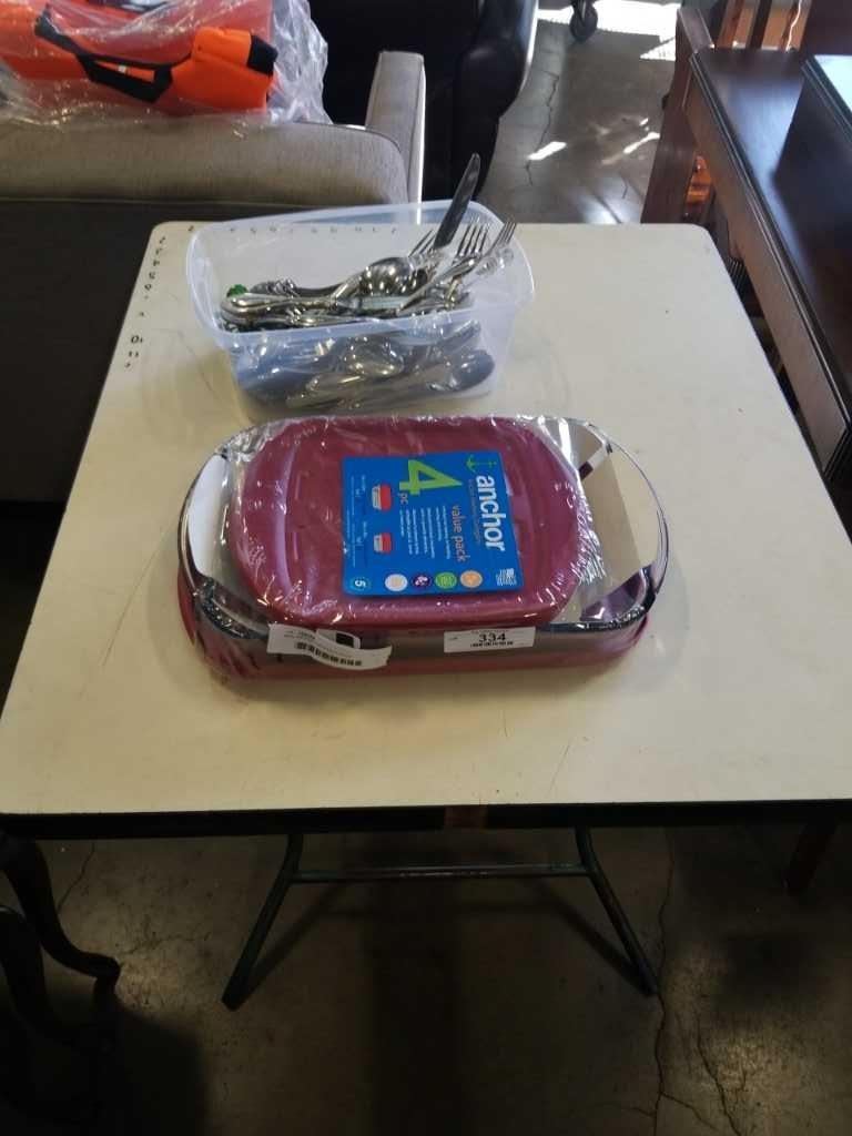 NEW ANCHOR HOCKING 4 PIECE BAKEWARE SET AND 2 TRAYS OF ONEIDA SILVERWARE