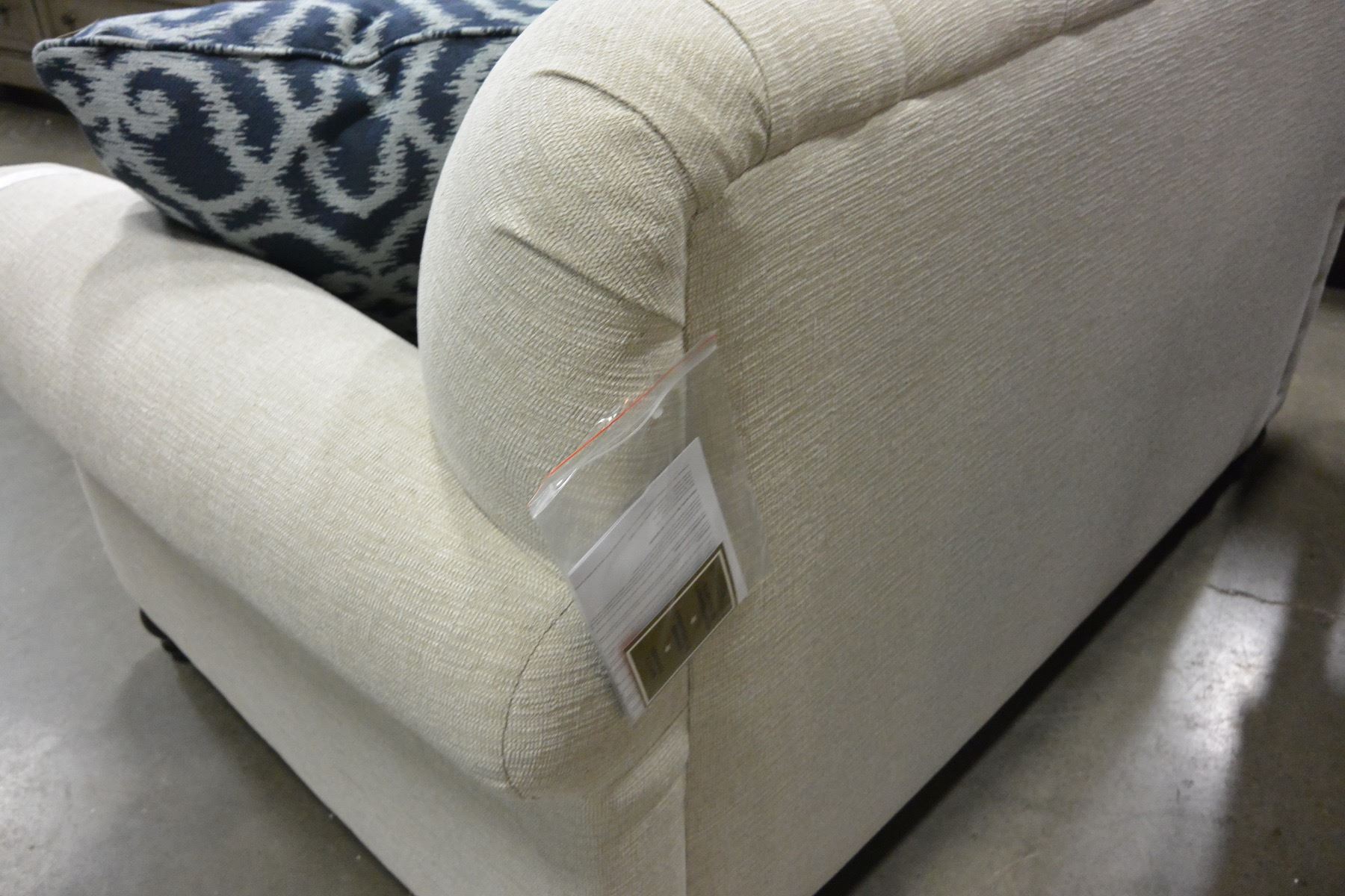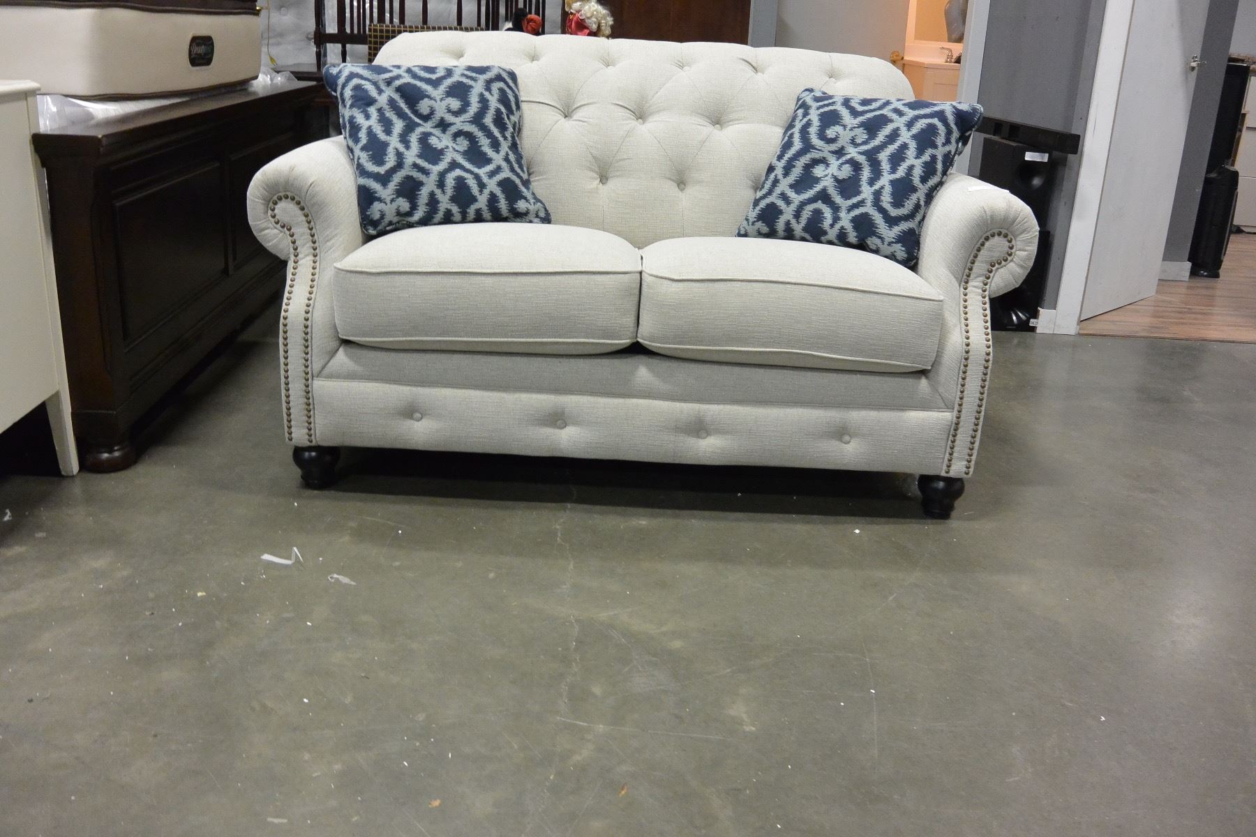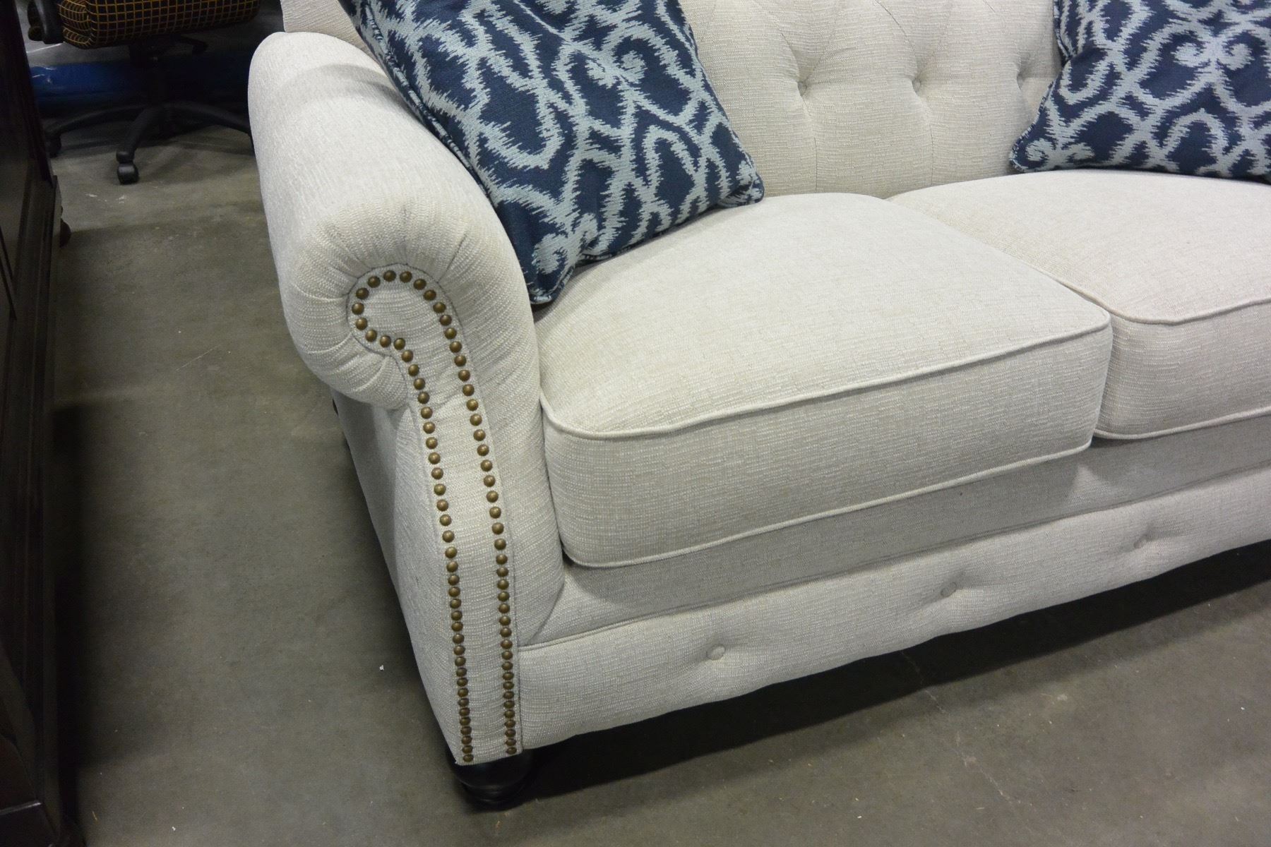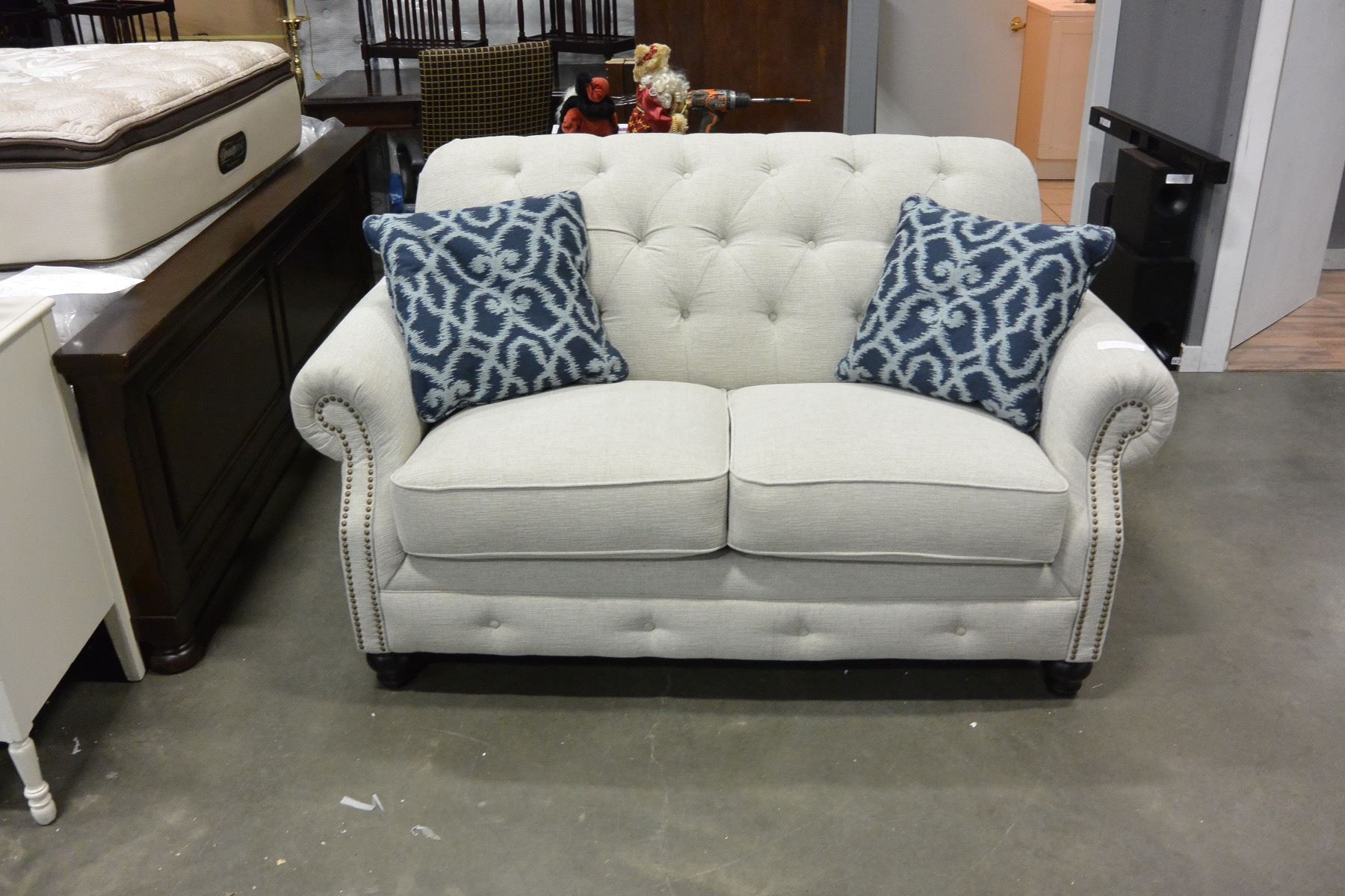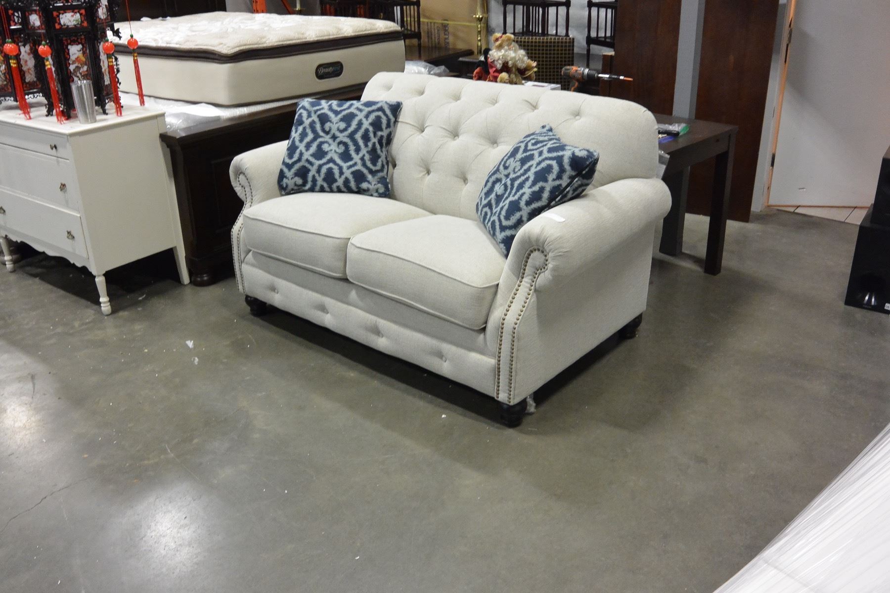 NEW ASHLEY BEIGE TUFTED FABRIC LOVESEAT WITH NAILHEAD ACCENTS, RETAIL $1699