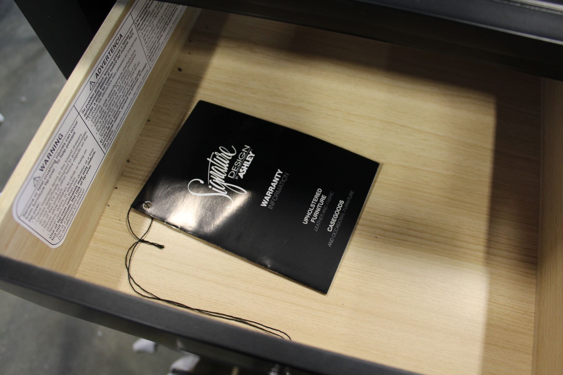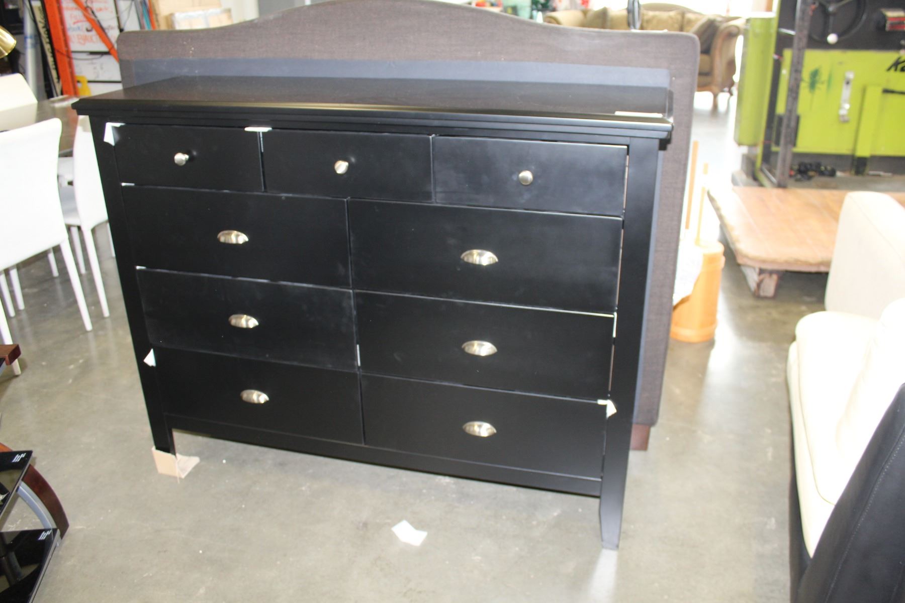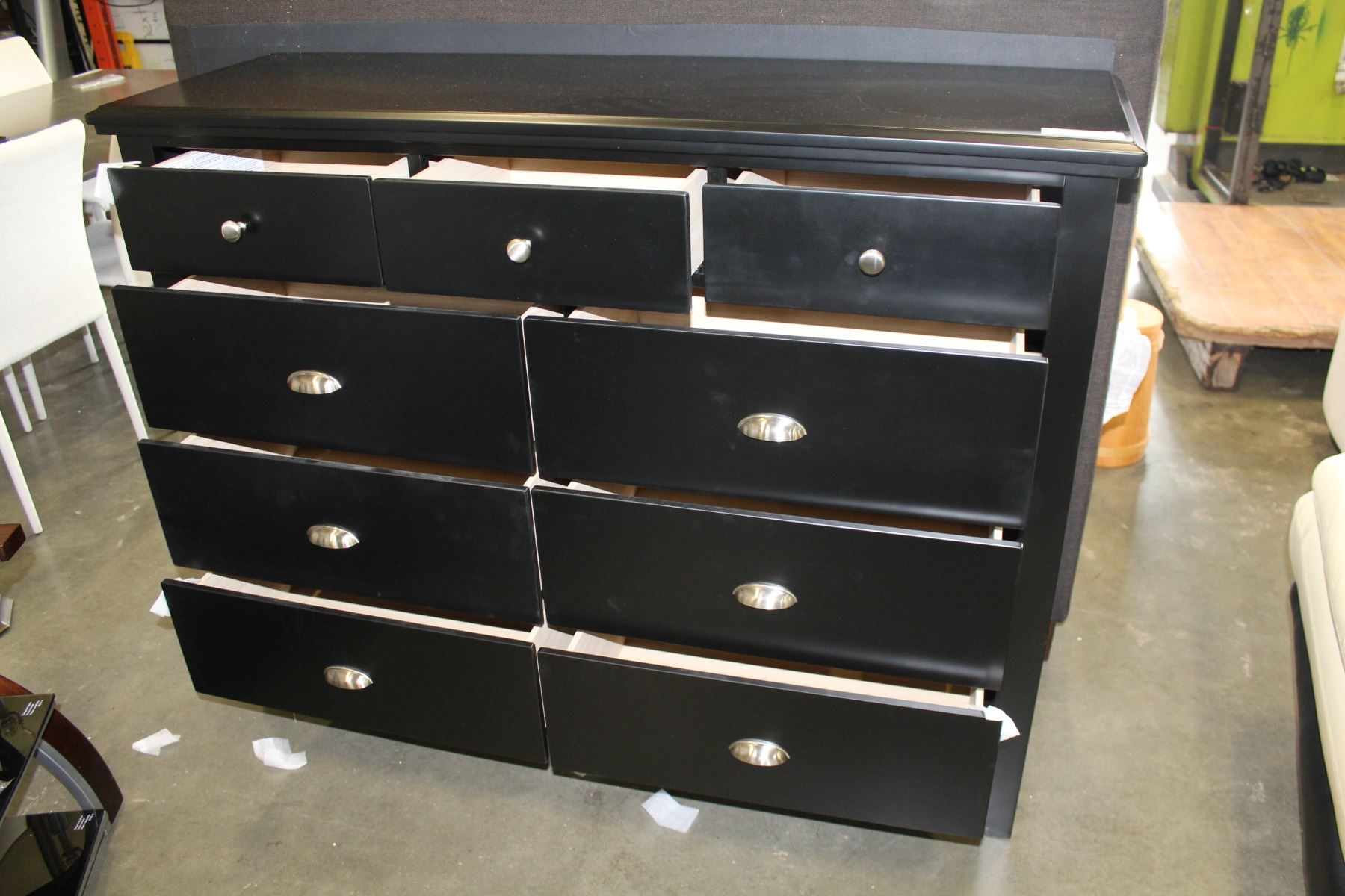 NEW ASHLEY BLACK 9 DRAWER DRESSER WITH BRUSHED CHROME DRAWER PULLS, RETAIL $1199