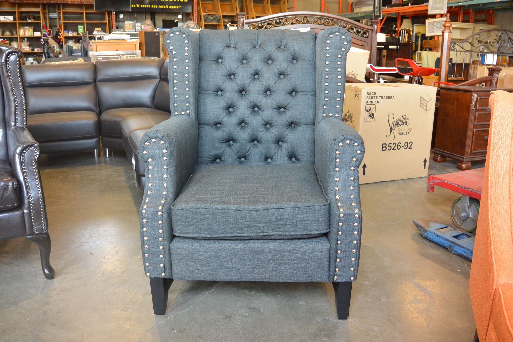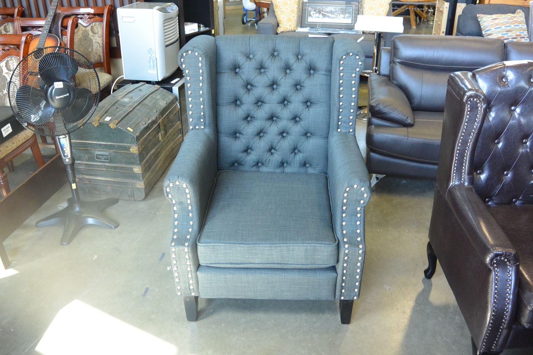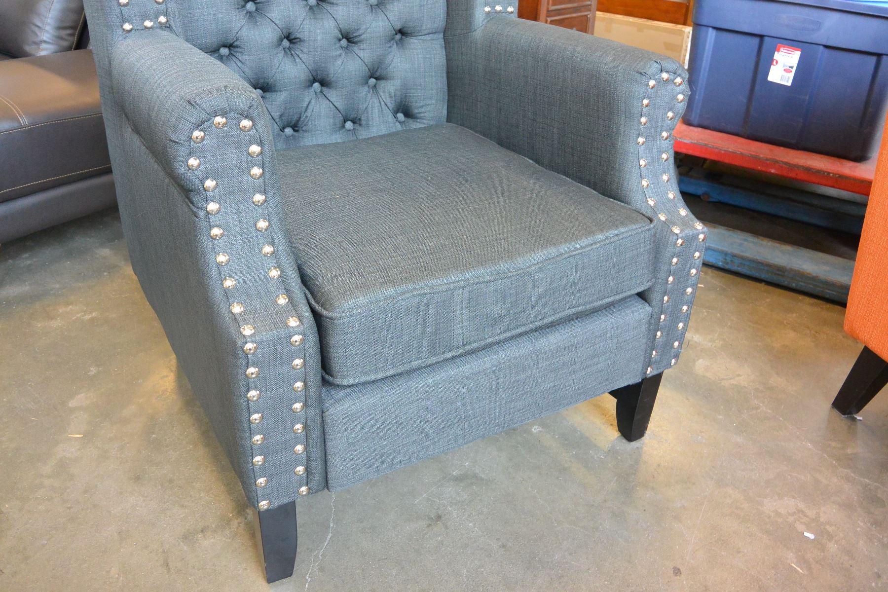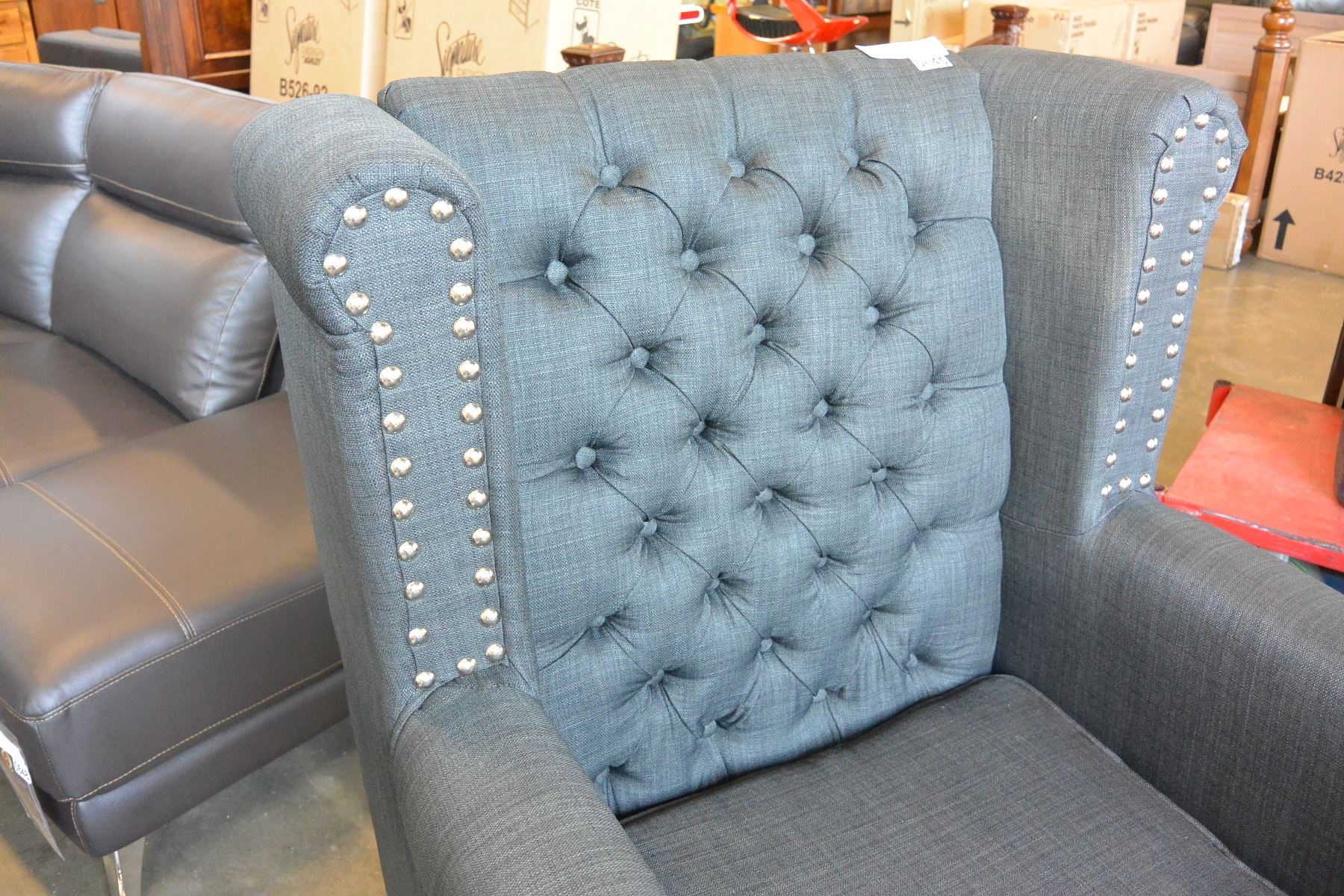 NEW ASHLEY CHARCOAL ACCENT CHAIR, MODERN TUFTED WITH NAIL HEAD FABRIC DESIGN RETAIL $1,398