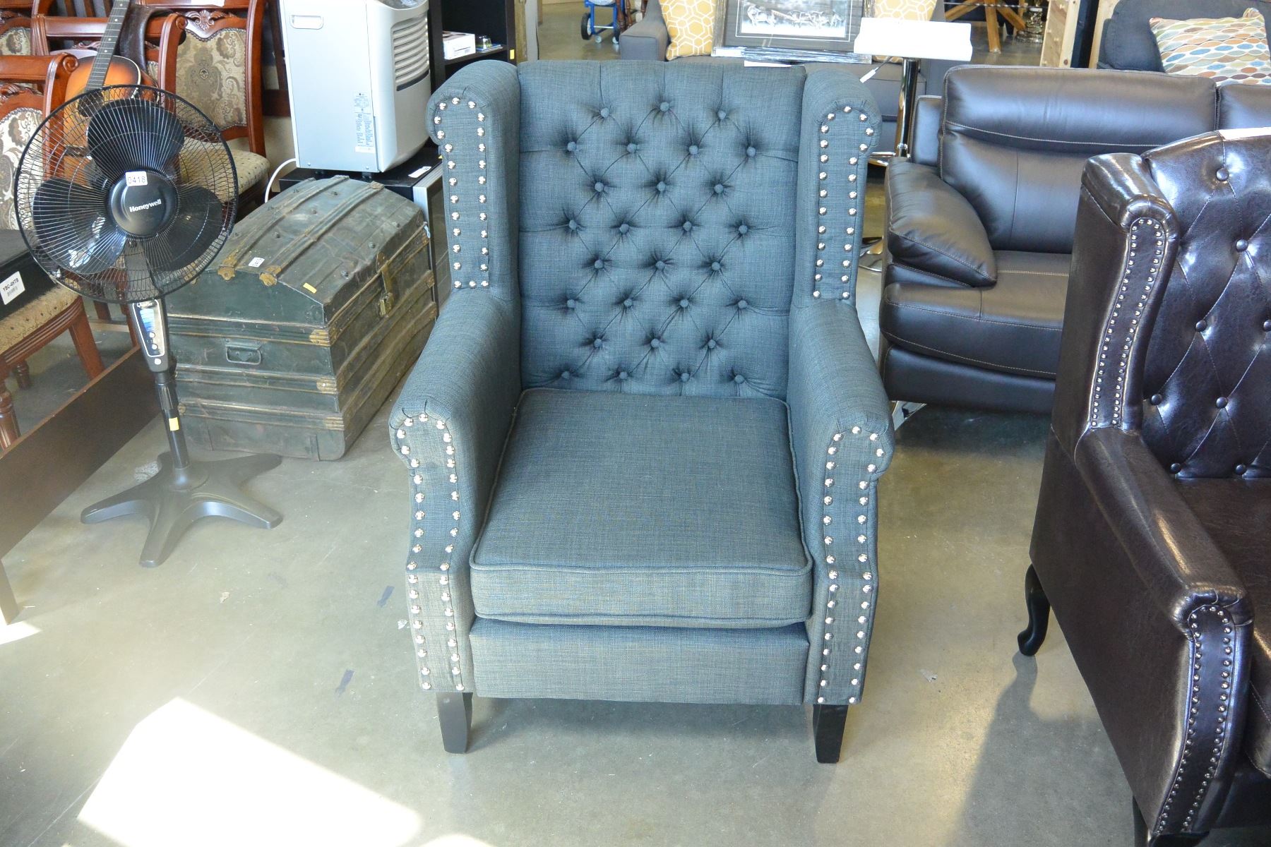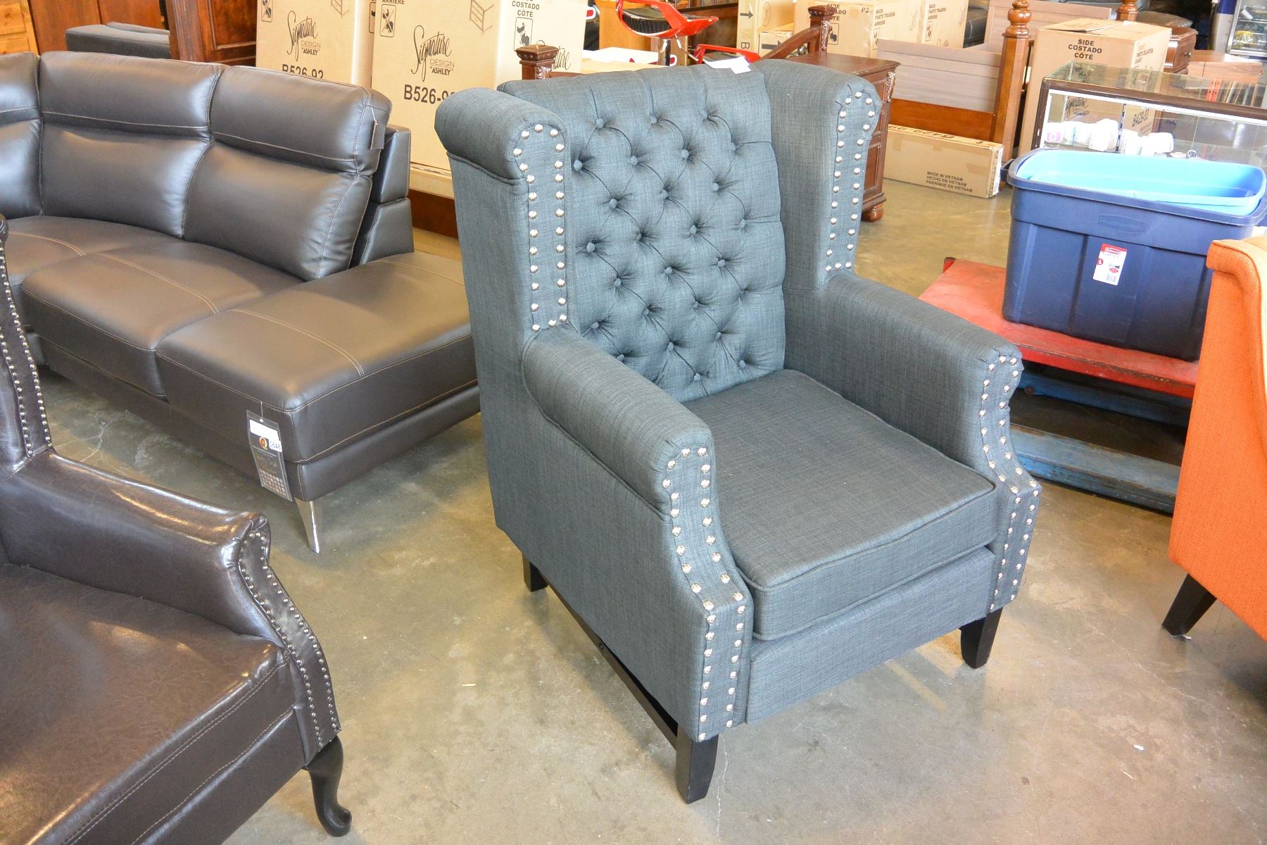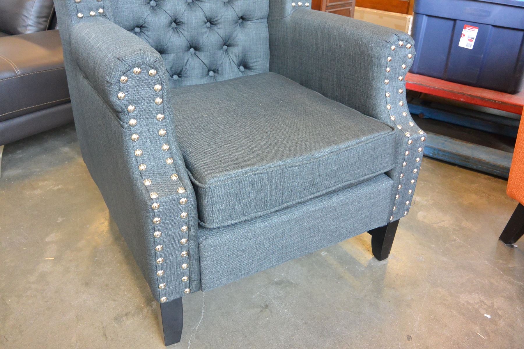 NEW ASHLEY CHARCOAL ACCENT CHAIR, MODERN TUFTED WITH NAIL HEAD FABRIC DESIGN RETAIL $1,398