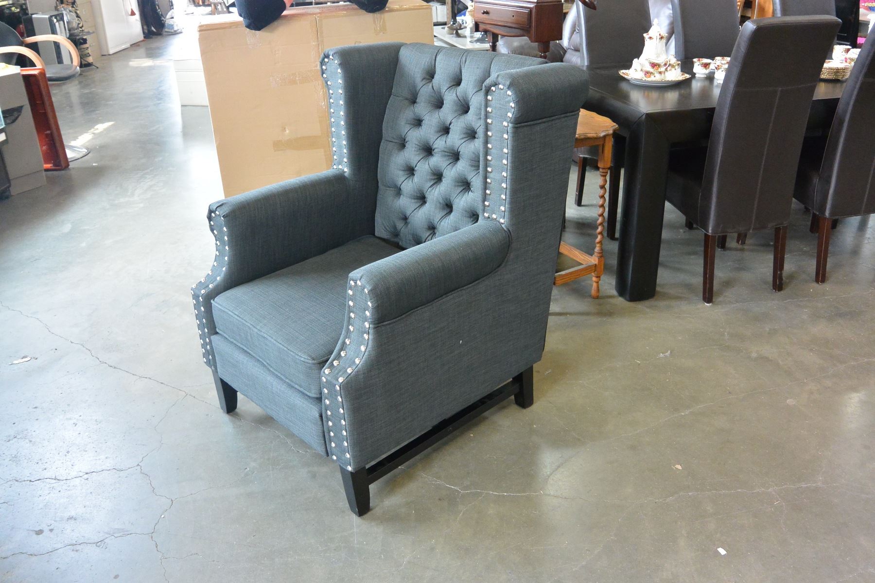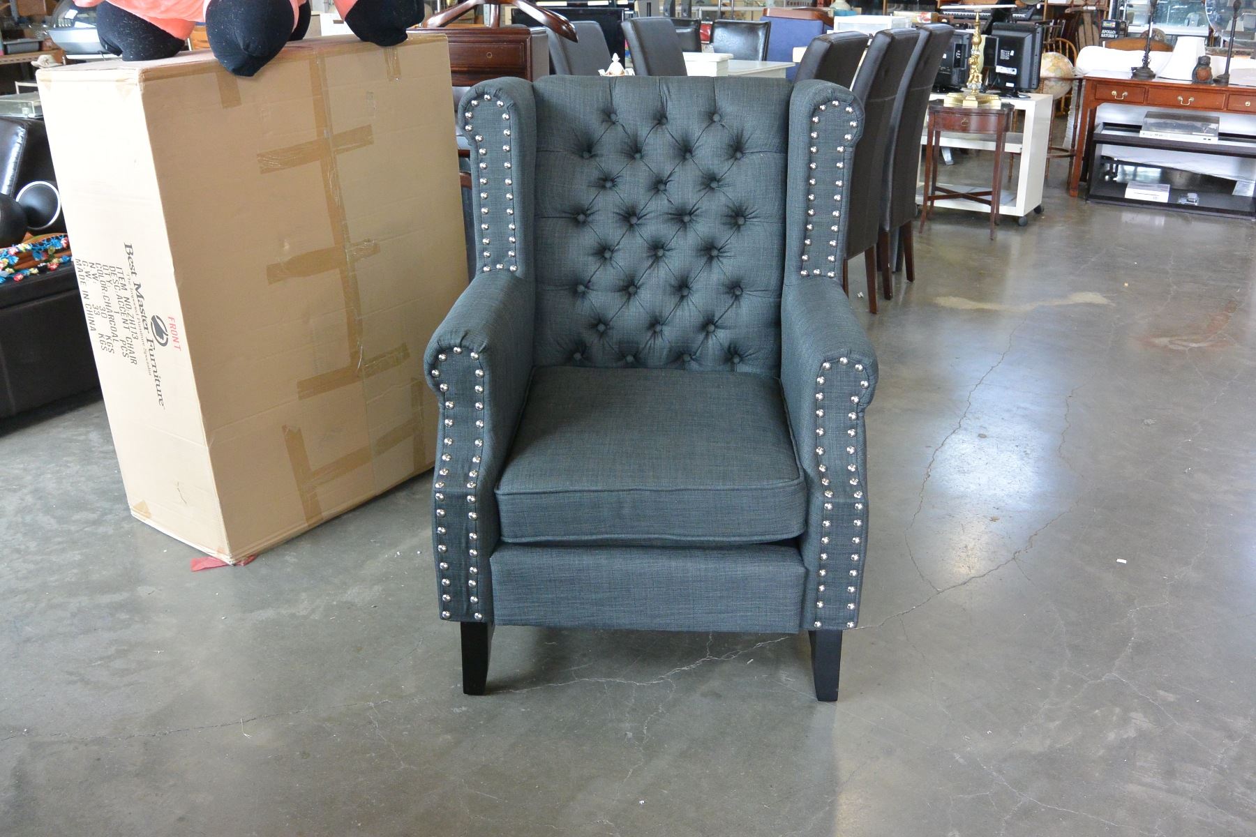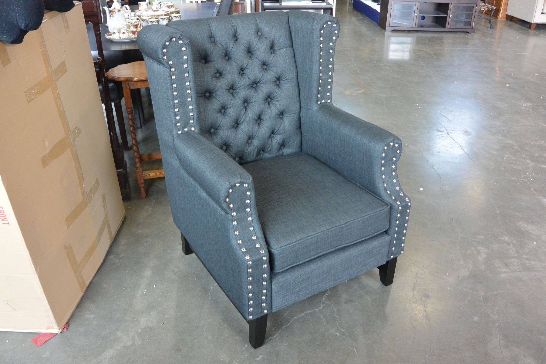 NEW ASHLEY CHARCOAL ACCENT CHAIR, TUFTED WITH NAILHEAD, WINGBACK DESIGN RETAIL $1398