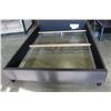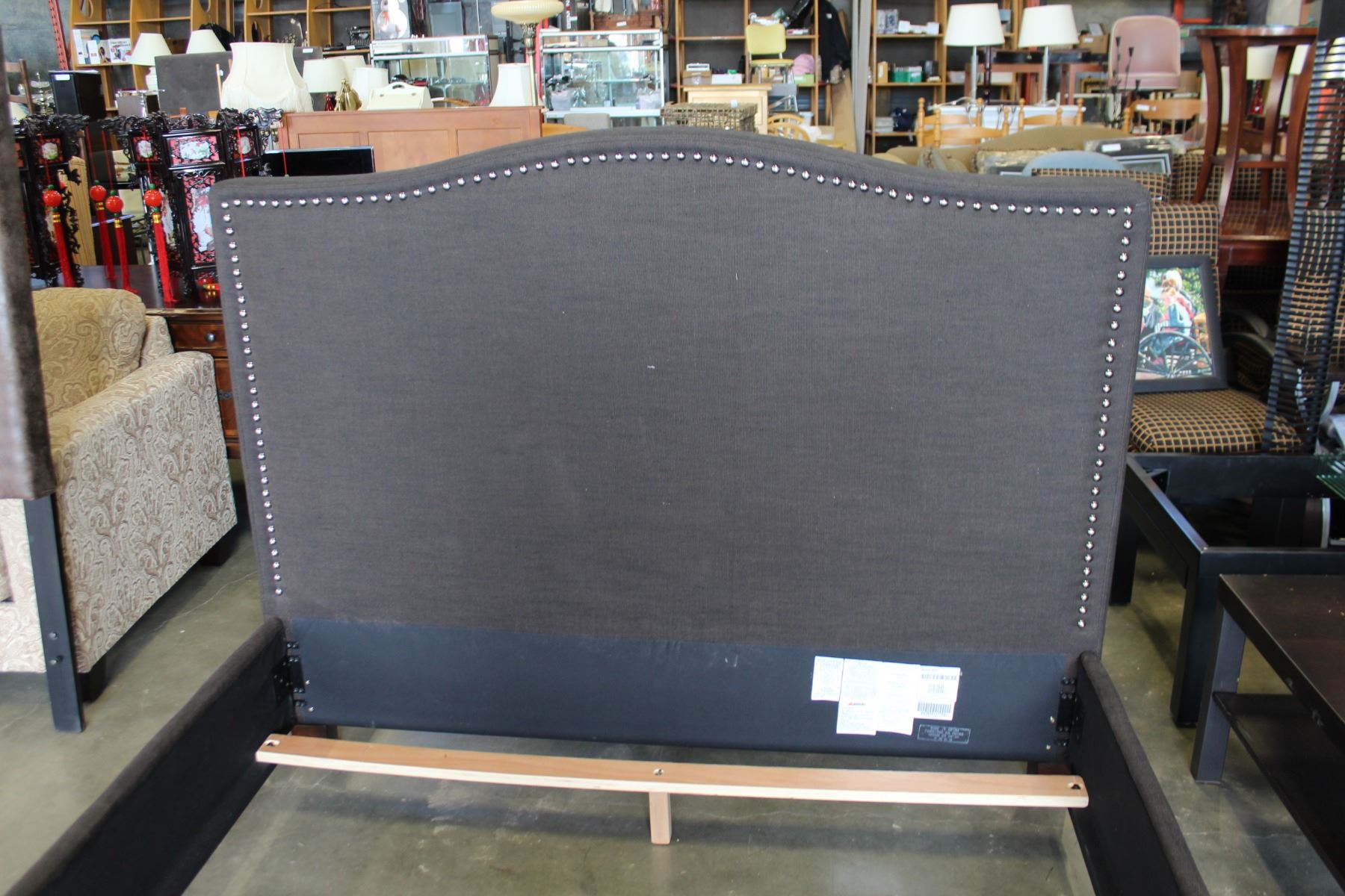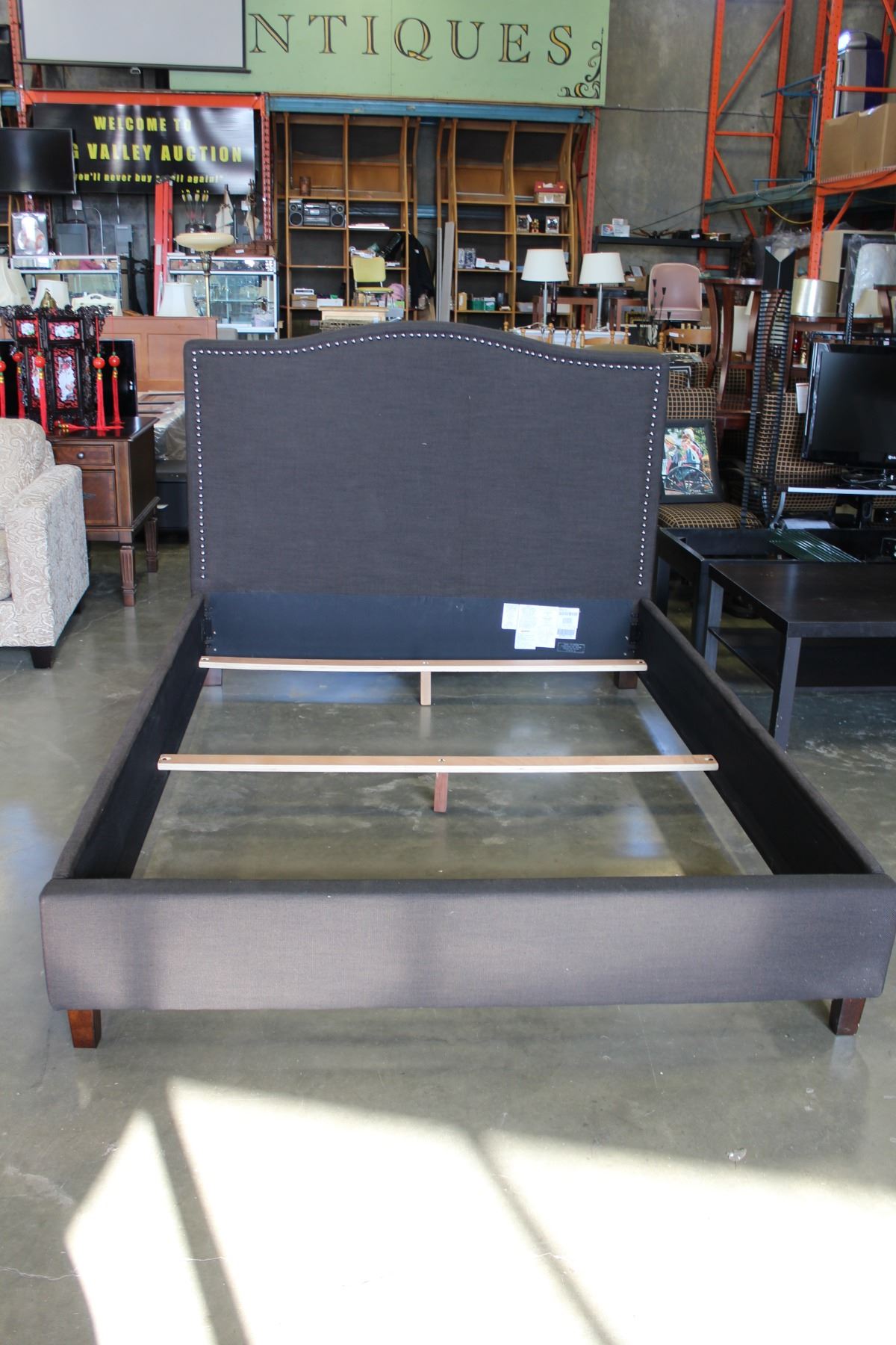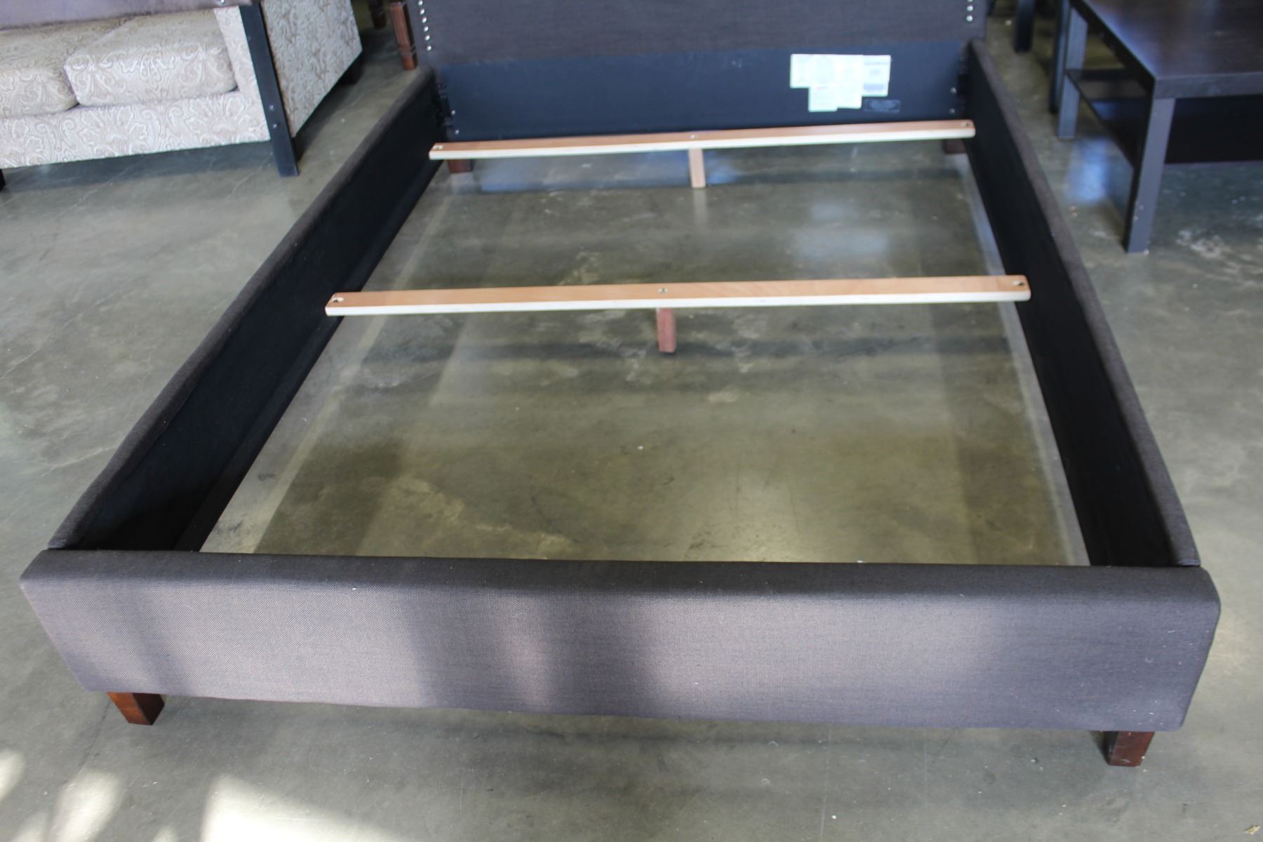 NEW ASHLEY CONTEMPORARY GREY FABRIC QUEENSIZE PLATFORM BEDFRAME WITH NAILHEAD ACCENT, RETAIL $ 1199