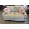 NEW ASHLEY CONTEMPORARY TAN FABRIC SOFA AND LOVESEAT WITH BRASS NAILHEAD AND 6 THROW PILLOWS RETAIL