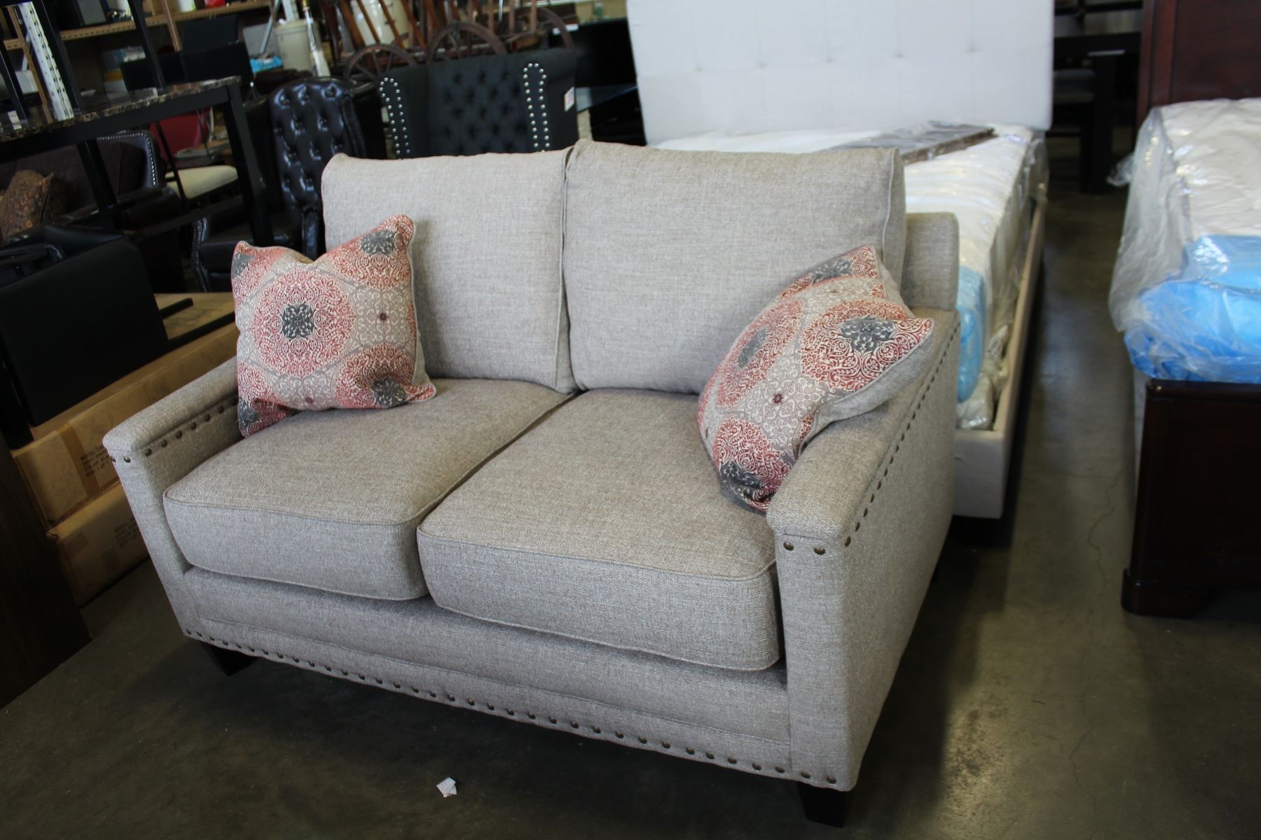 NEW ASHLEY FURNITURE BEIGE CONTEMPORARY LOVE SEAT W/ NAILHEAD ACCENT - RETAIL $1,299