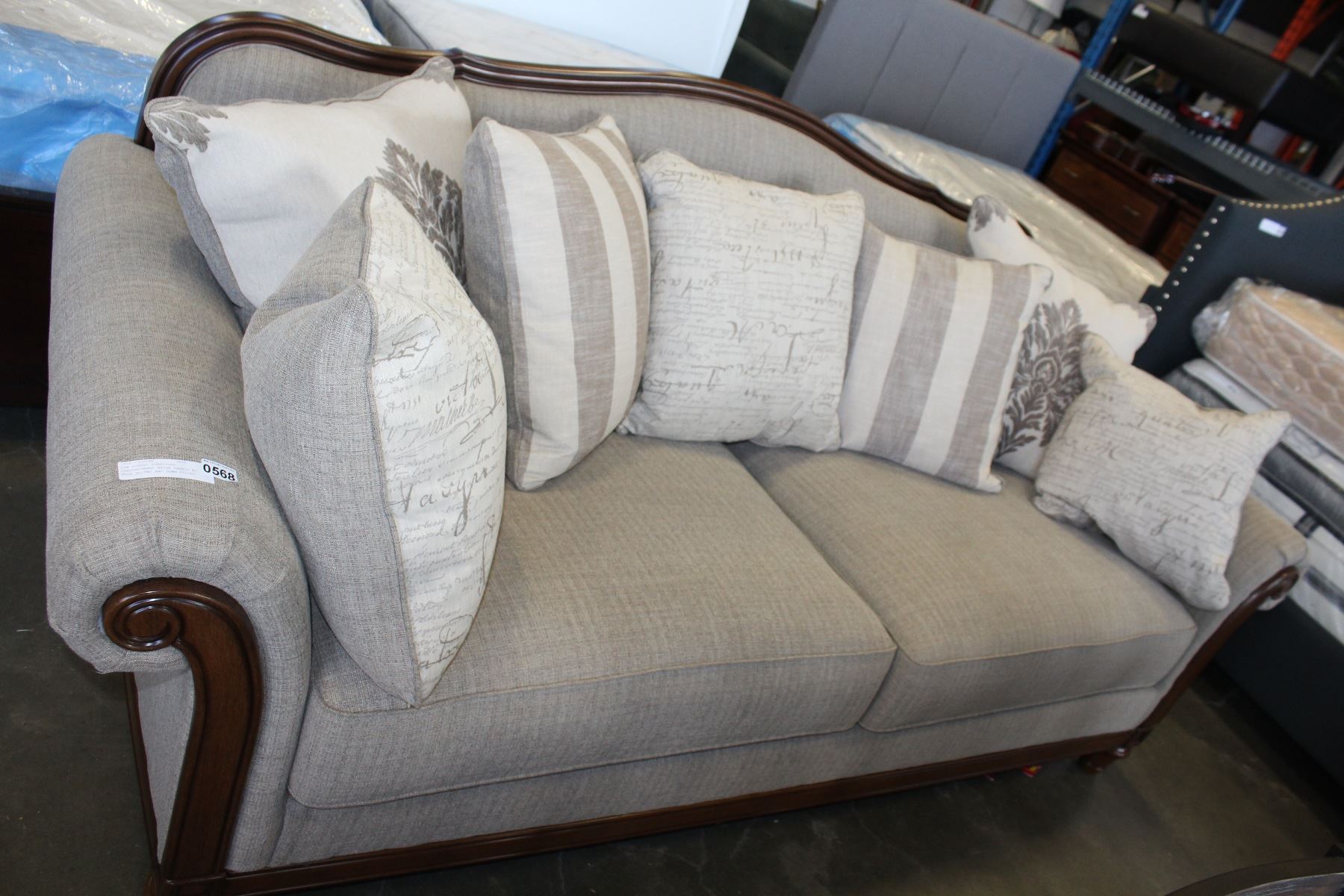 NEW ASHLEY FURNITURE CONTEMPORARY BEIGE FABRIC W/ WOOD ACCENT AND DOWN FILLED CUSHIONS - RETAIL $1,6