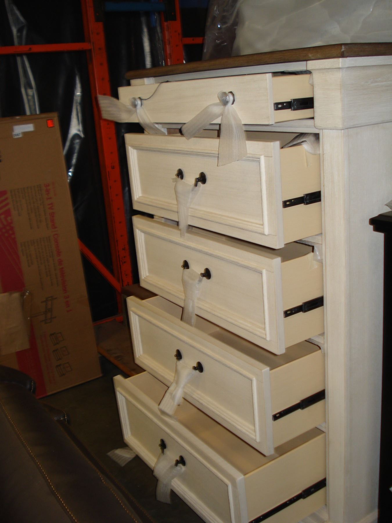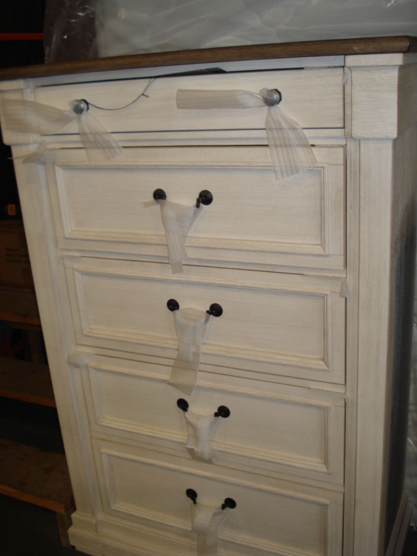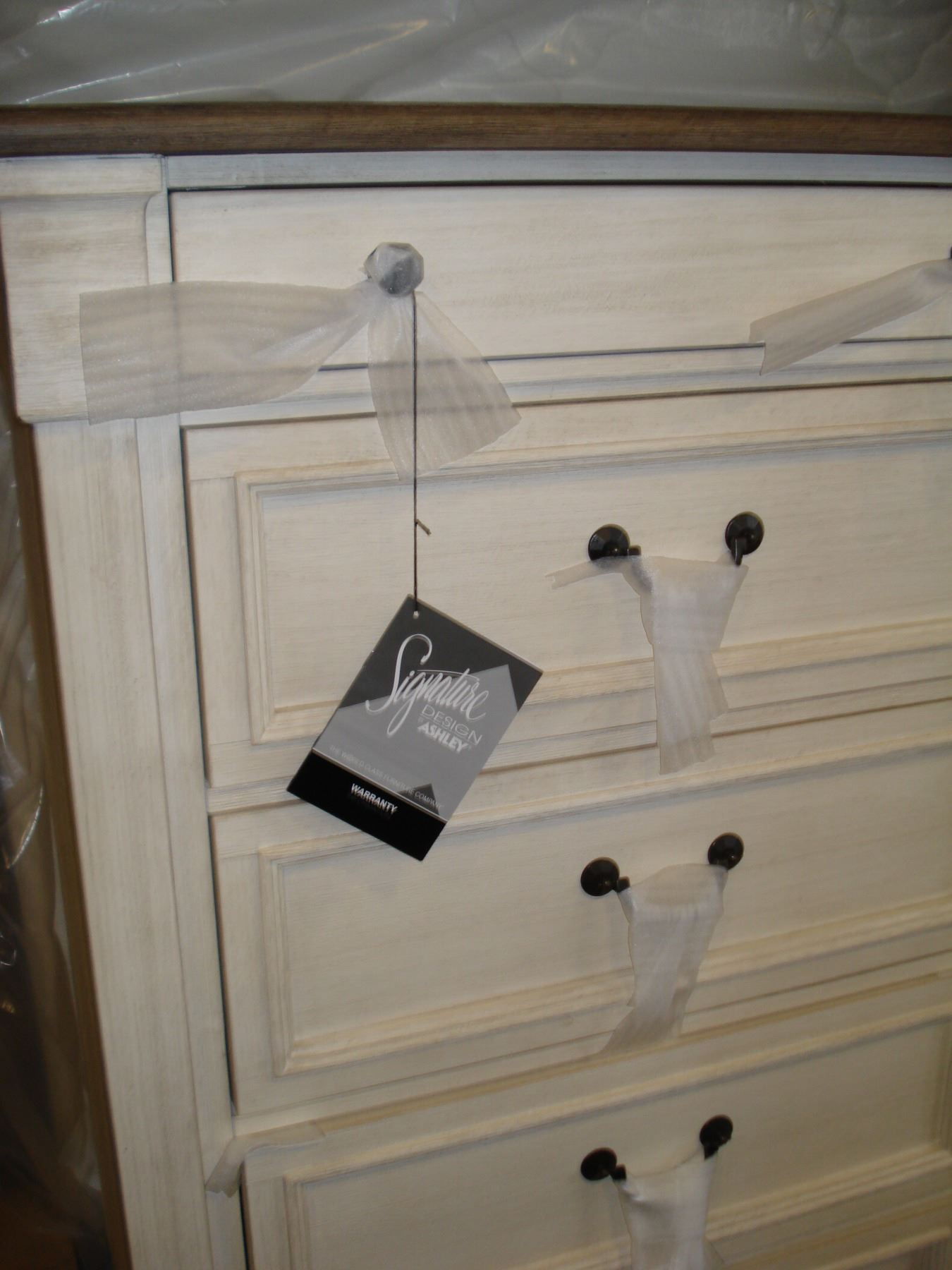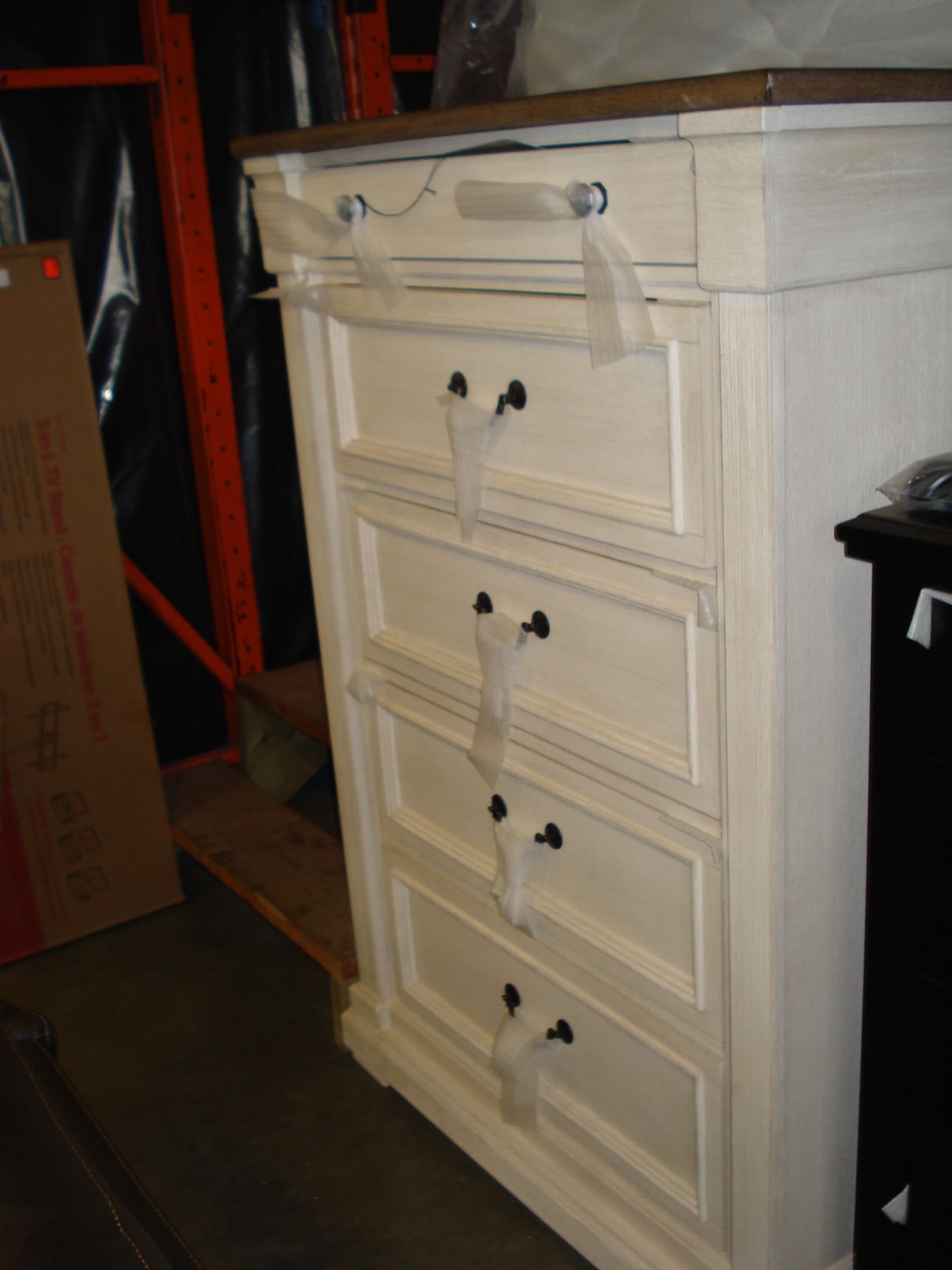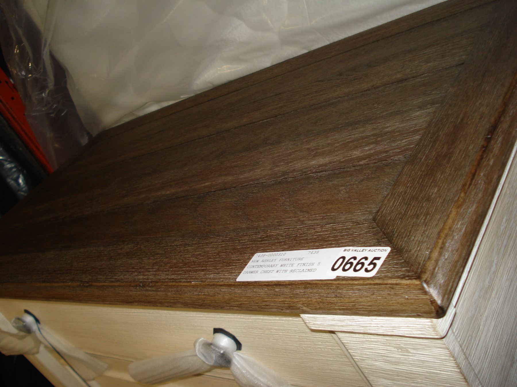 NEW ASHLEY FURNITURE CONTEMPORARY WHITE FINISH 5 DRAWER CHEST WITH RECLAIMED TOP, RETAIL $1899