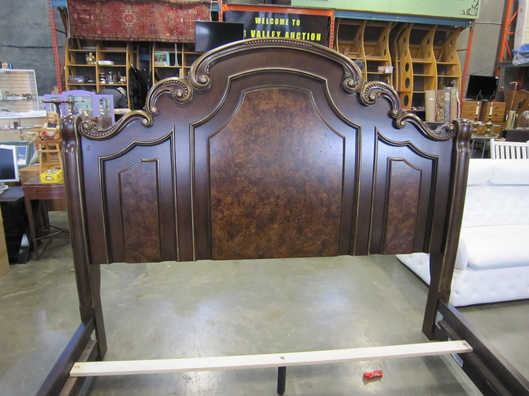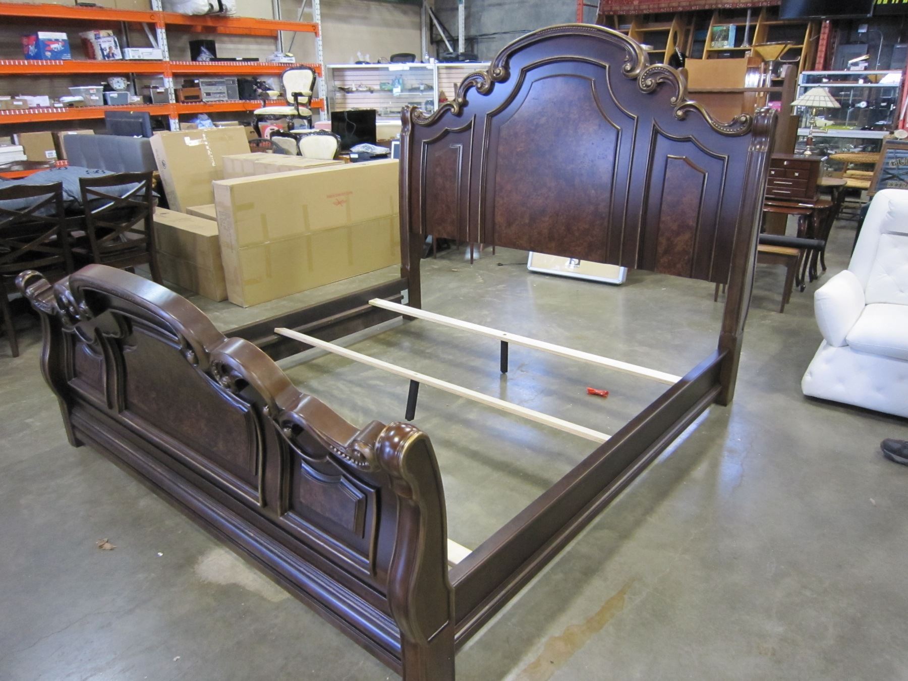 NEW ASHLEY KINGSIZE CARVED BURLED MAHOGANY SLEIGH BEDFRAME RETAIL $3,999 FLOOR MODEL