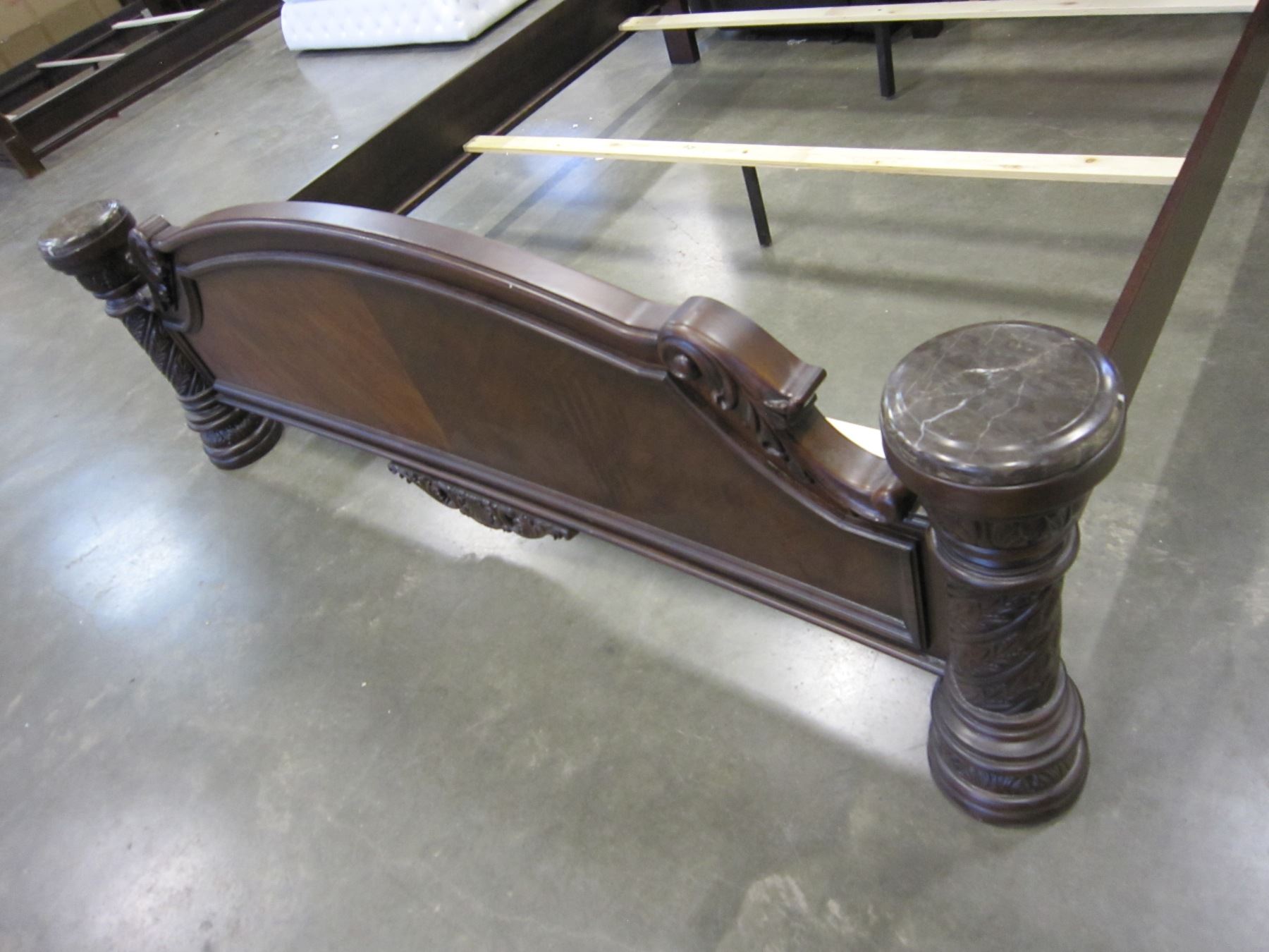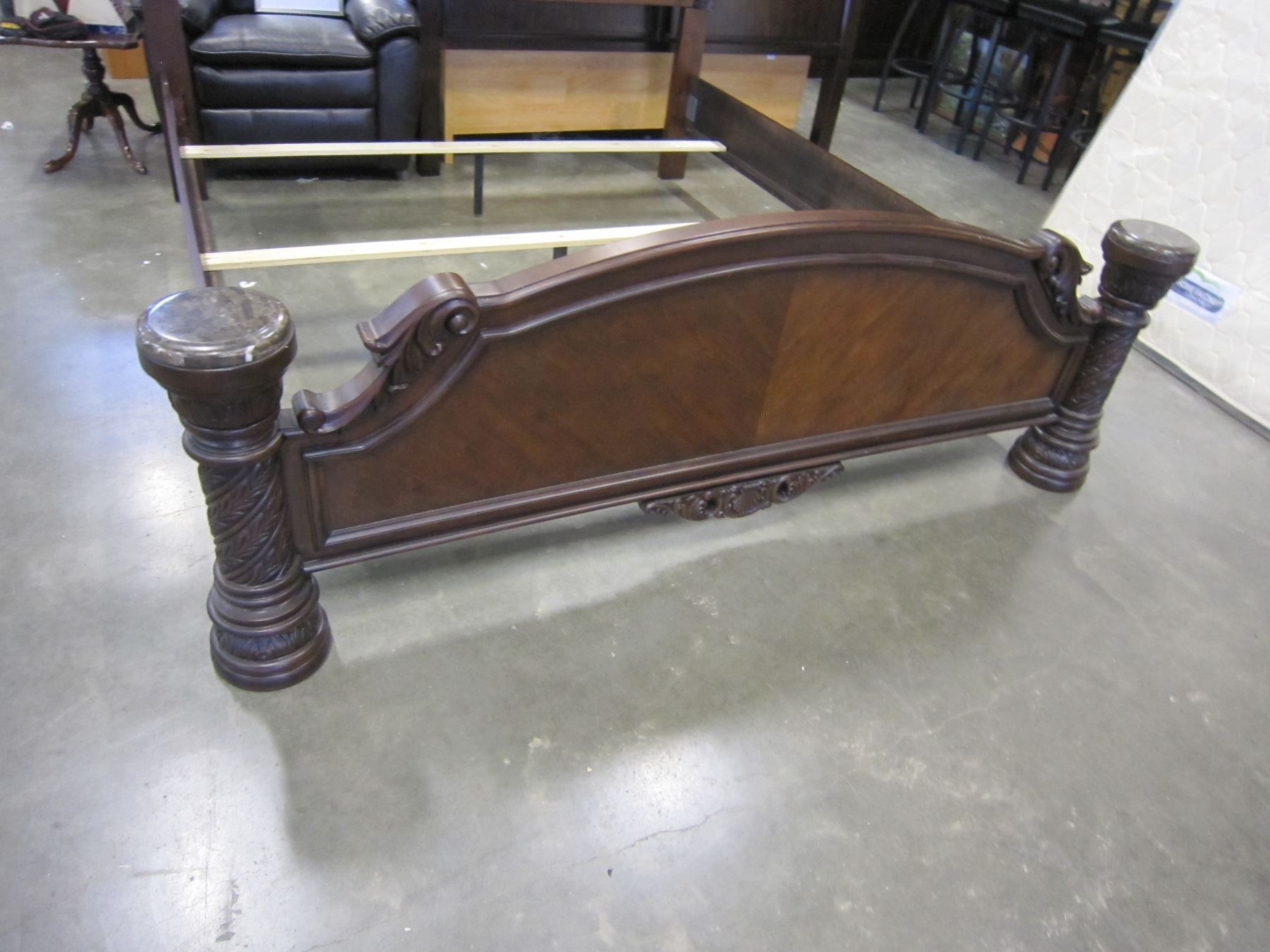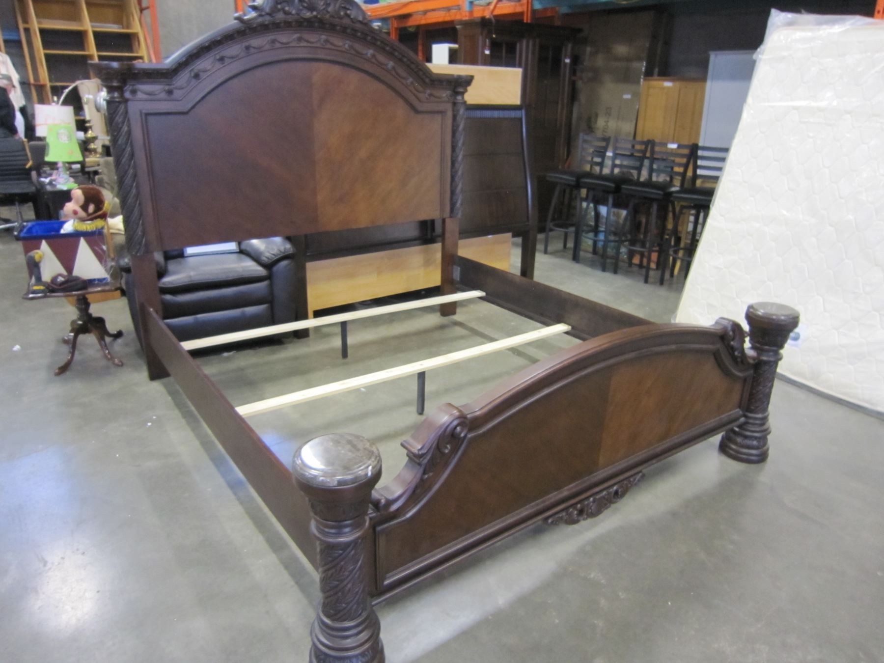 NEW ASHLEY KINGSIZE CARVED MAHOGANY PANEL BEDFRAME WITH PILLAR STYLE FOOTBOARD, RETAIL $3499, FLOOR