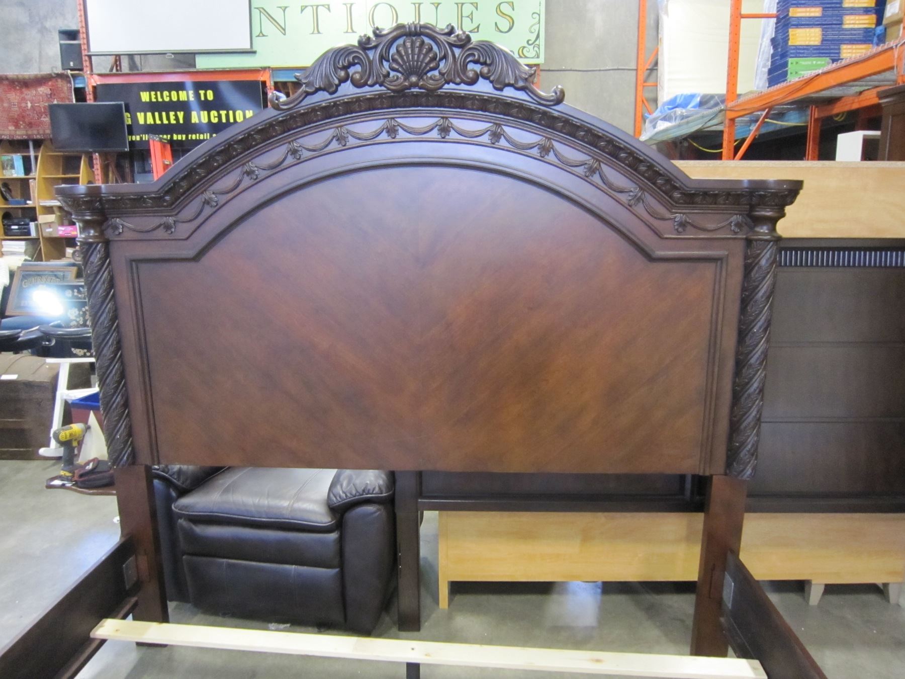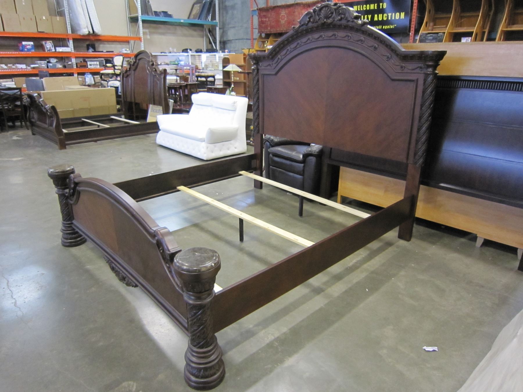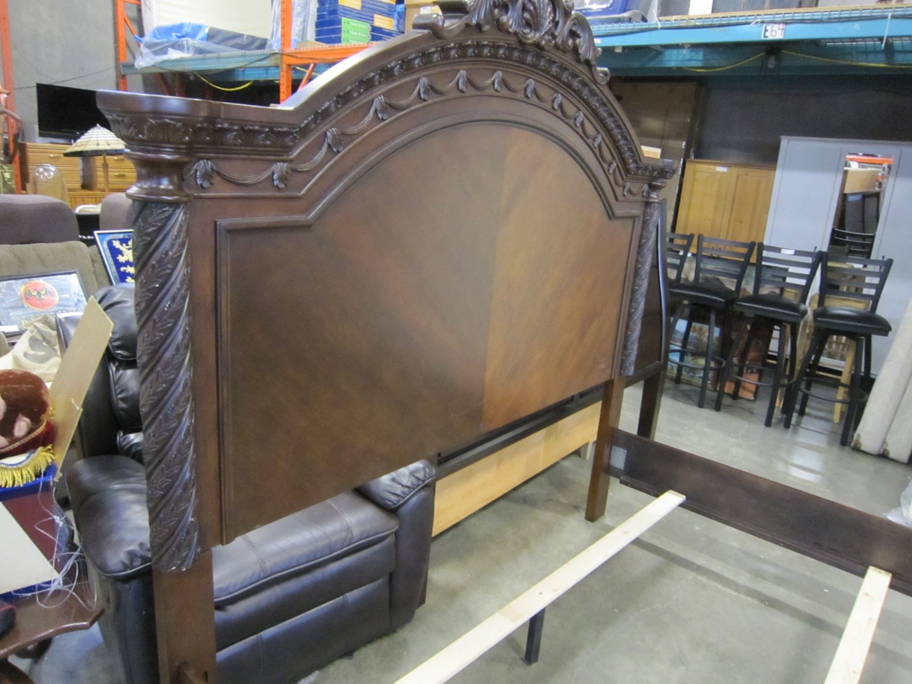 NEW ASHLEY KINGSIZE CARVED MAHOGANY PANEL BEDFRAME WITH PILLAR STYLE FOOTBOARD, RETAIL $3499, FLOOR