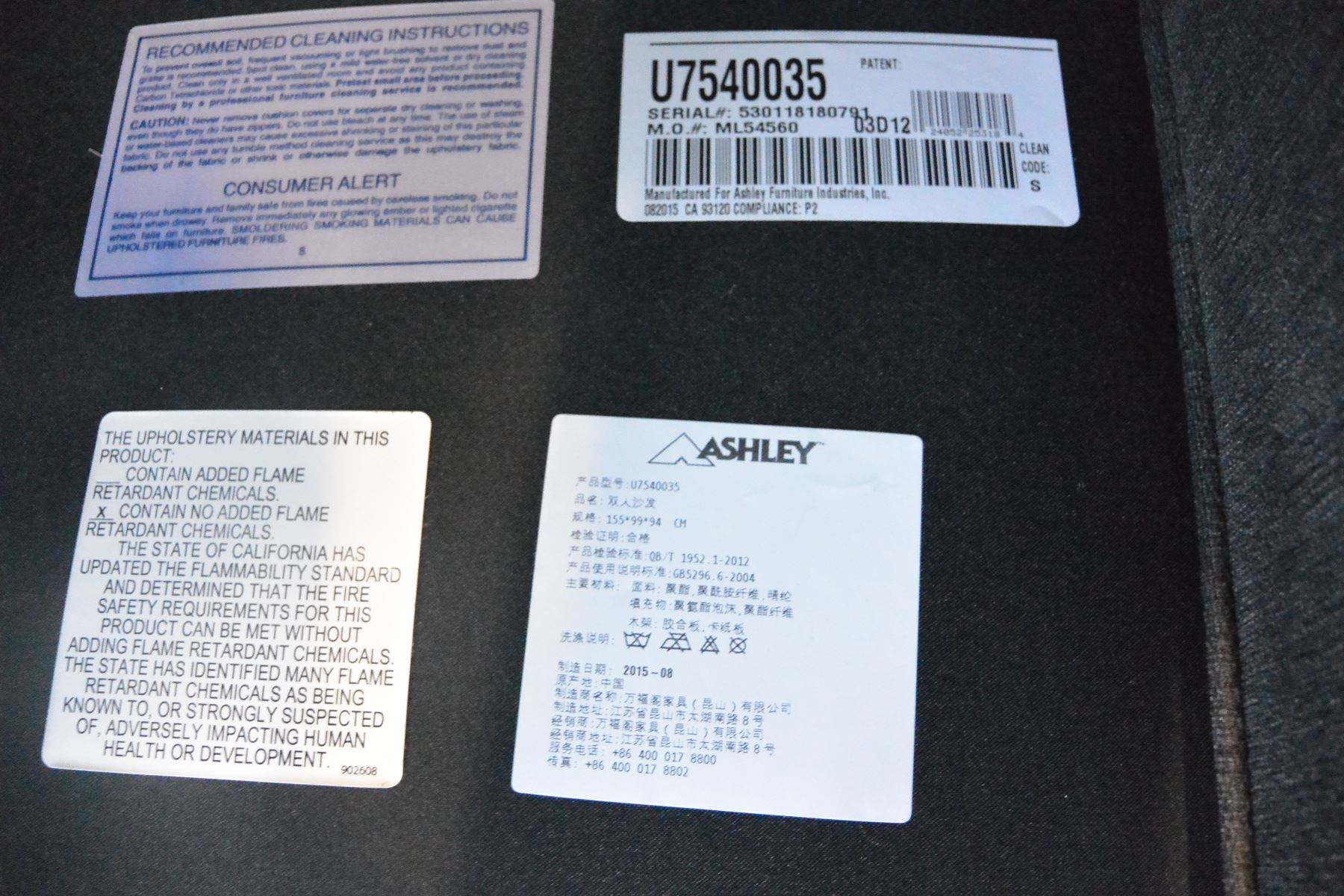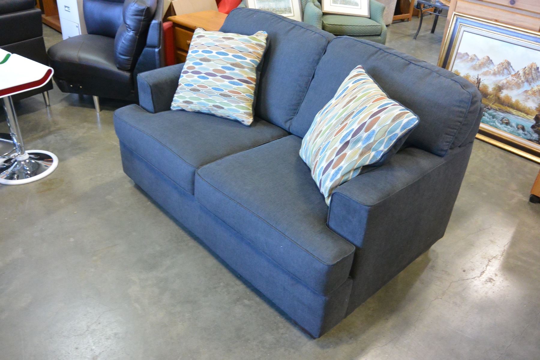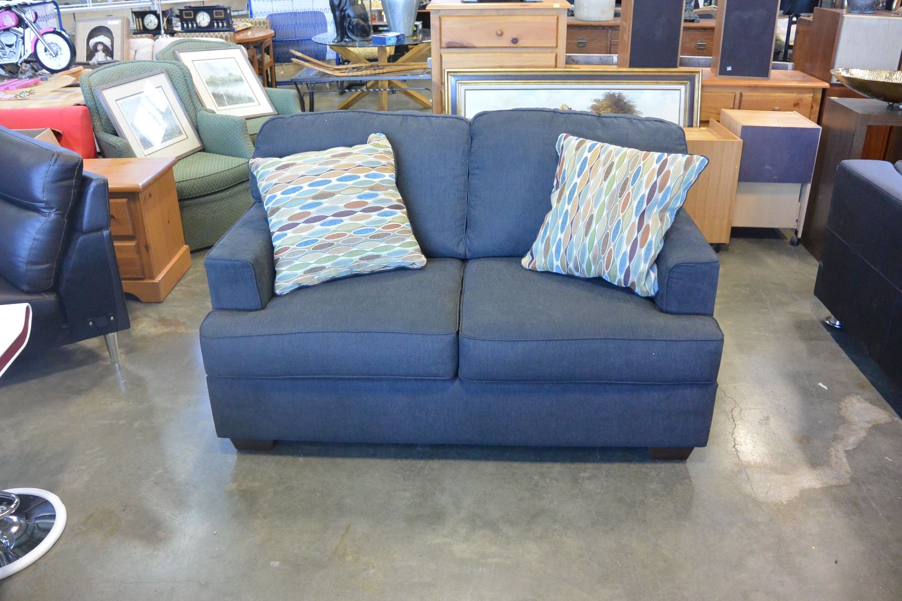 NEW ASHLEY SIGANTURE DESIGN MODERN GREY FABRIC LOVESEAT WITH 2 ACCENT PILLOWS, RETAIL $1,499