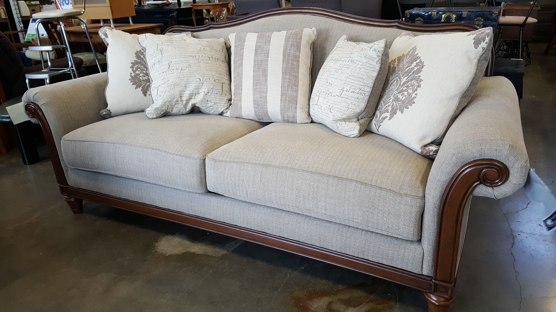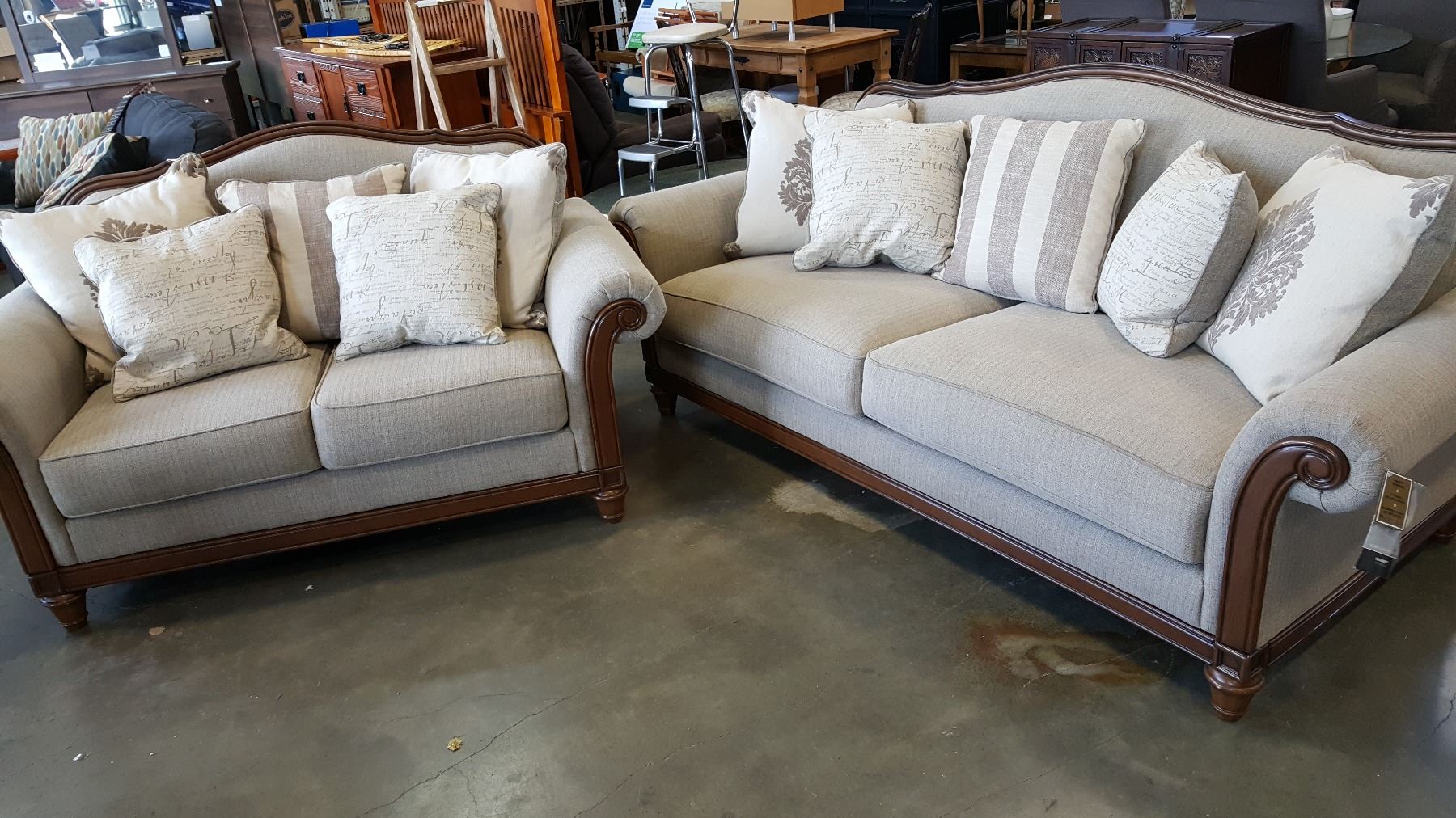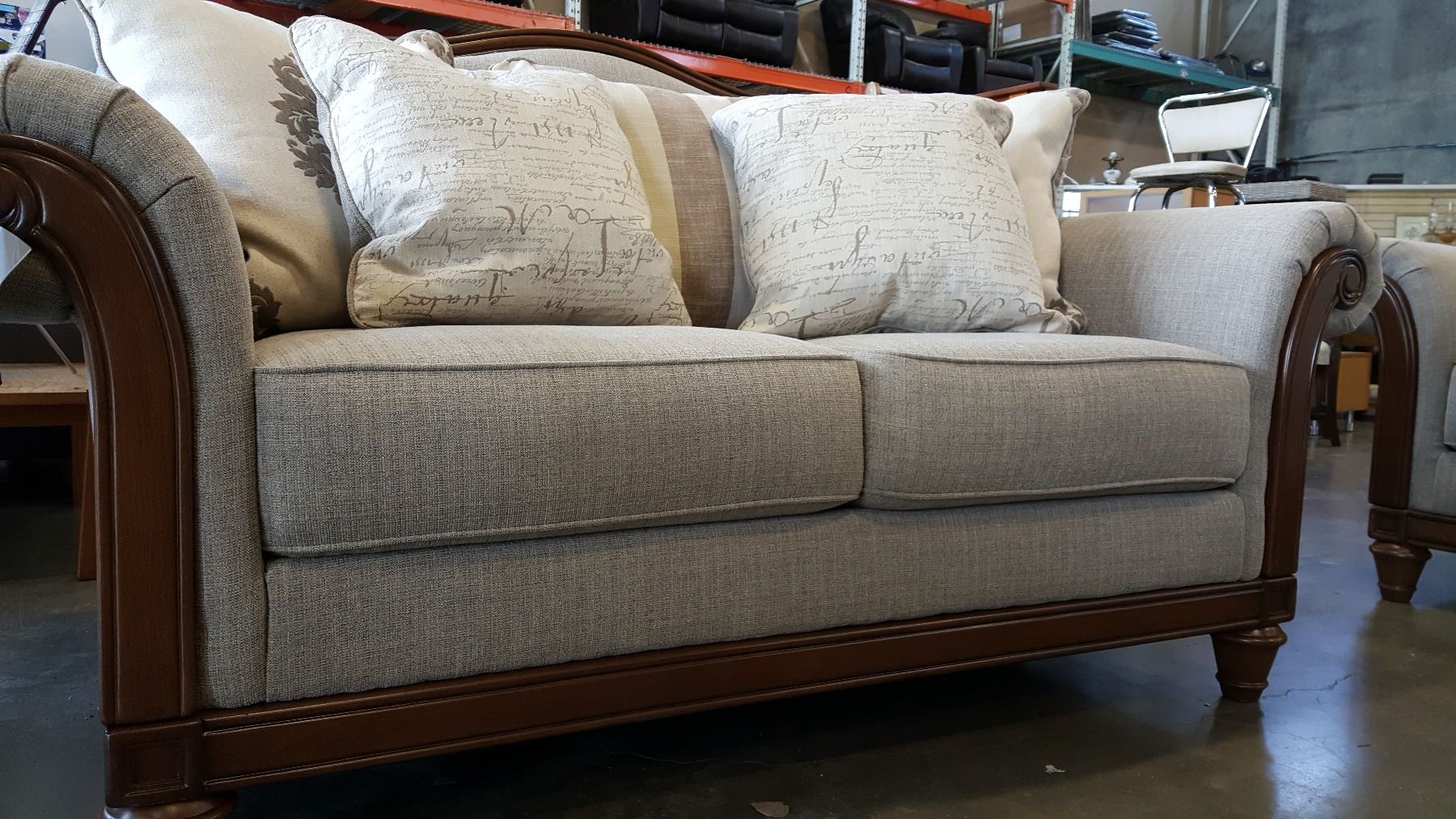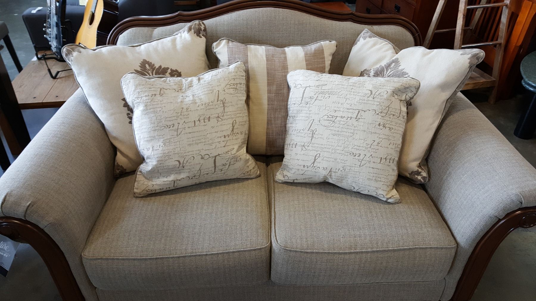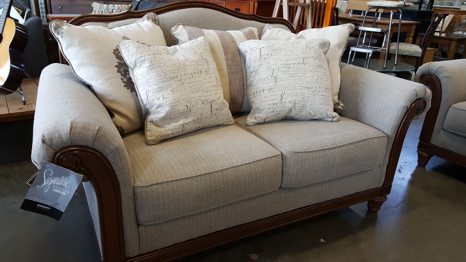 NEW ASHLEY SIGNATURE DESIGN CONTEMPORARY ROLLED ARM WOOD FRAMED SOFA, LOVESEAT AND THROW PILLOWS, RE