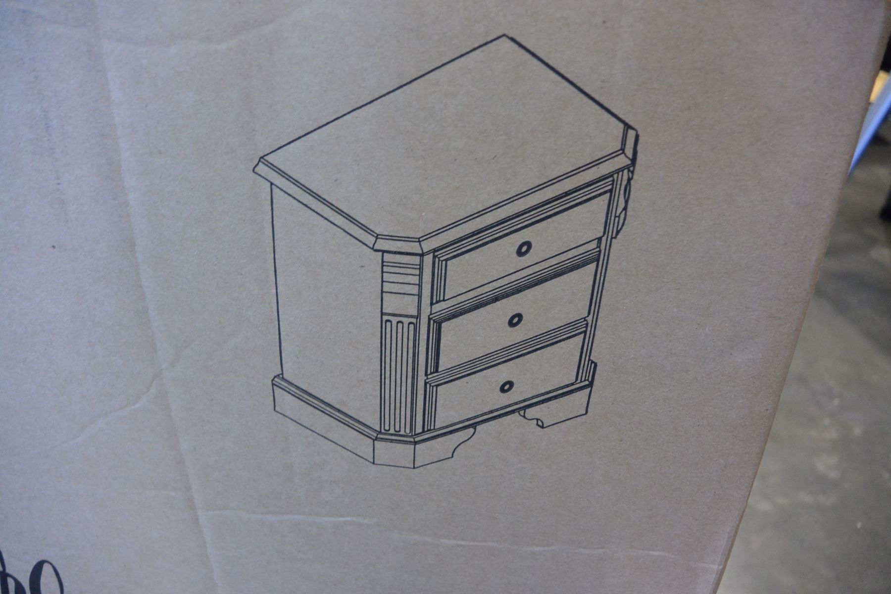 NEW ASHLEY SIGNATURE DESIGN KING SIZE POSTER BEDFRAME, MEDIUM BROWN CHERRY STAIN, AND PAIR OF 3 DRAWER NIGHSTANDS, RETAIL $1621
