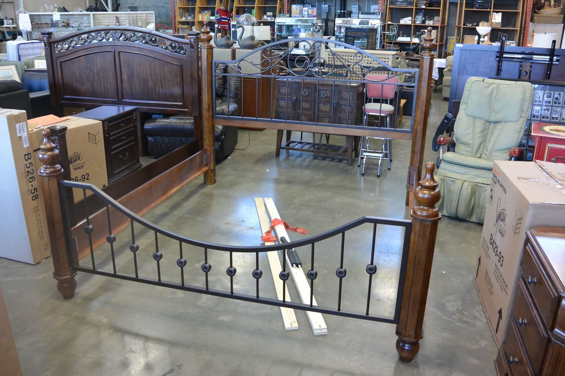 NEW ASHLEY SIGNATURE DESIGN KING SIZE POSTER BEDFRAME, MEDIUM BROWN CHERRY STAIN, AND PAIR OF 3 DRAW