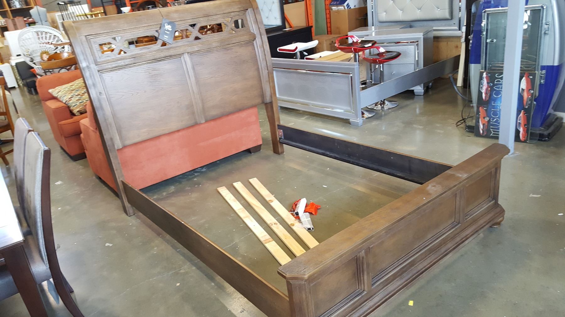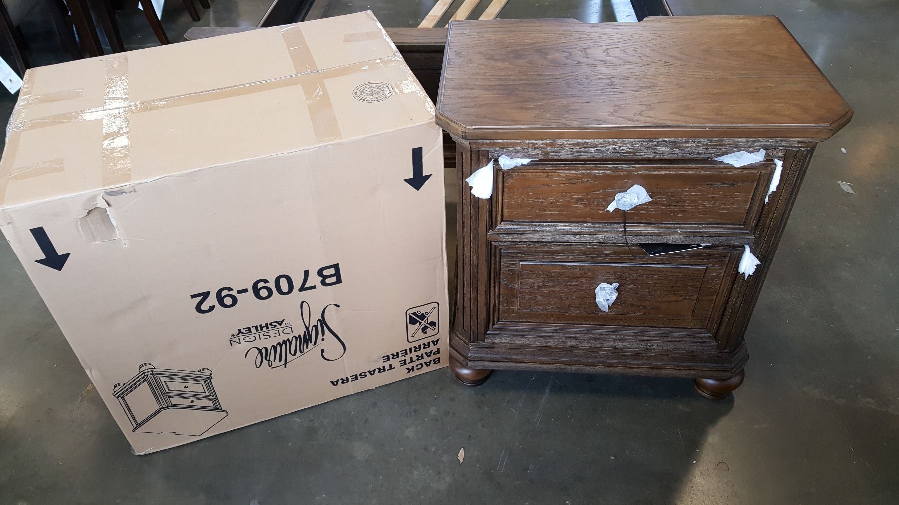 NEW ASHLEY SIGNATURE DESIGN QUEENSIZE SLEIGH STYLE BEDFRAME, AND PAIR OF 2 DRAWER NIGHT STANDS, WITH POWER AND USB OUTLETS, RETAIL $3200